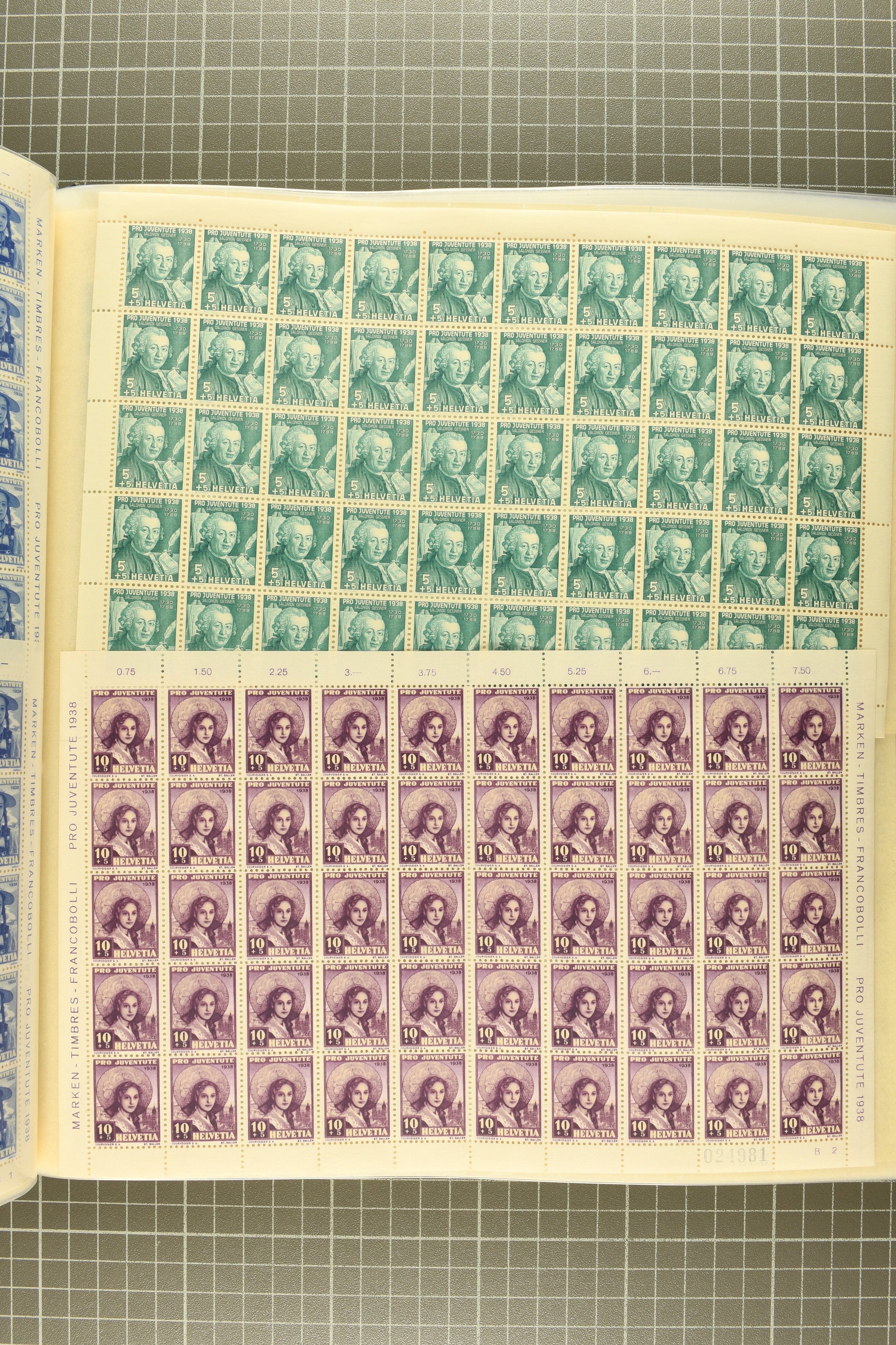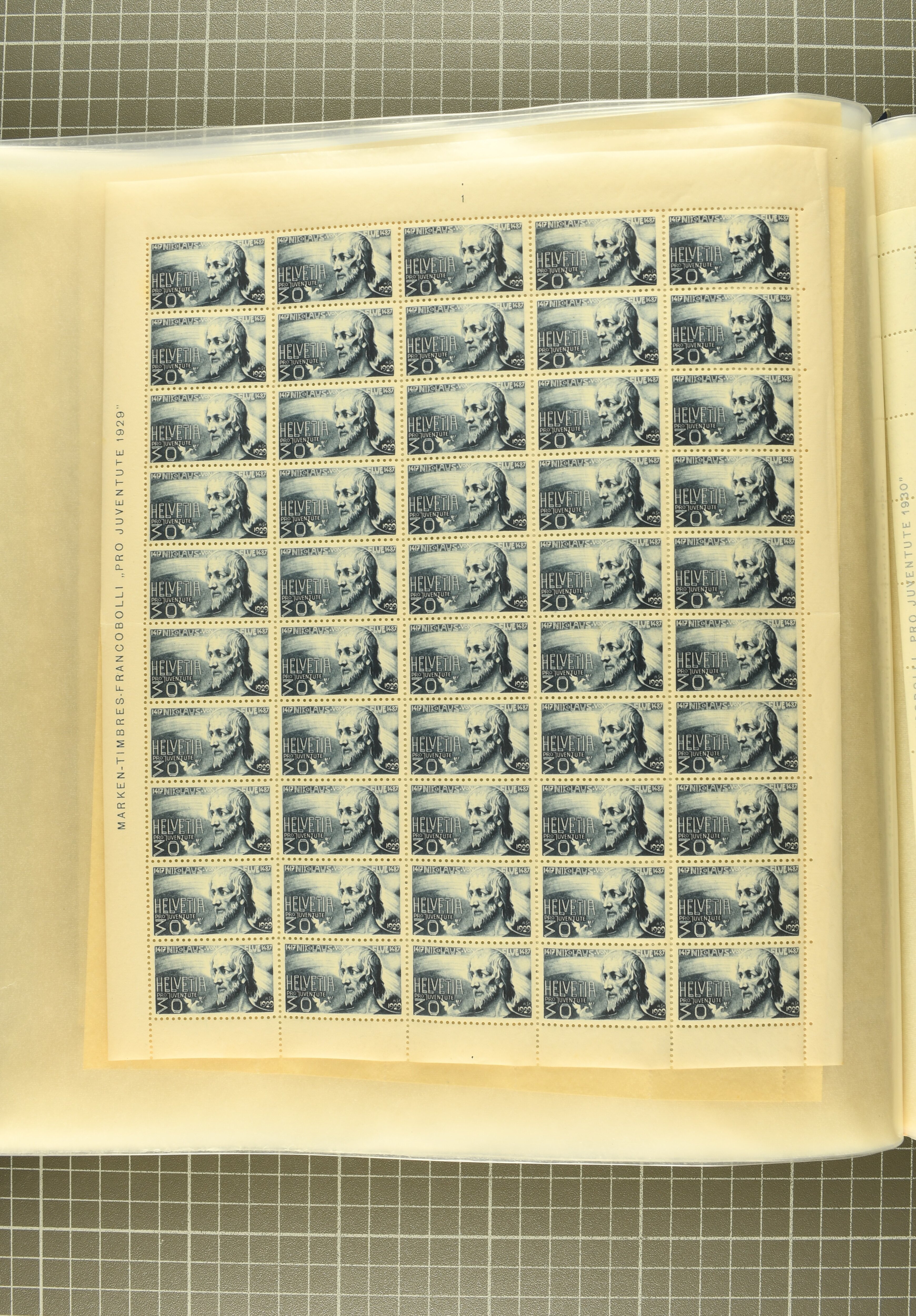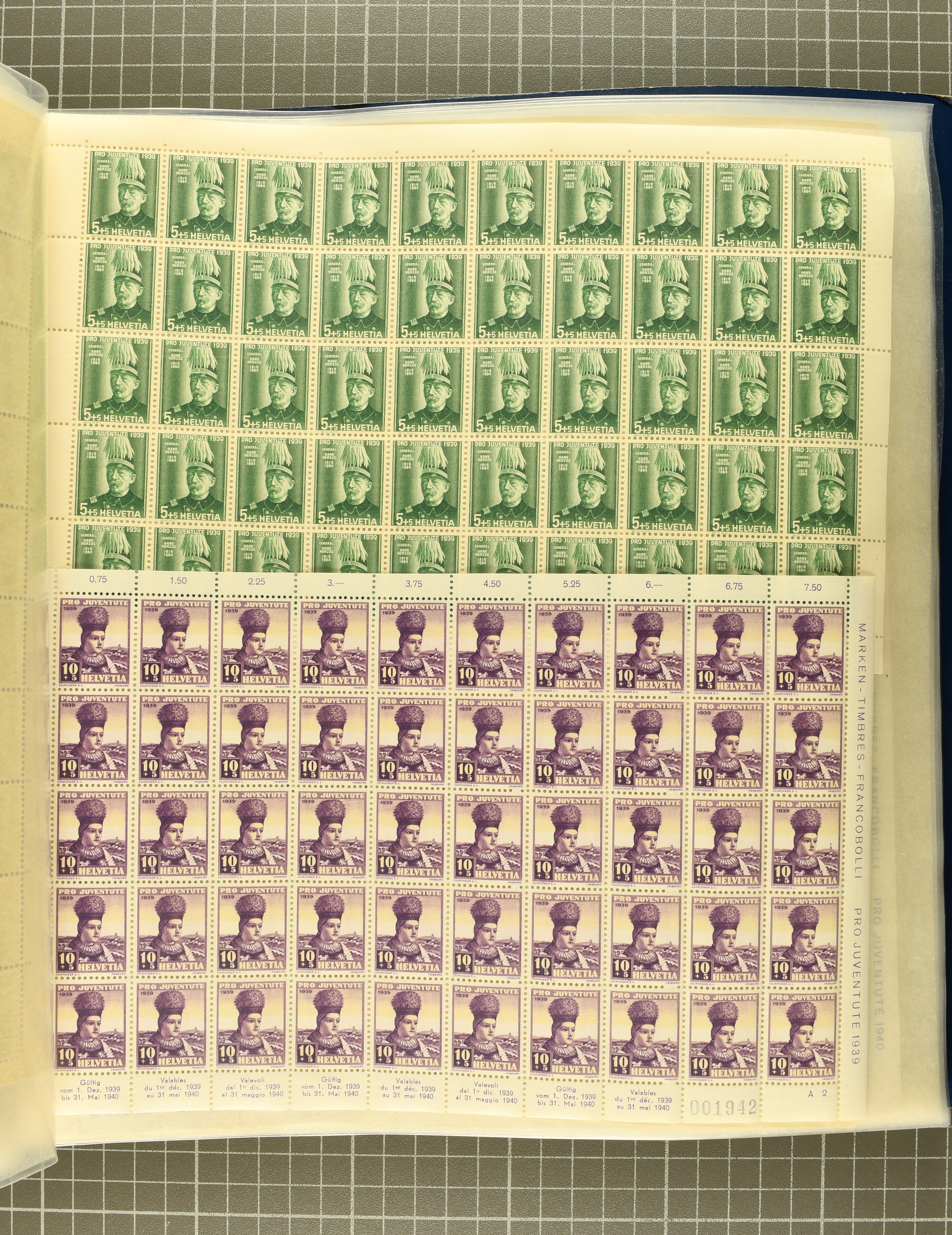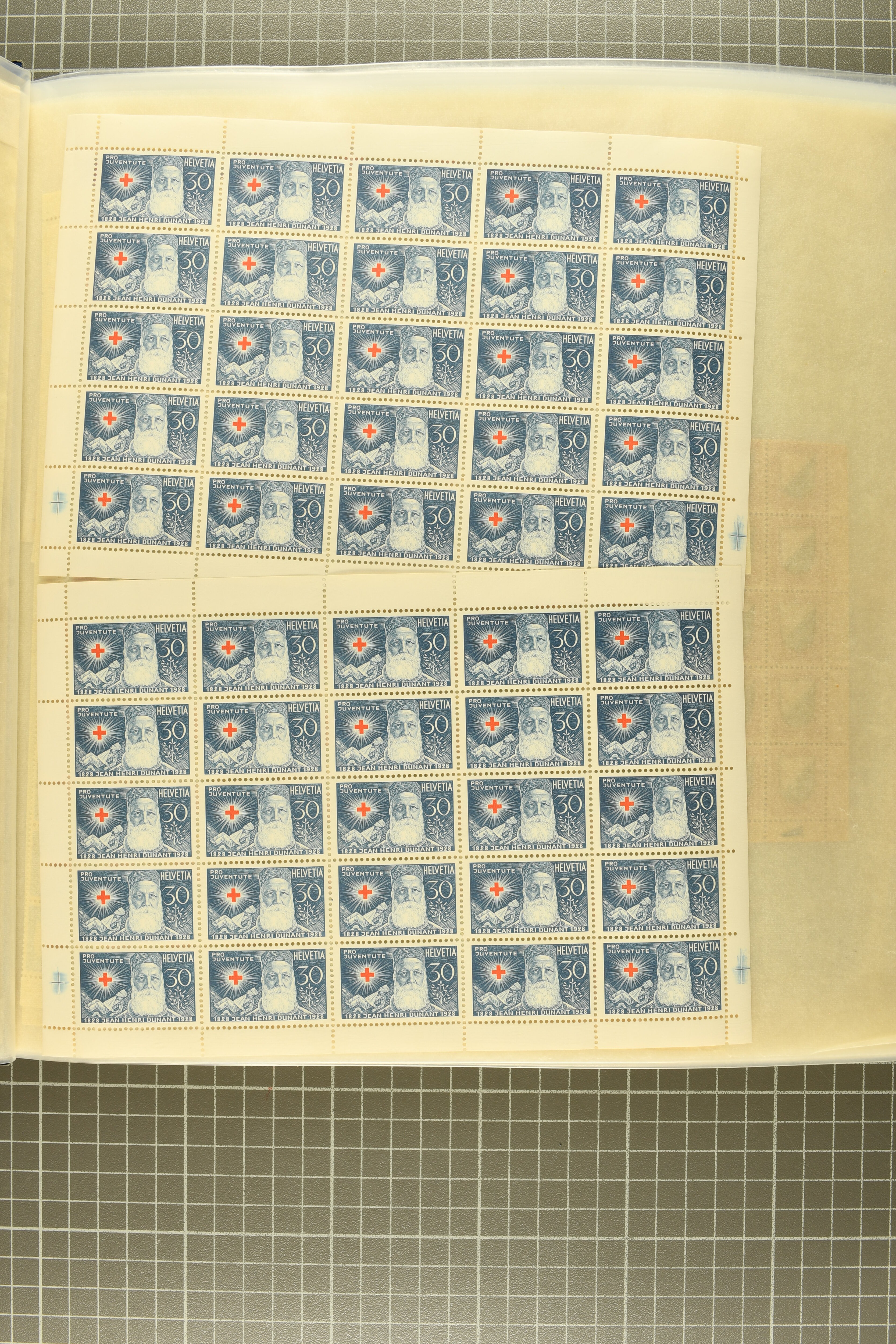 Blockausschnitten 1941 zusammen klar entw. am Ersttag mit Halbmondstempel "SCHWEIZ. POSTMUSEUM 1.XII.41", je einem postfrischen und einem schön gestempelten Kehrdruckbogen 1953 und 1954 5 Rp. "Jeremias Gotthelf" mit Doppelprägung (SBK J153DP) postfr.