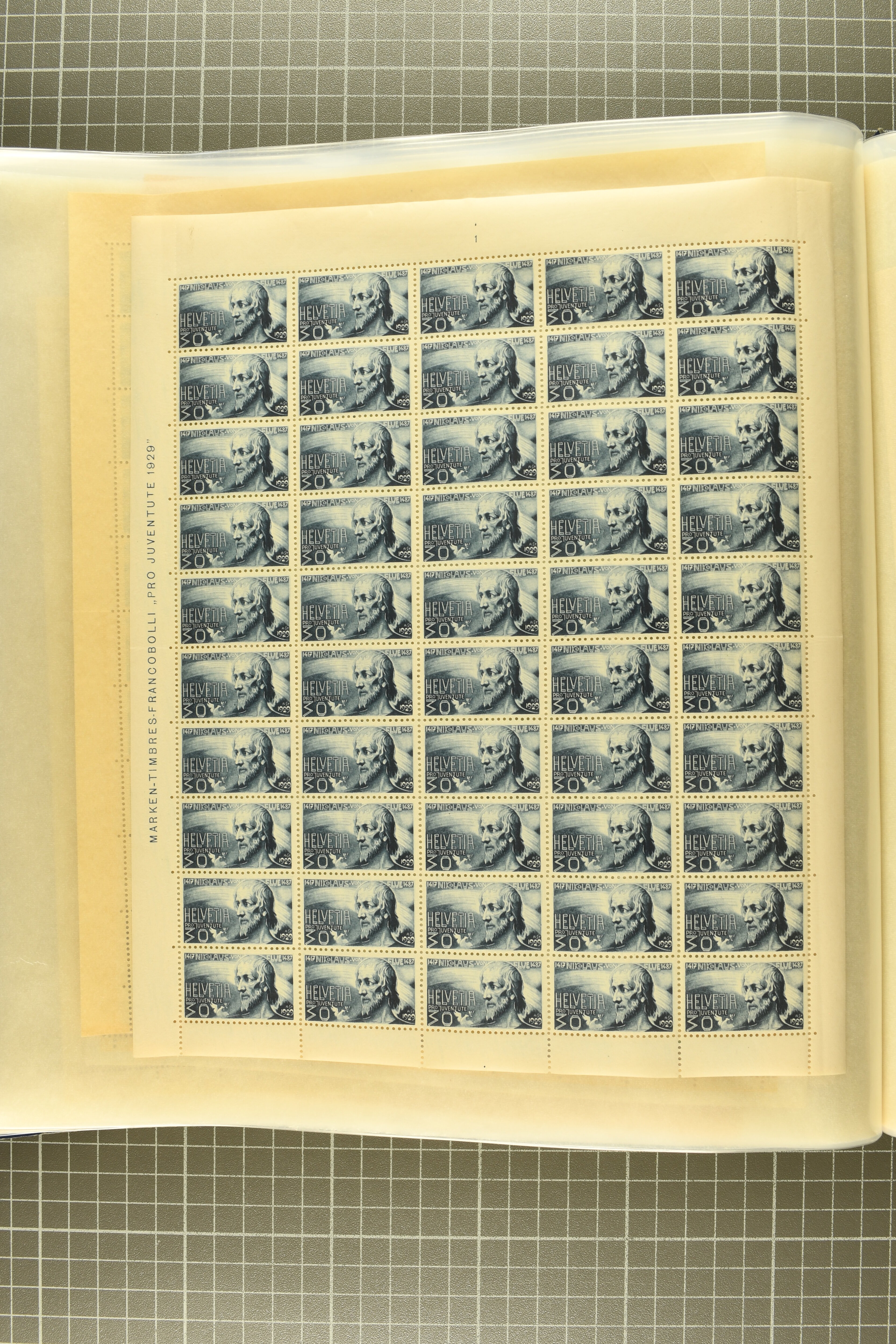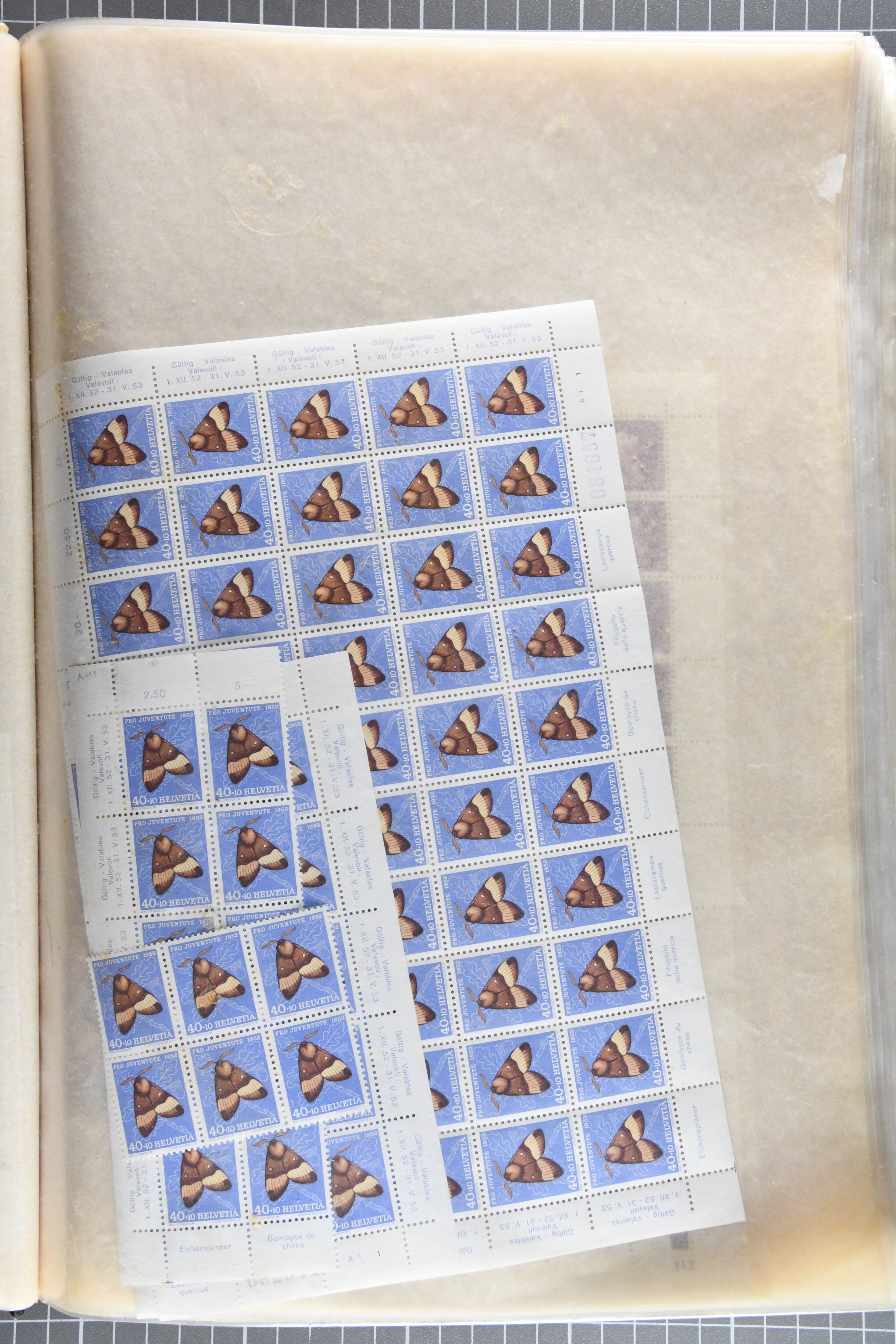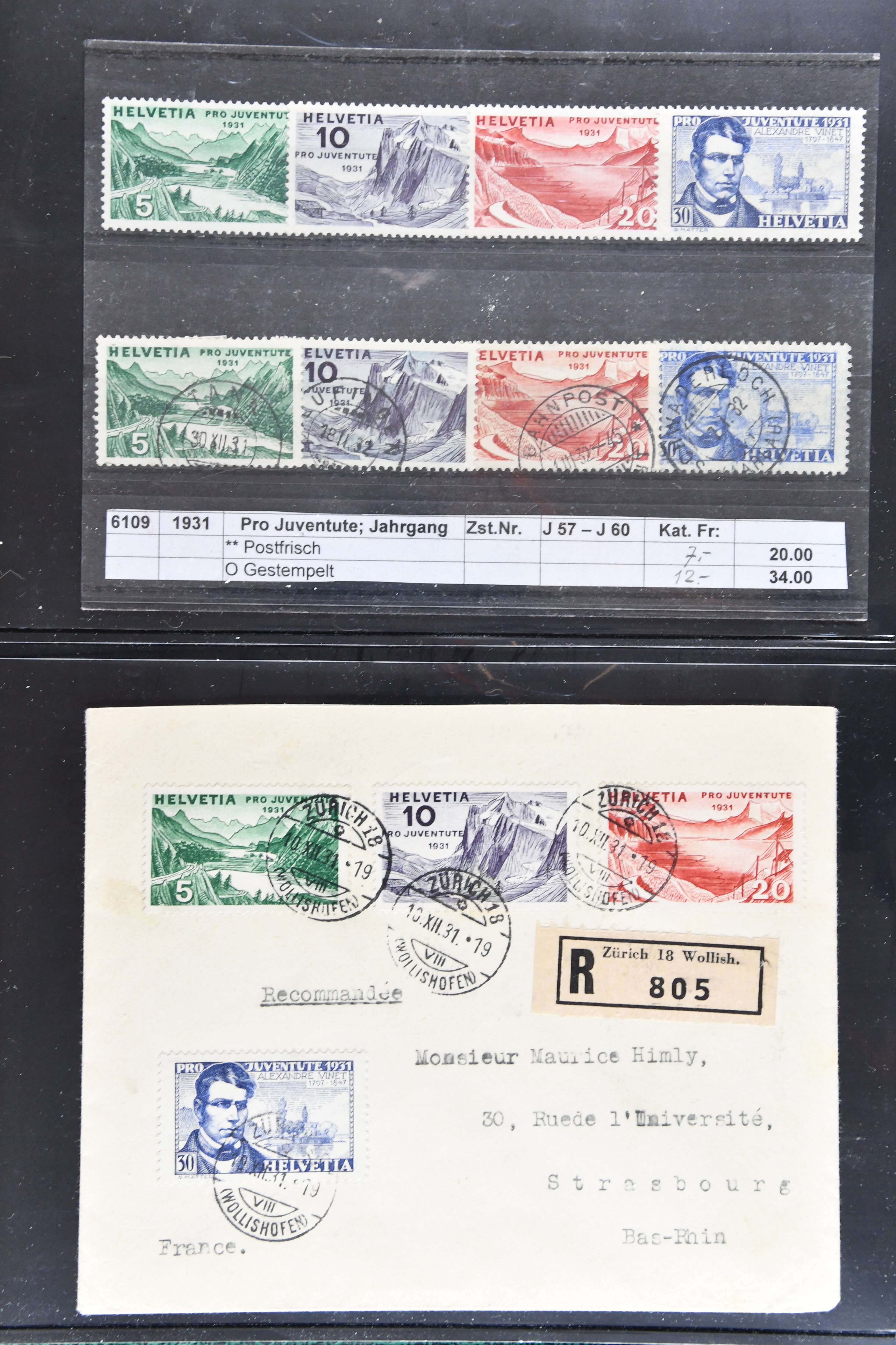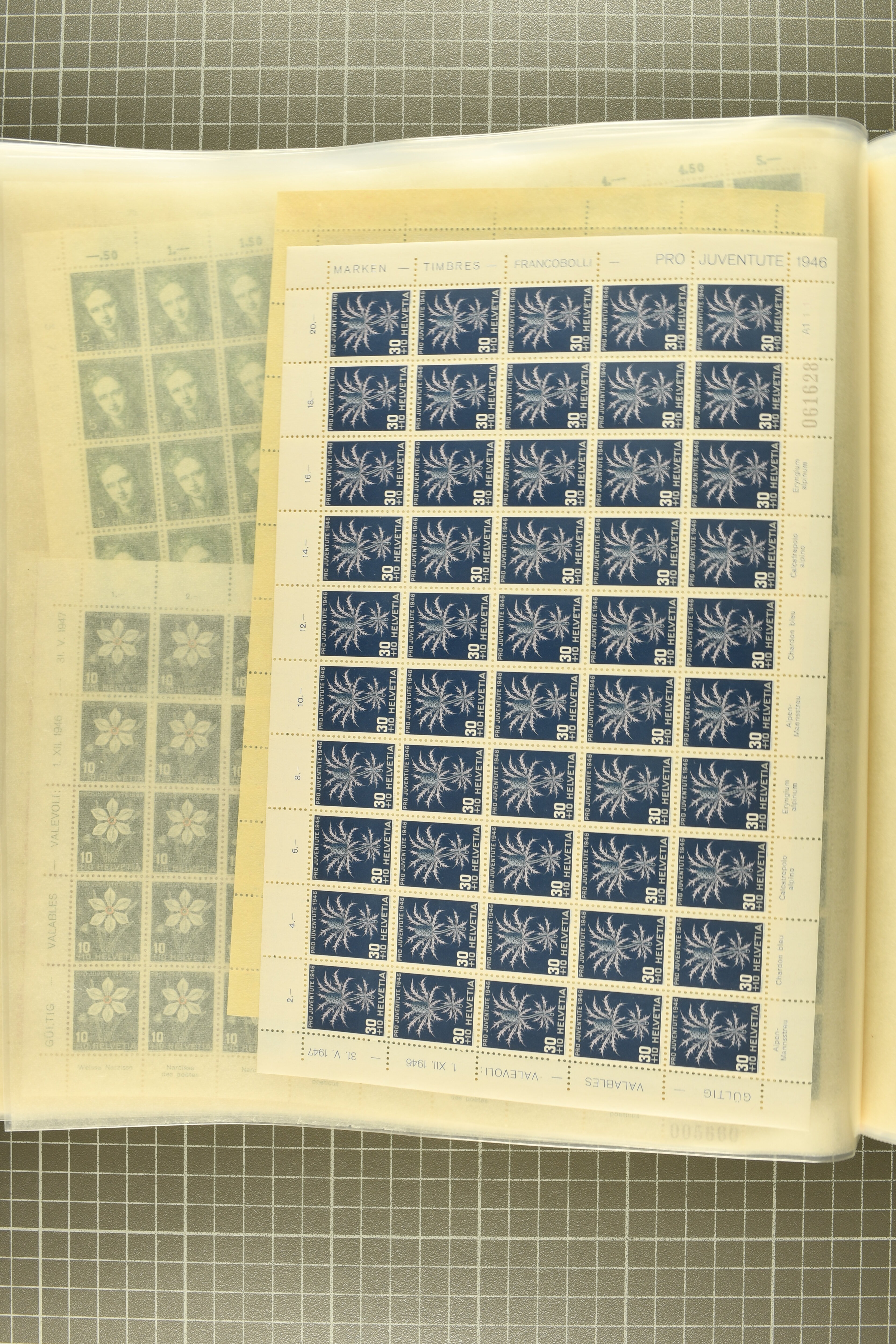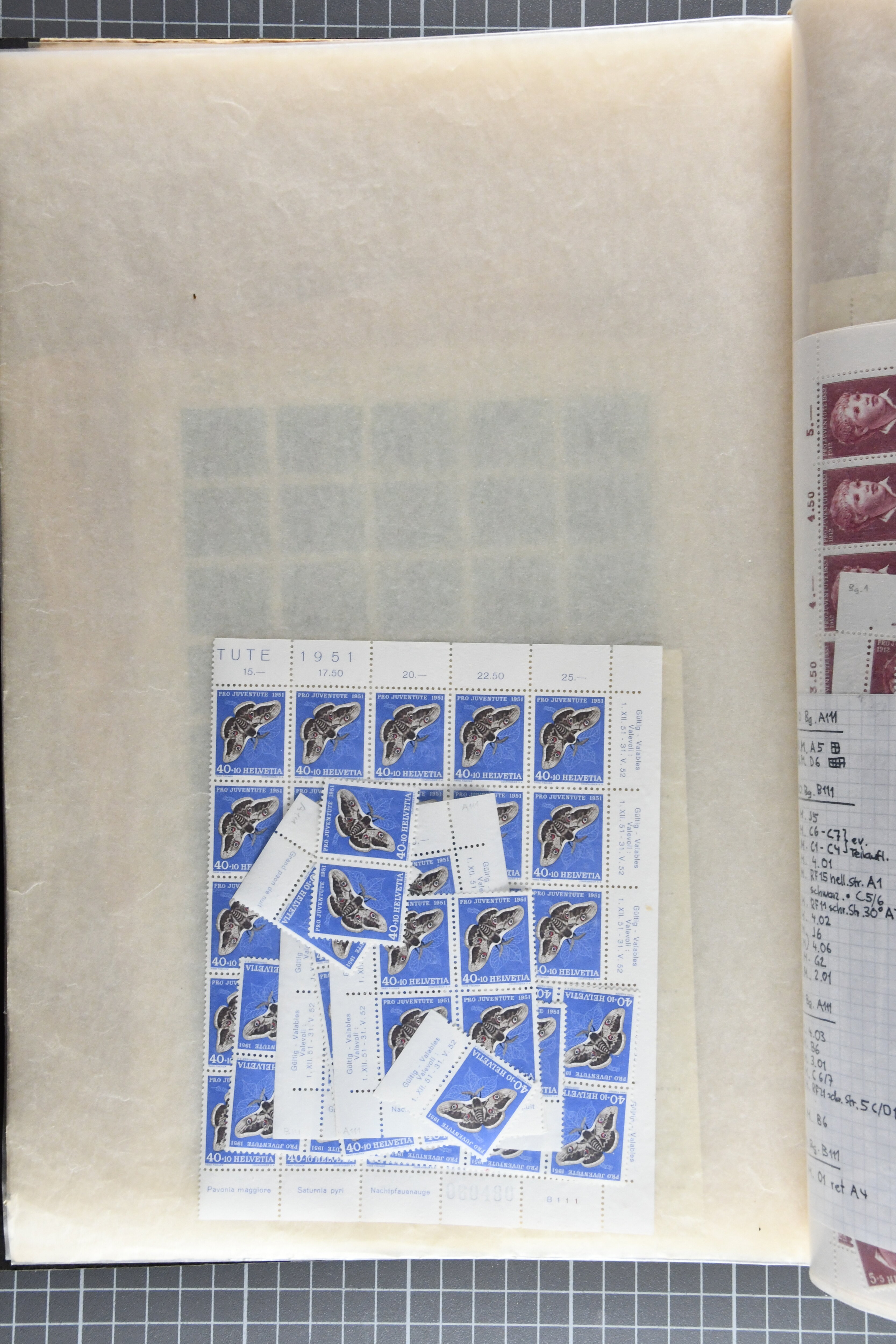 Blockausschnitten 1941 zusammen klar entw. am Ersttag mit Halbmondstempel "SCHWEIZ. POSTMUSEUM 1.XII.41", je einem postfrischen und einem schön gestempelten Kehrdruckbogen 1953 und 1954 5 Rp. "Jeremias Gotthelf" mit Doppelprägung (SBK J153DP) postfr.