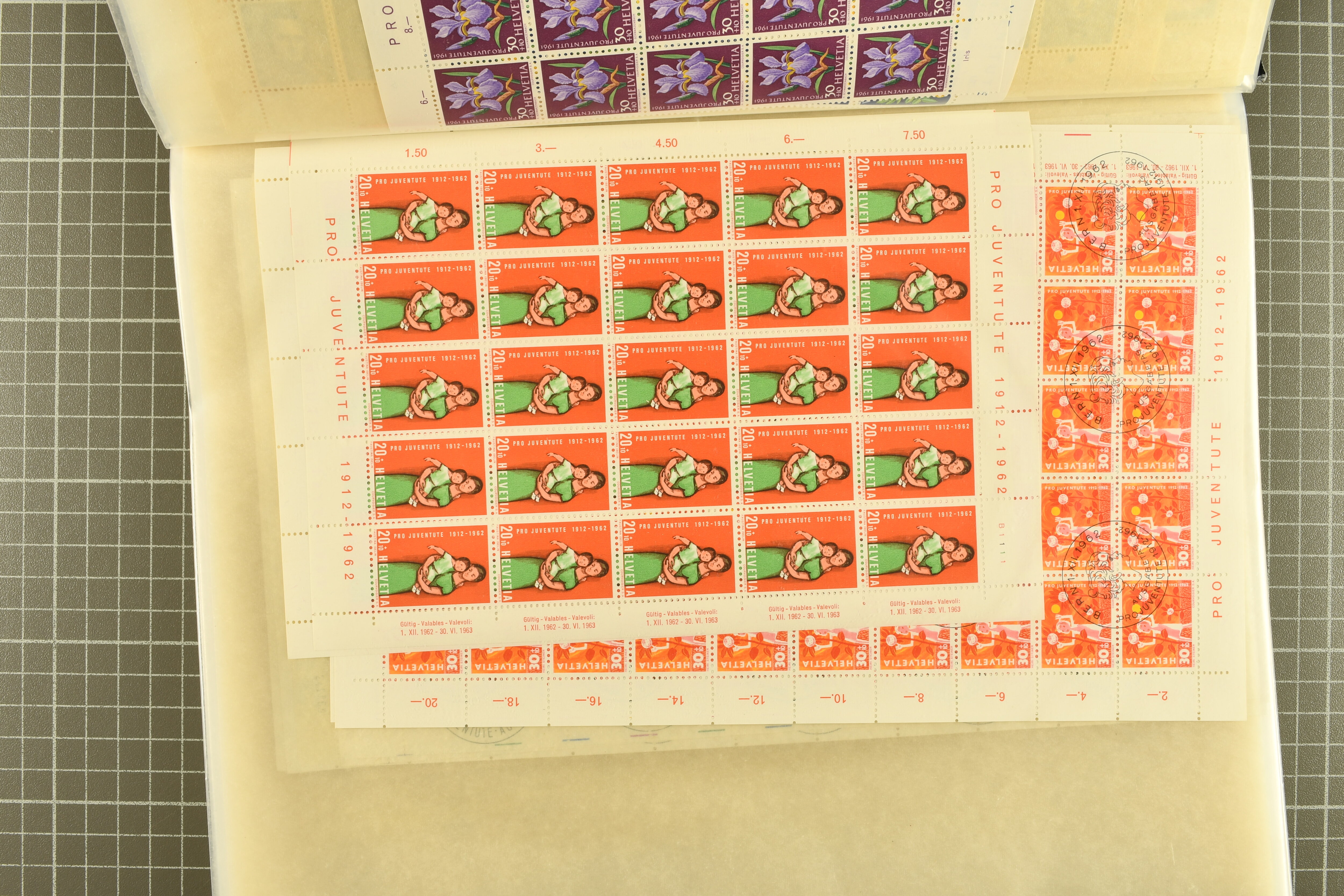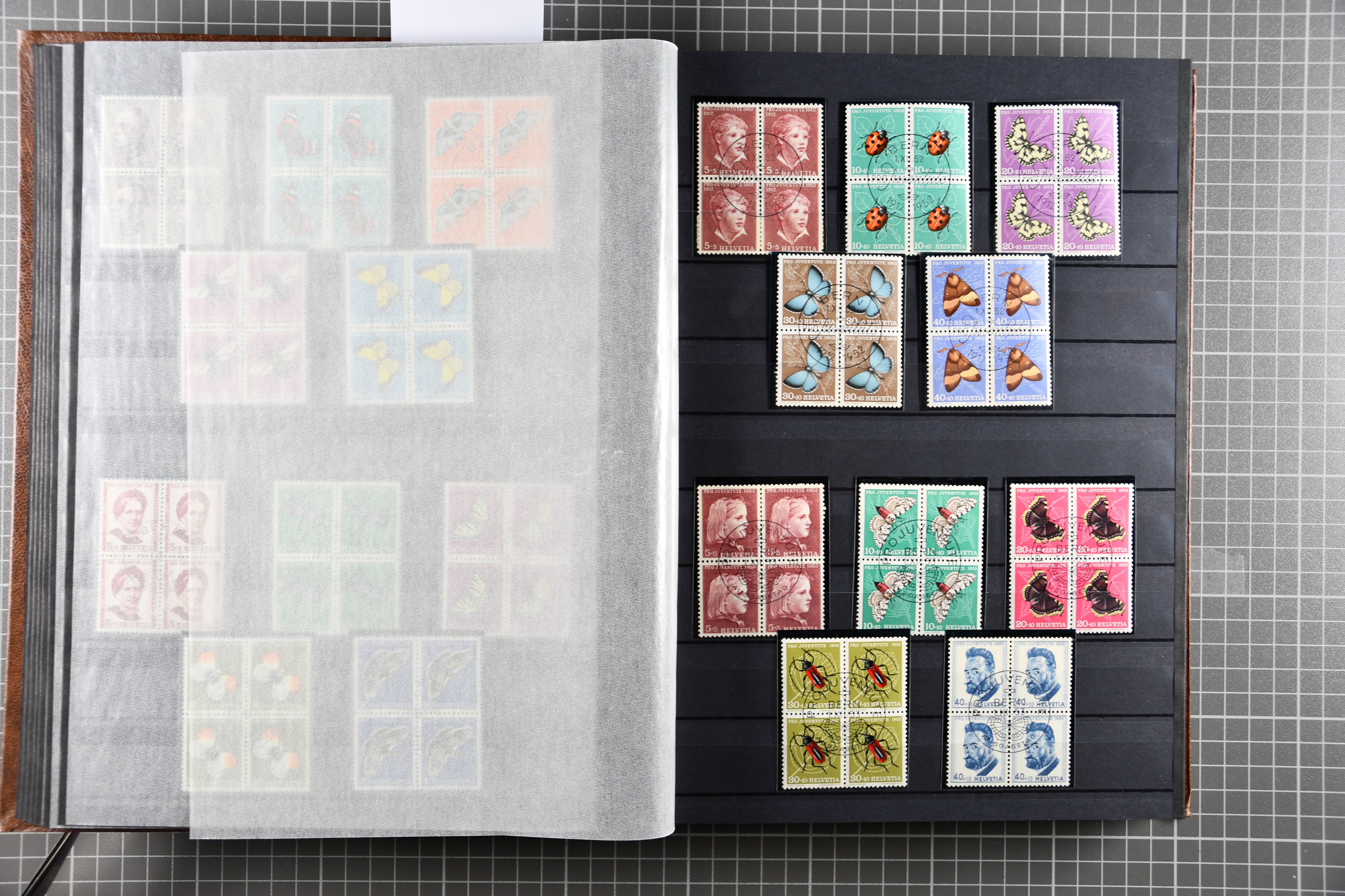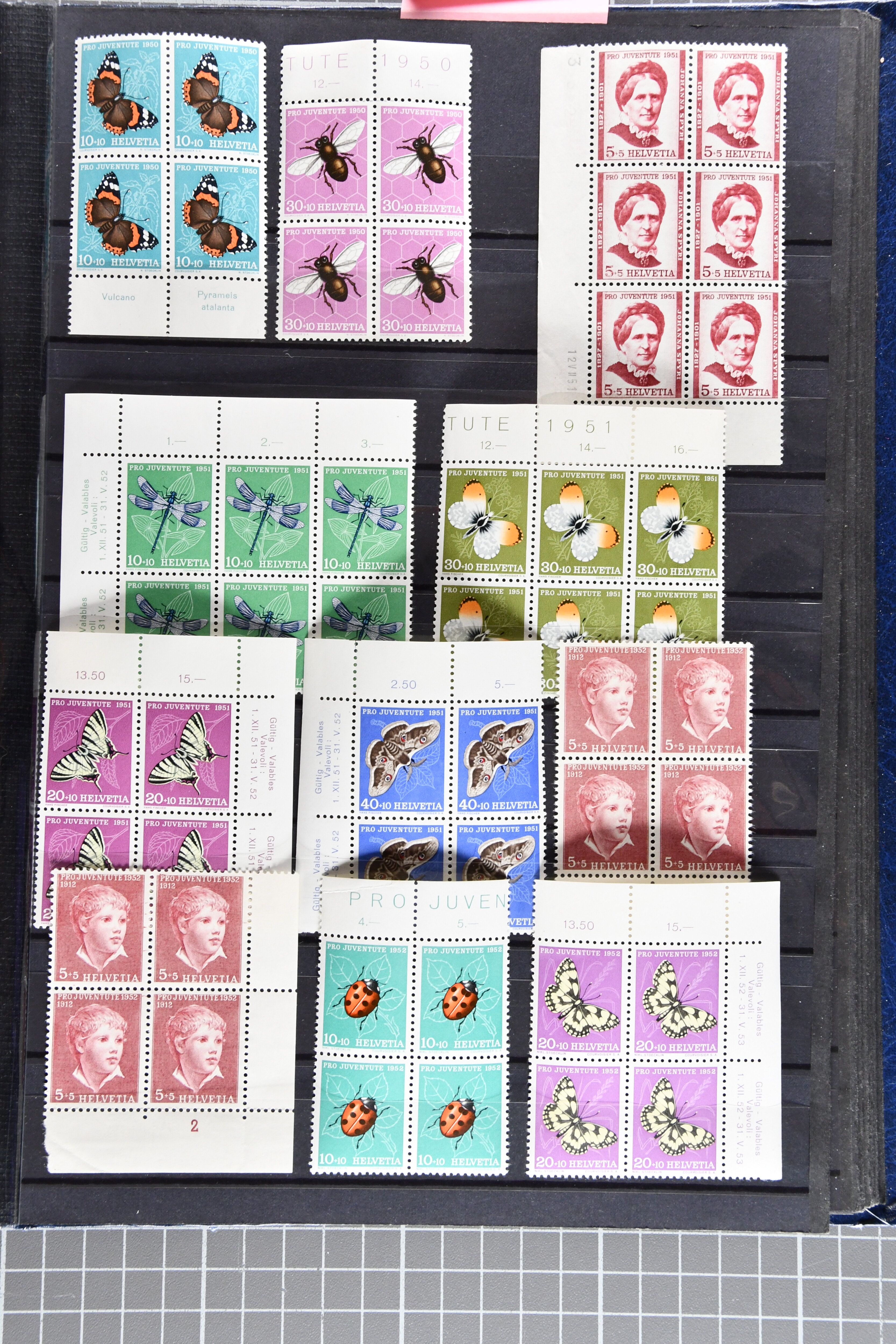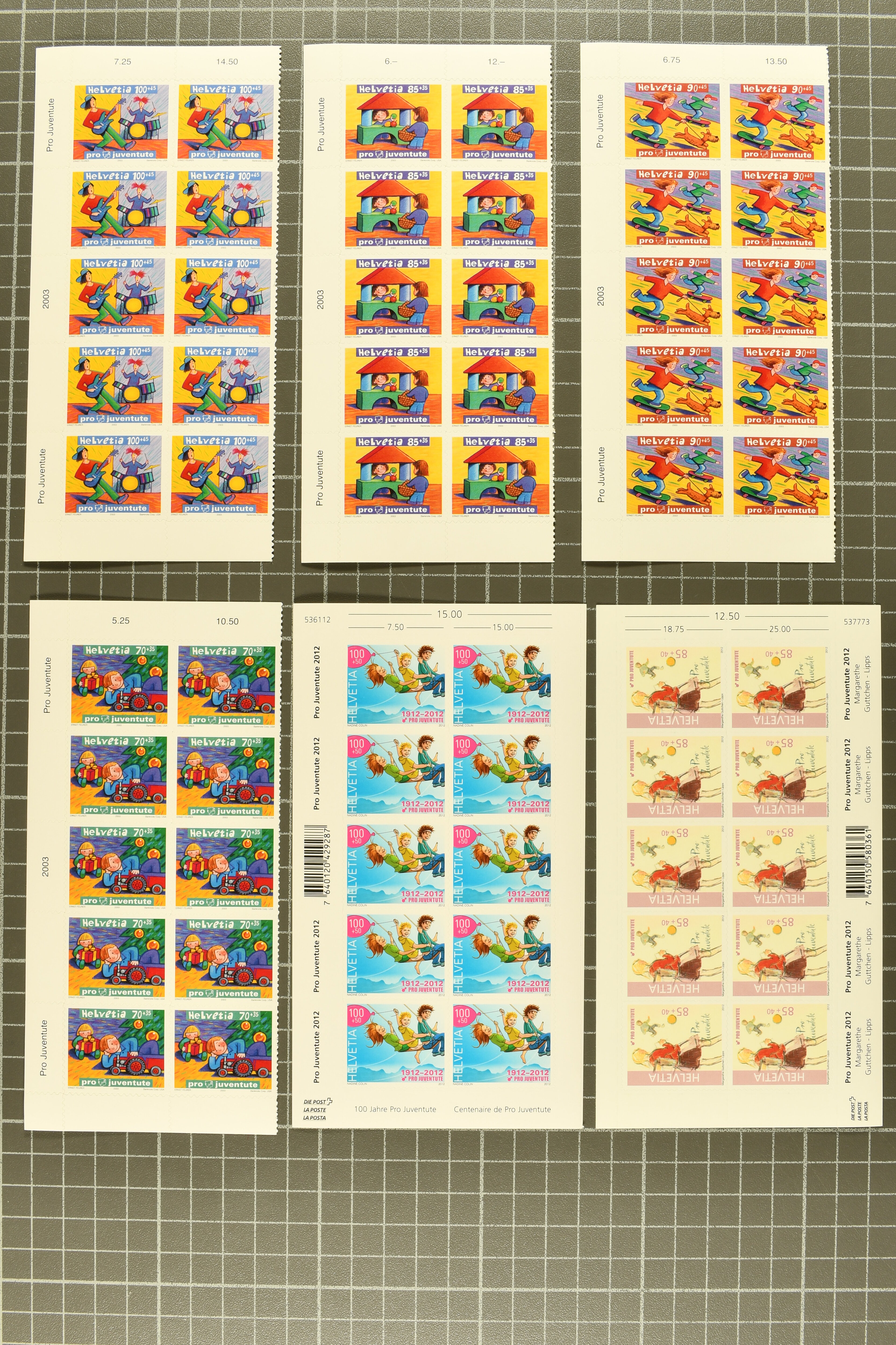 1912-2016: Bestand Pro Juventute in 6 Alben: Ein Album enthält überwiegend postfrisches Material in grösseren Blocks bzw. Bogenteilen, dabei auch ein gestempelter Kehrdruckbogen 1953, Marken ab 1964 sind