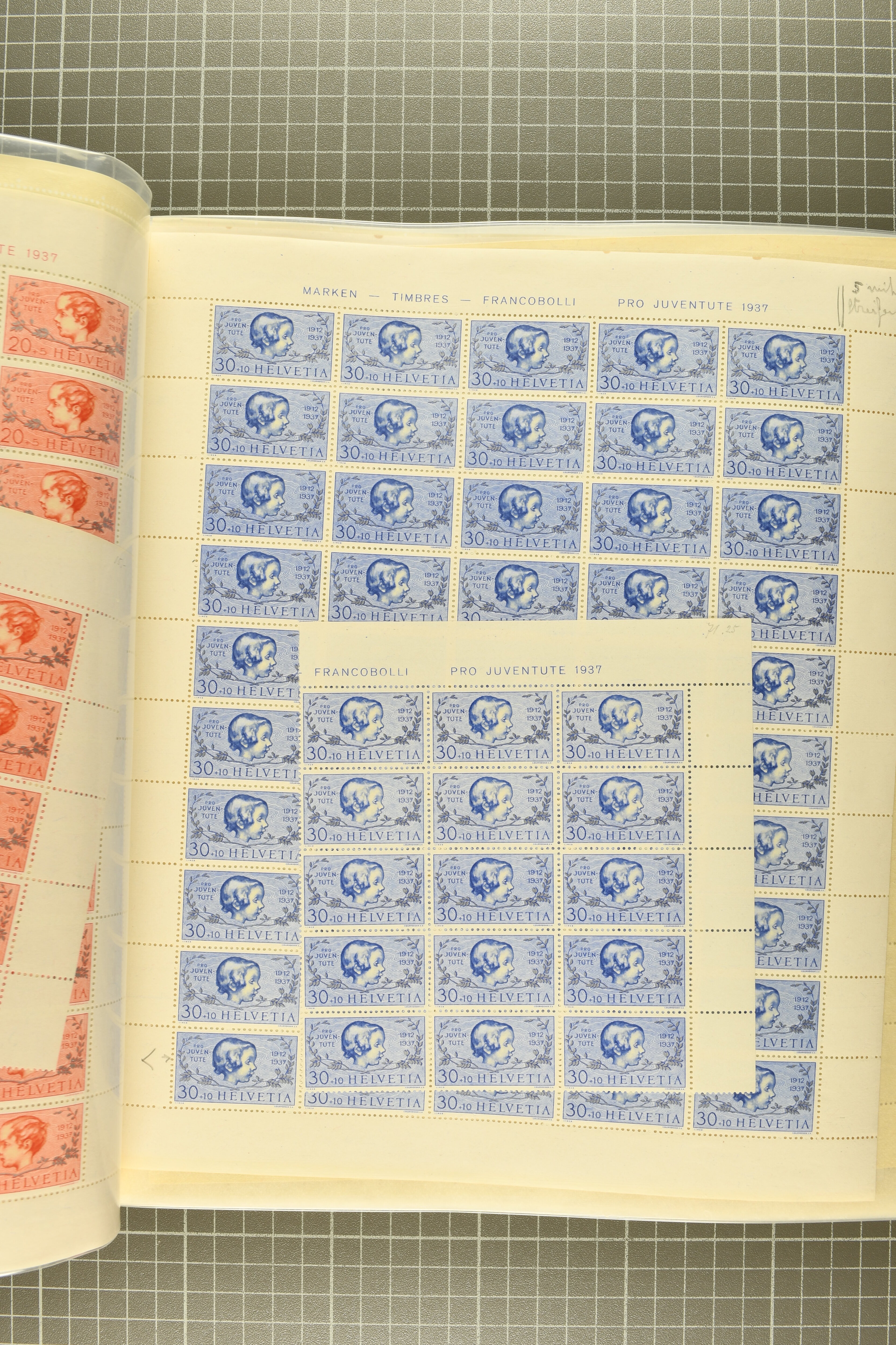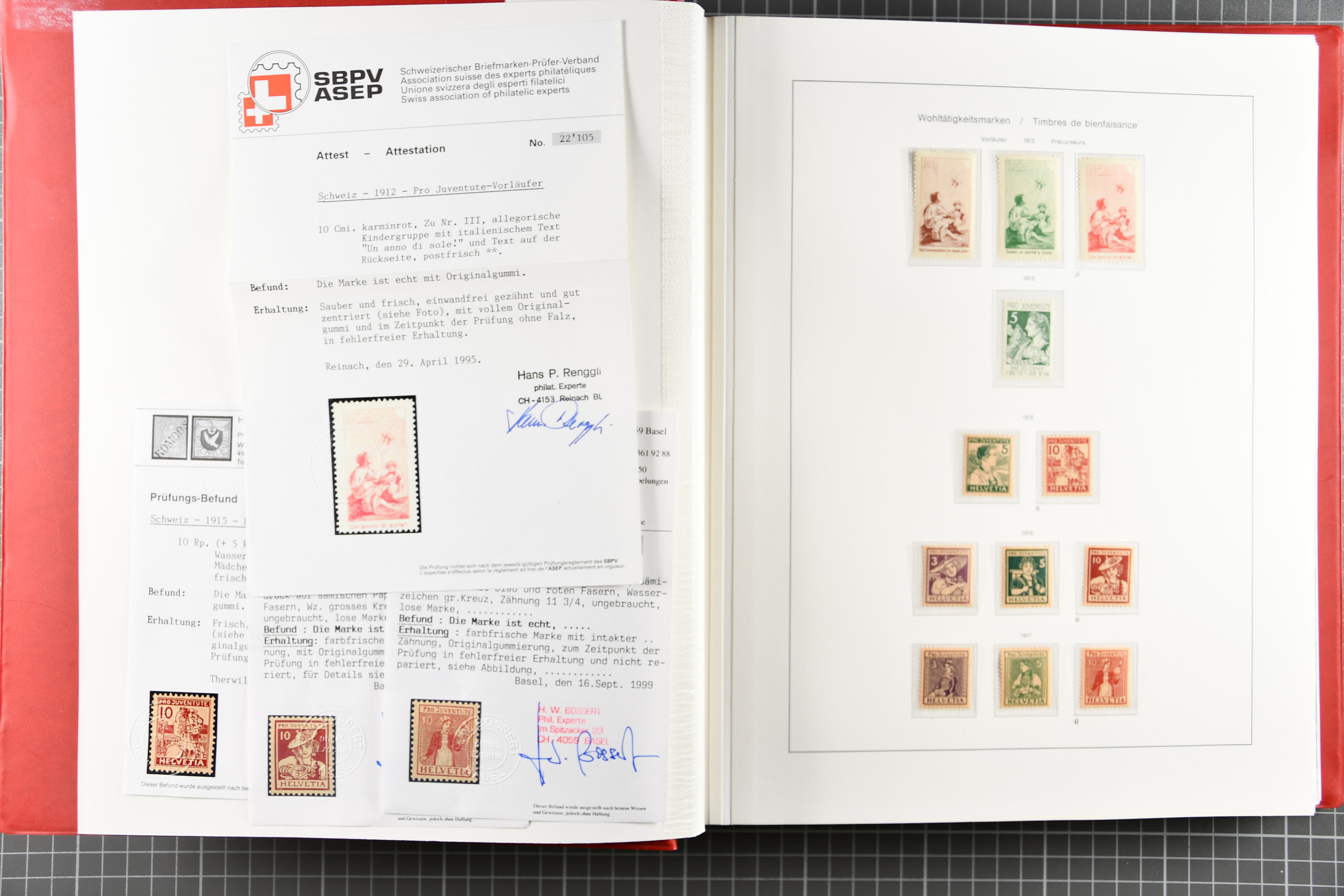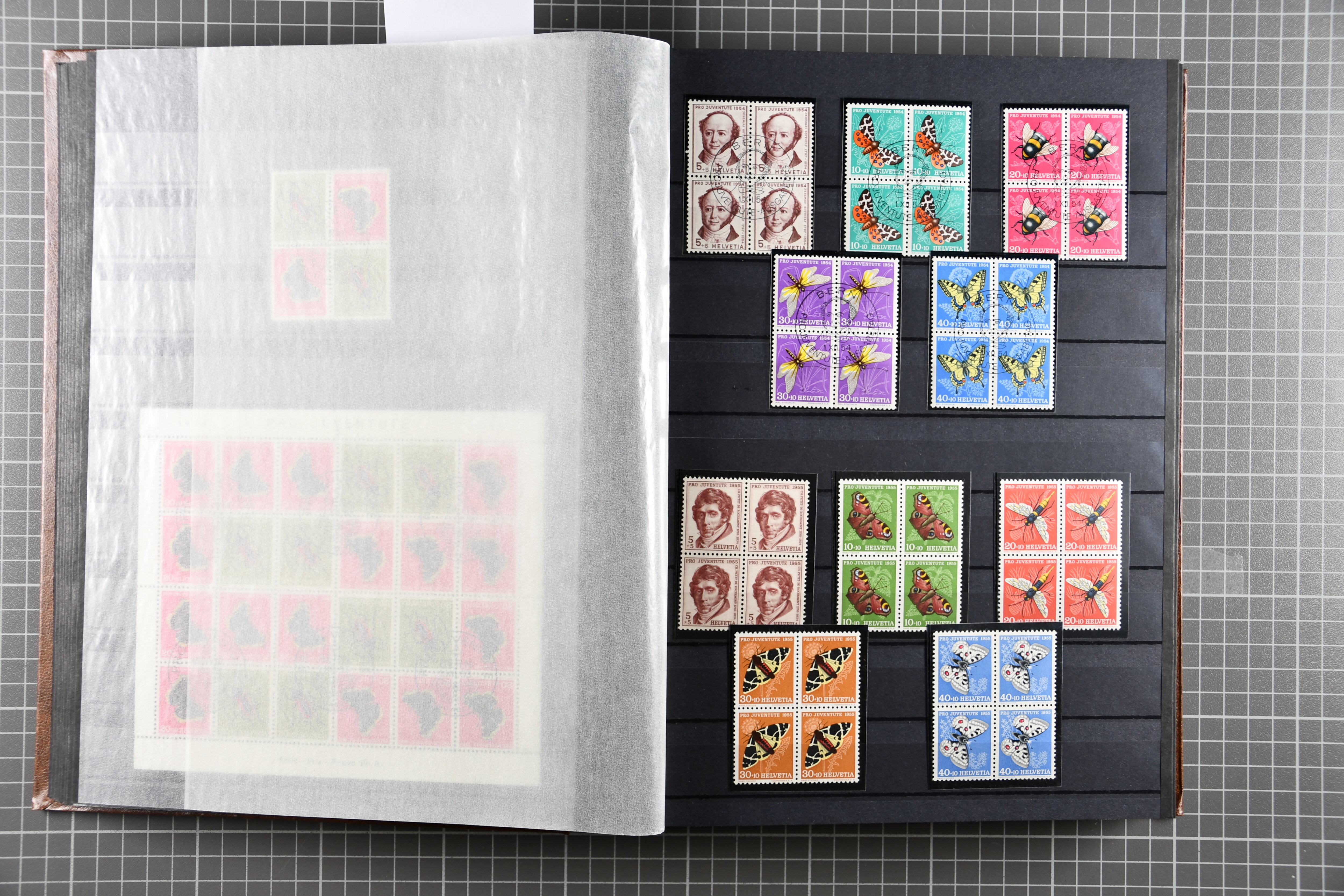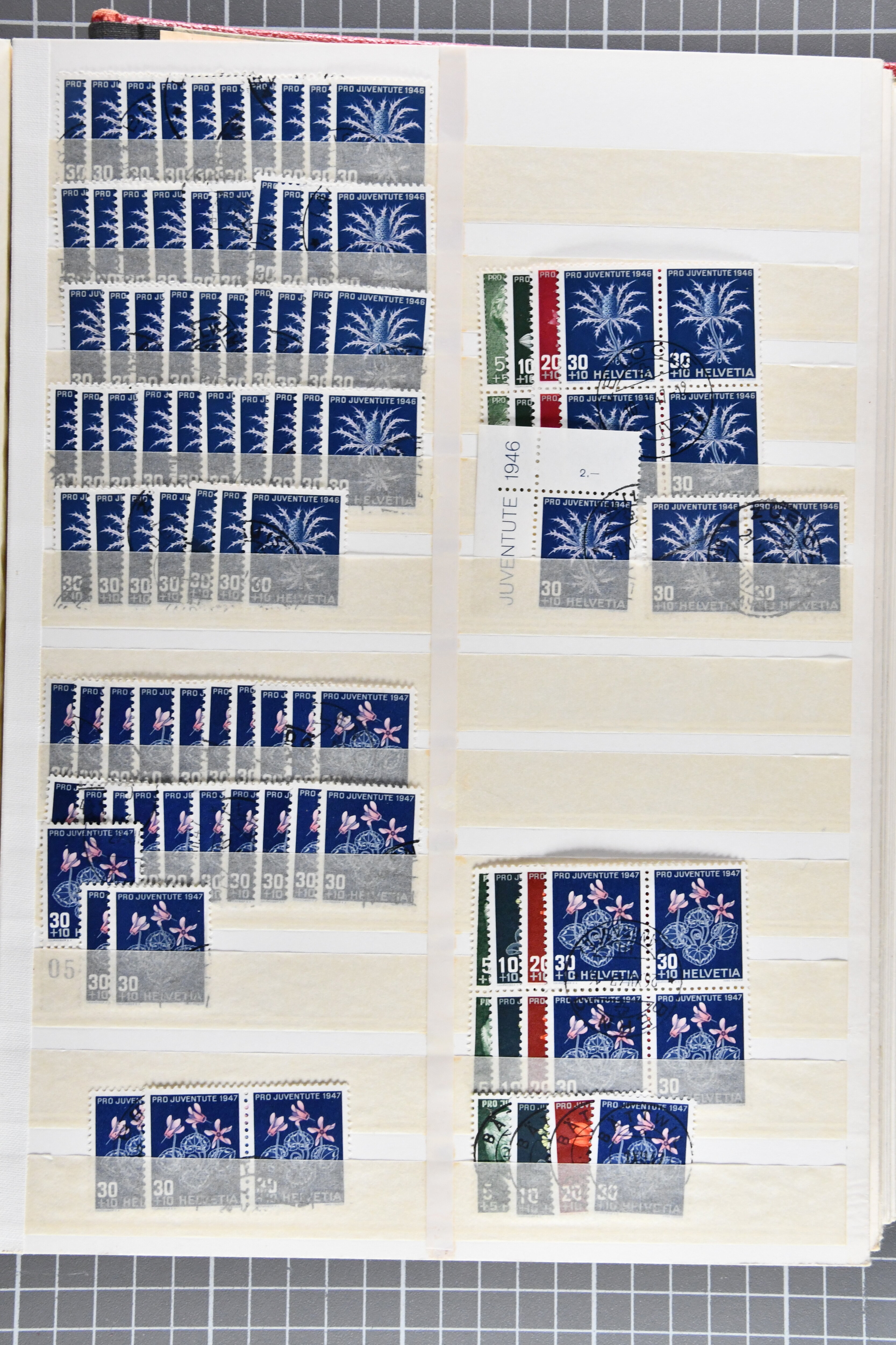 1912-2016: Bestand Pro Juventute in 6 Alben: Ein Album enthält überwiegend postfrisches Material in grösseren Blocks bzw. Bogenteilen, dabei auch ein gestempelter Kehrdruckbogen 1953, Marken ab 1964 sind