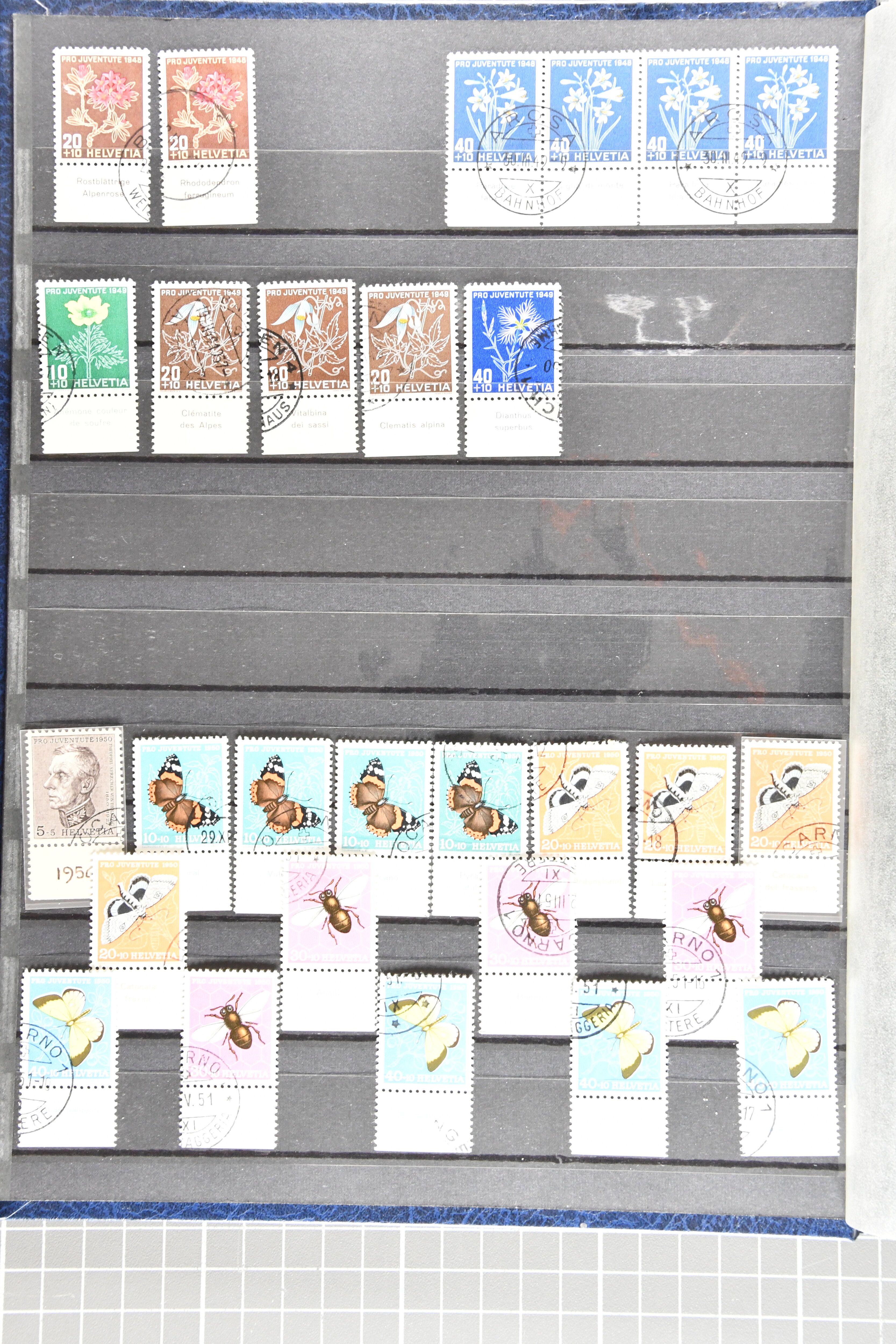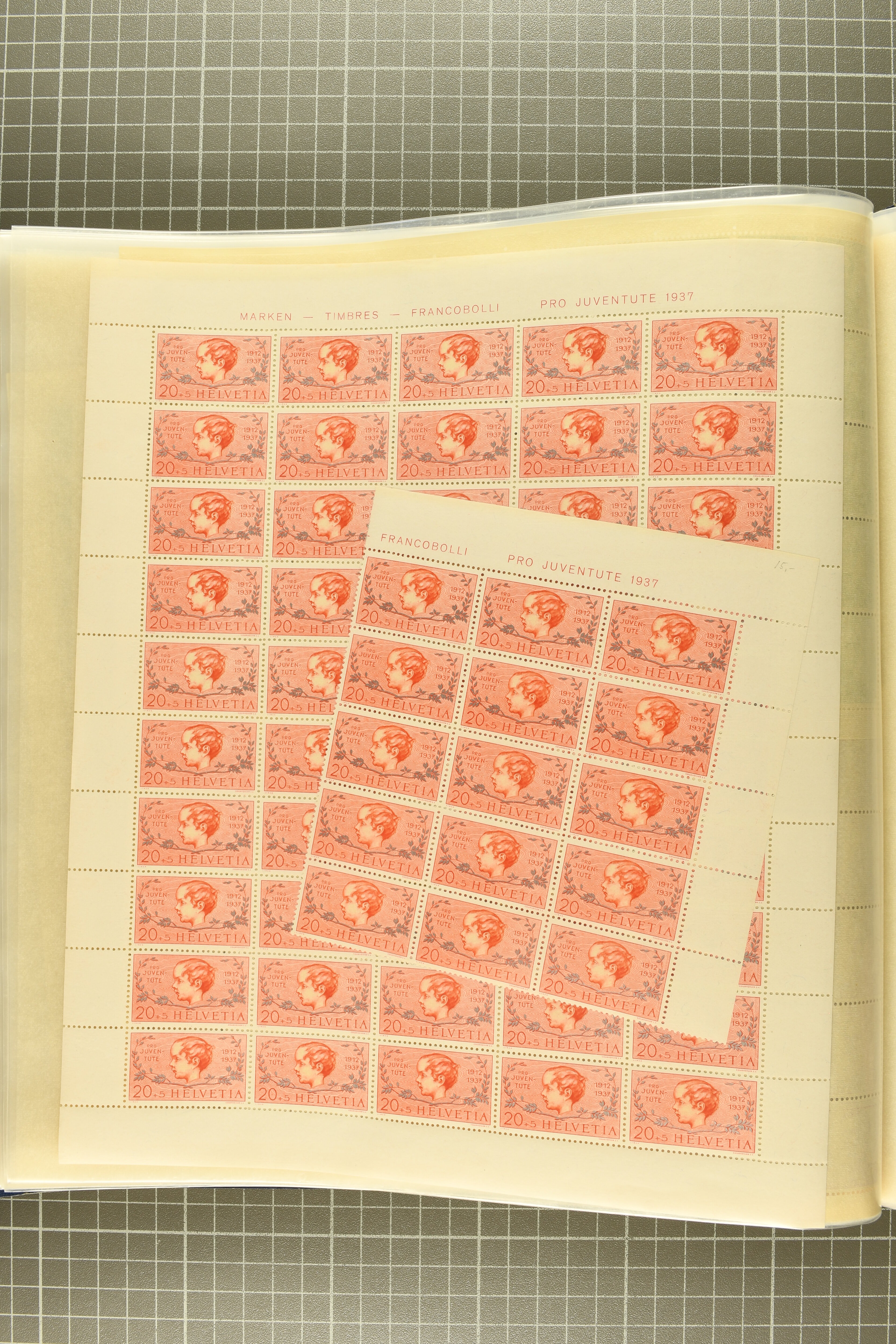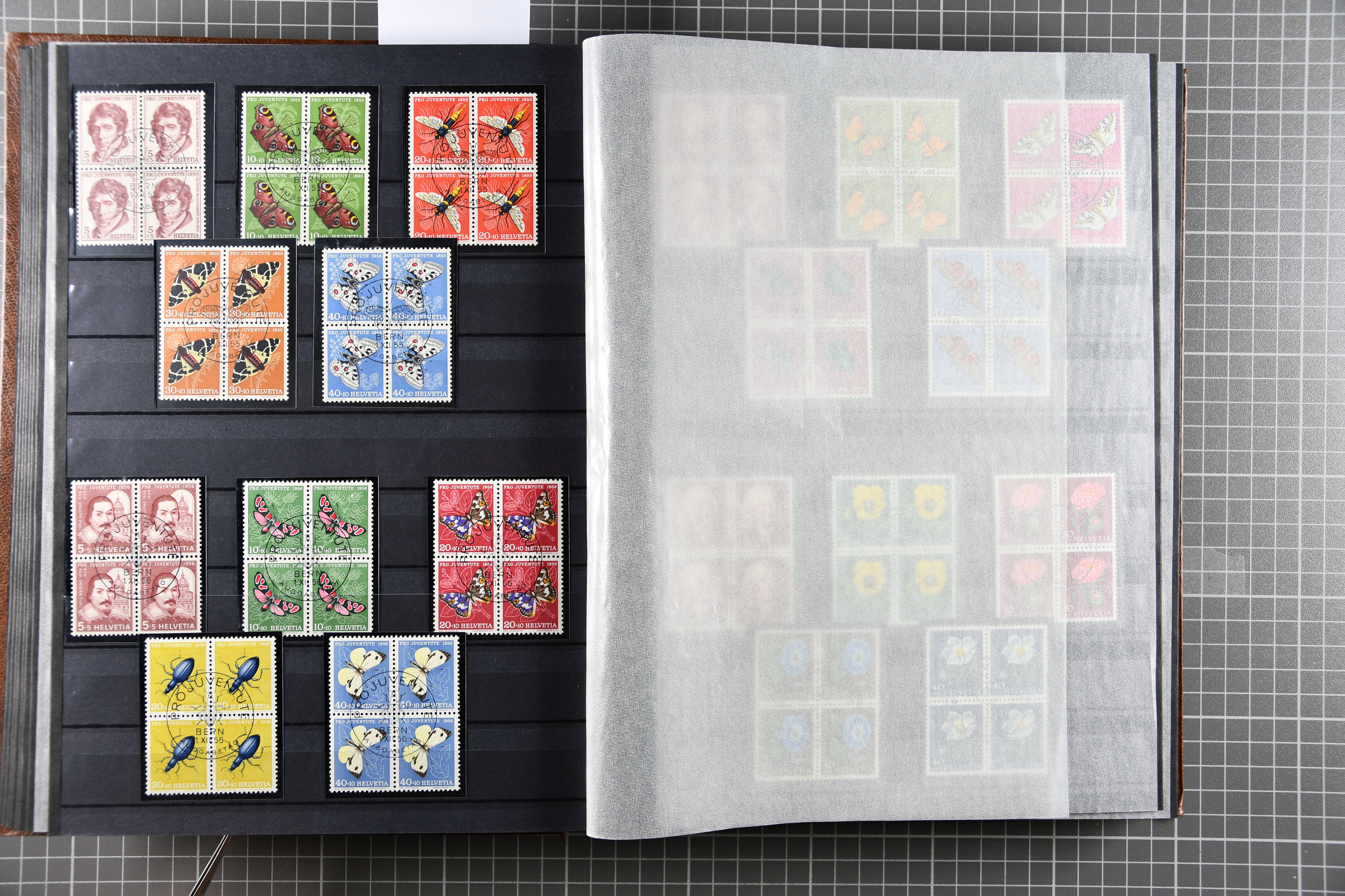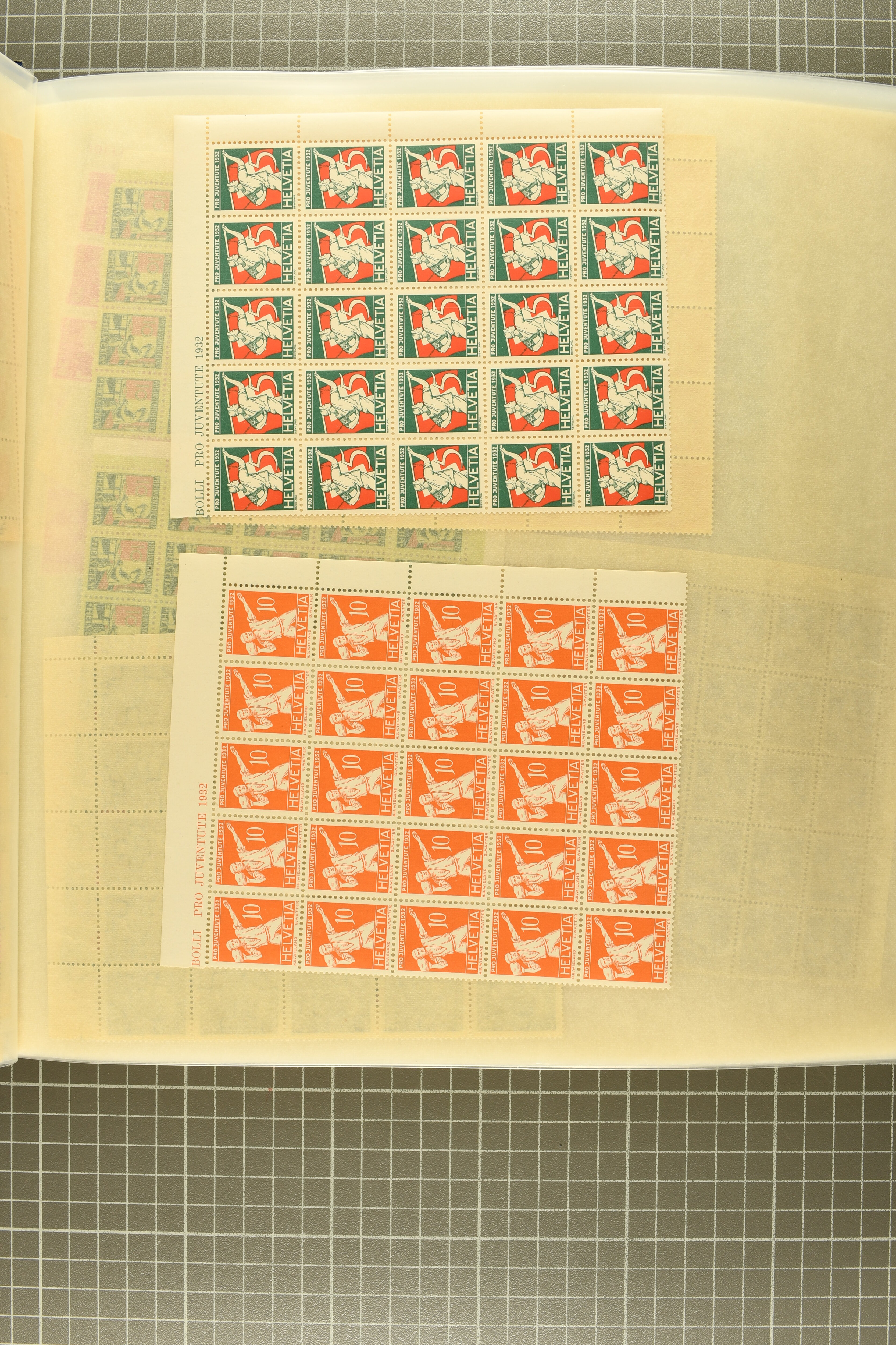 1912-2016: Bestand Pro Juventute in 6 Alben: Ein Album enthält überwiegend postfrisches Material in grösseren Blocks bzw. Bogenteilen, dabei auch ein gestempelter Kehrdruckbogen 1953, Marken ab 1964 sind