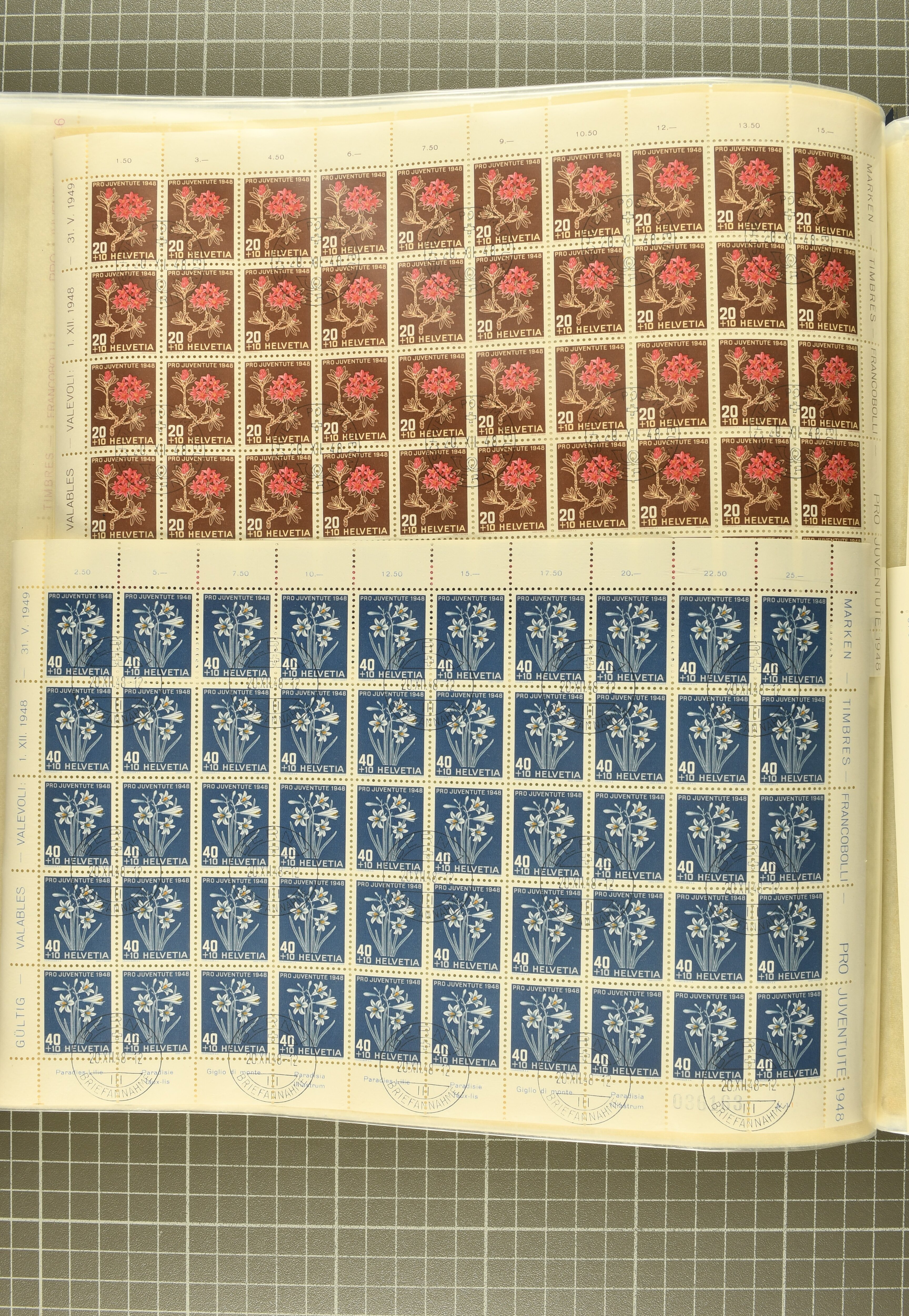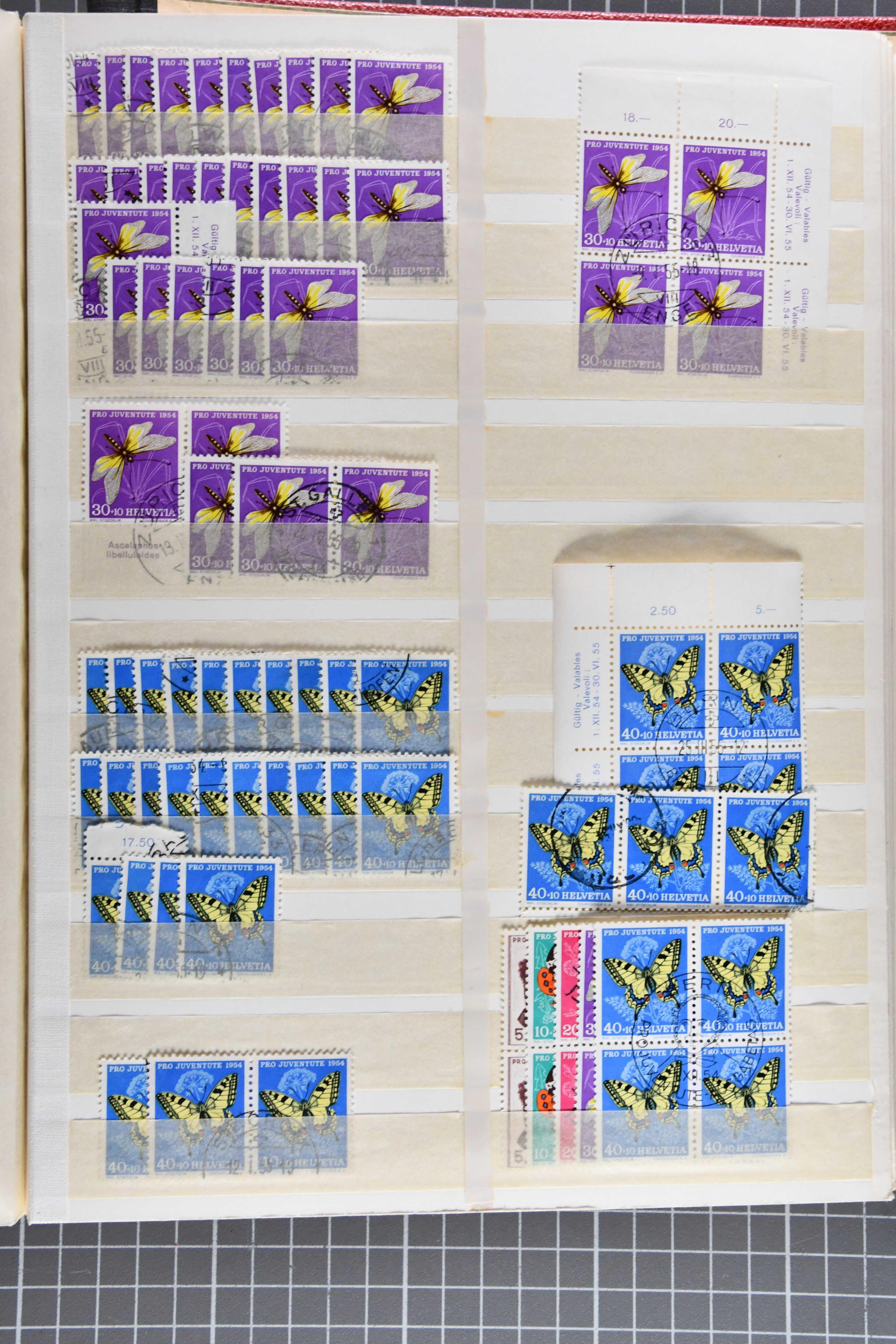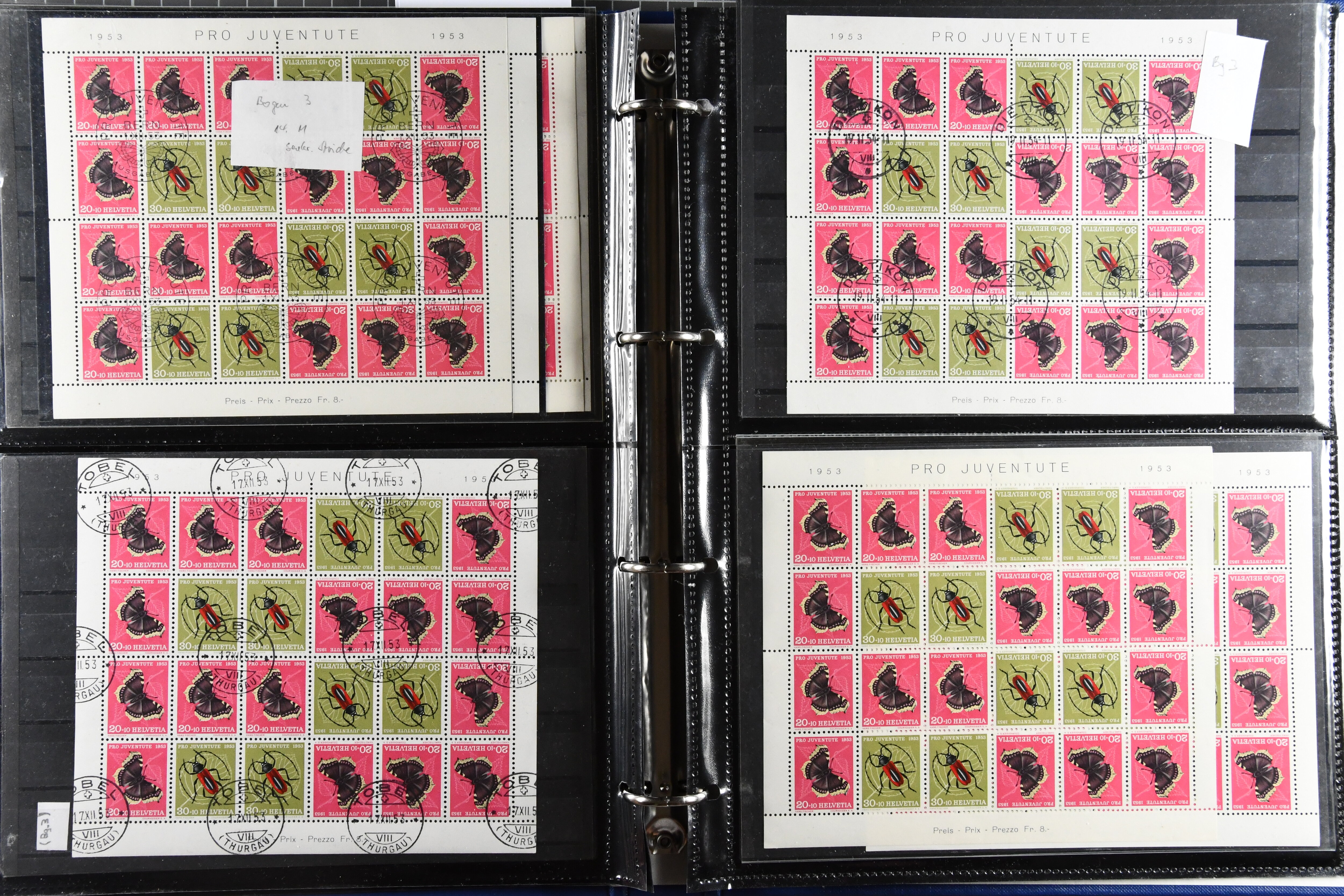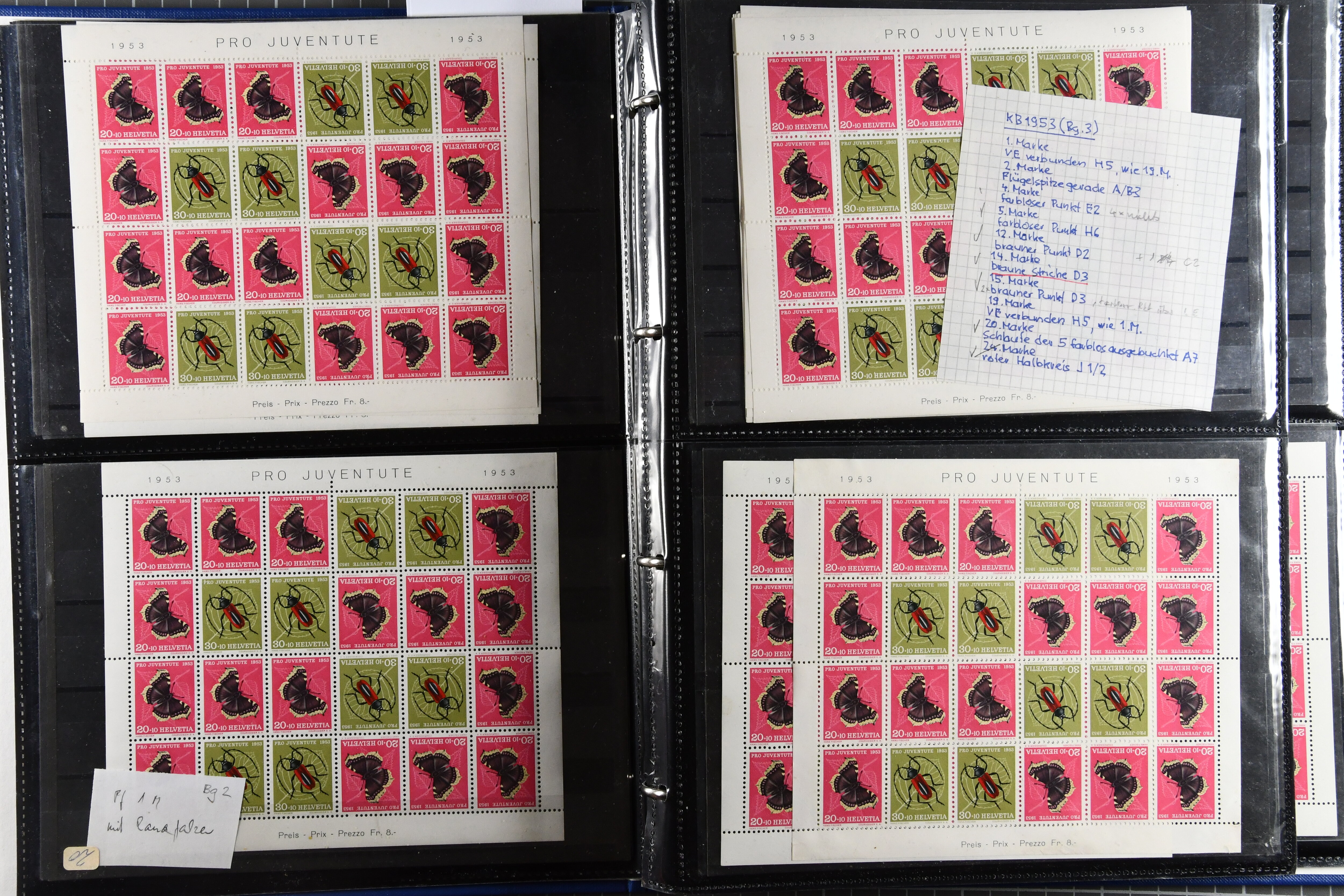 1953: Bestand Pro Juventute Kehrdruckbogen 1953: 12 Stück gestempelt (davon 7x mit offiziellem Ersttagsstempel und Gummi) sowie 25 ungebraucht oder postfrisch. Unter den ungebrauchten befindet sich ein Exemplar