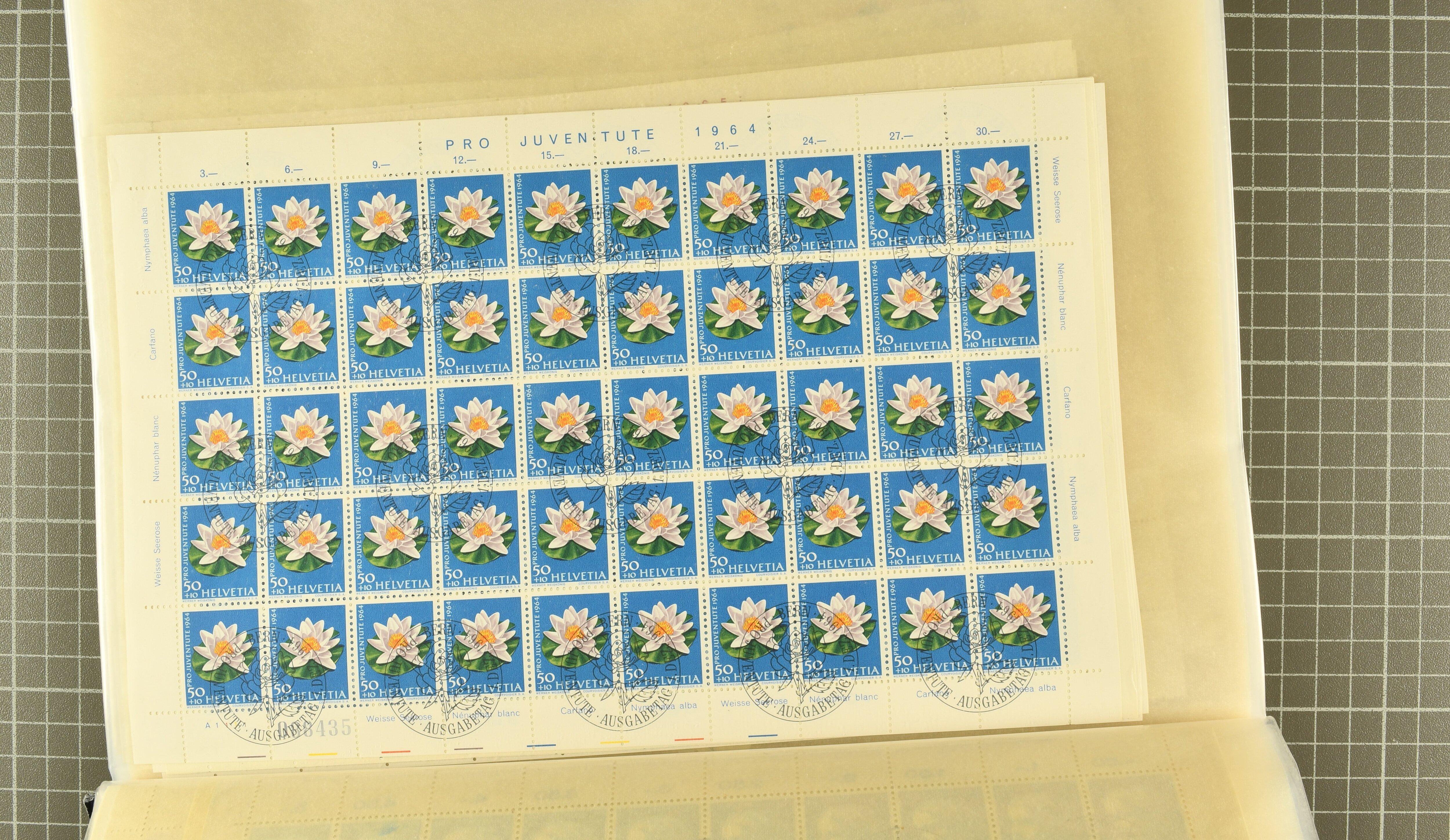1912/1964: Schöne Sammlung vorab gestempelte Pro Juventute in Viererblocks, der grösste Teil davon mit Ersttagsstempel. Vorläufer I und Ausgabe 1913 sind postfrisch (es geht dann erst mit 1927 weiter). Dazu eine