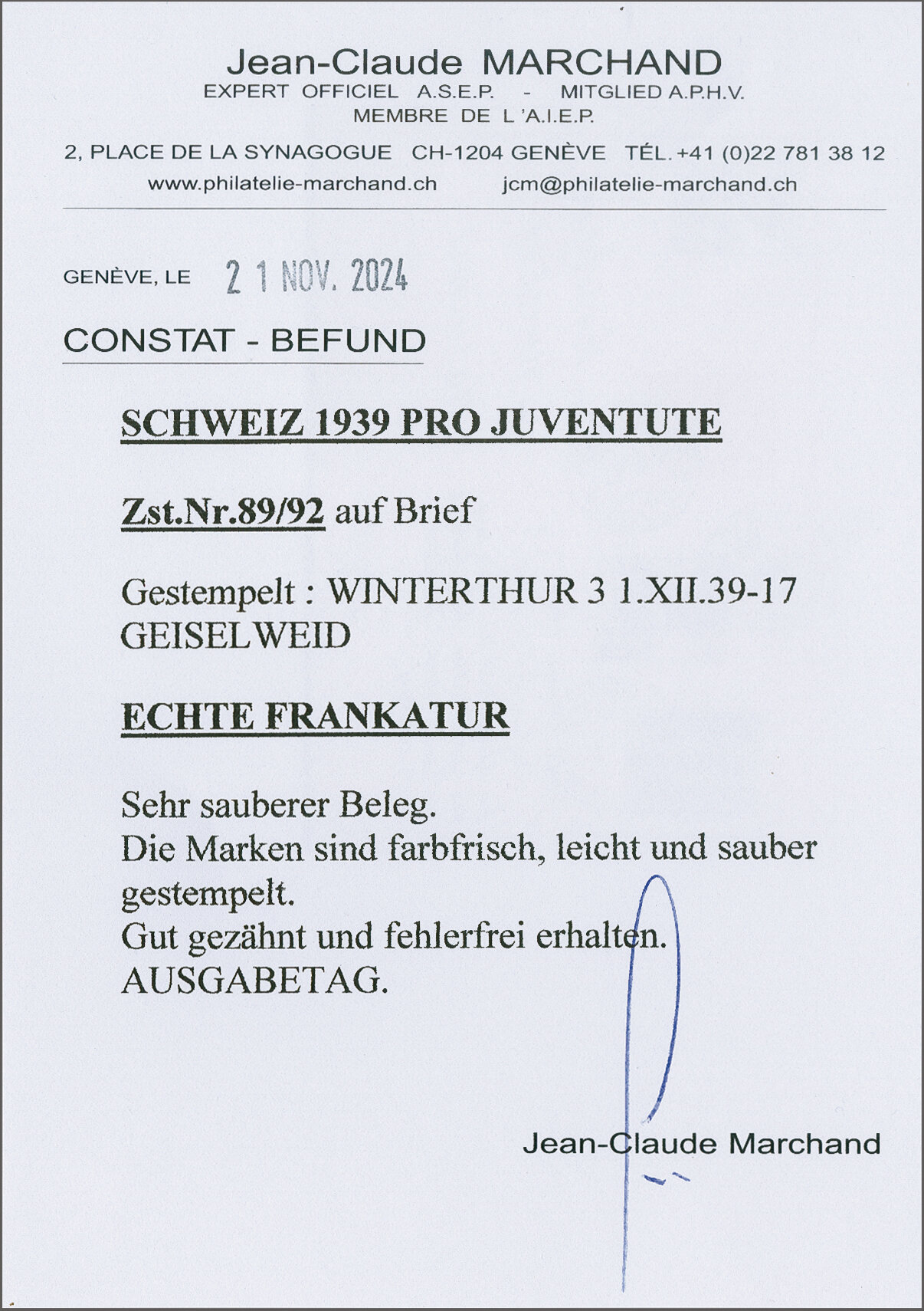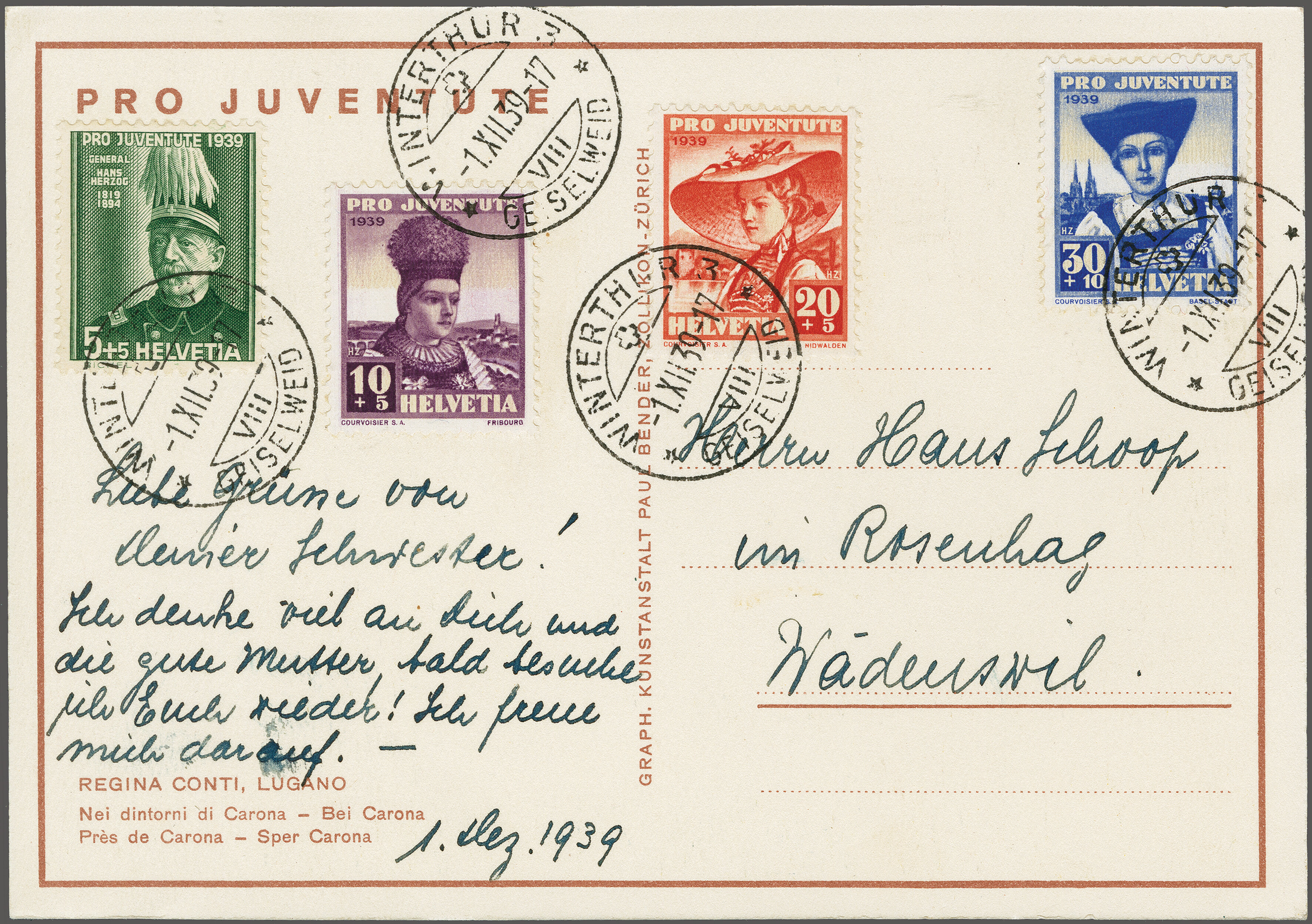 1939: Mit ganzem Satz frankierte Pro Juventute-Karte 'Nei dintorni di Carona..' von Regina Conti (richtige Karte für das gleiche Jahr). Am Ausgabetag sauber gest. "WINTERTHUR -1.XII 39-17" n. Wädenswil. Befund Marchand. SBK =