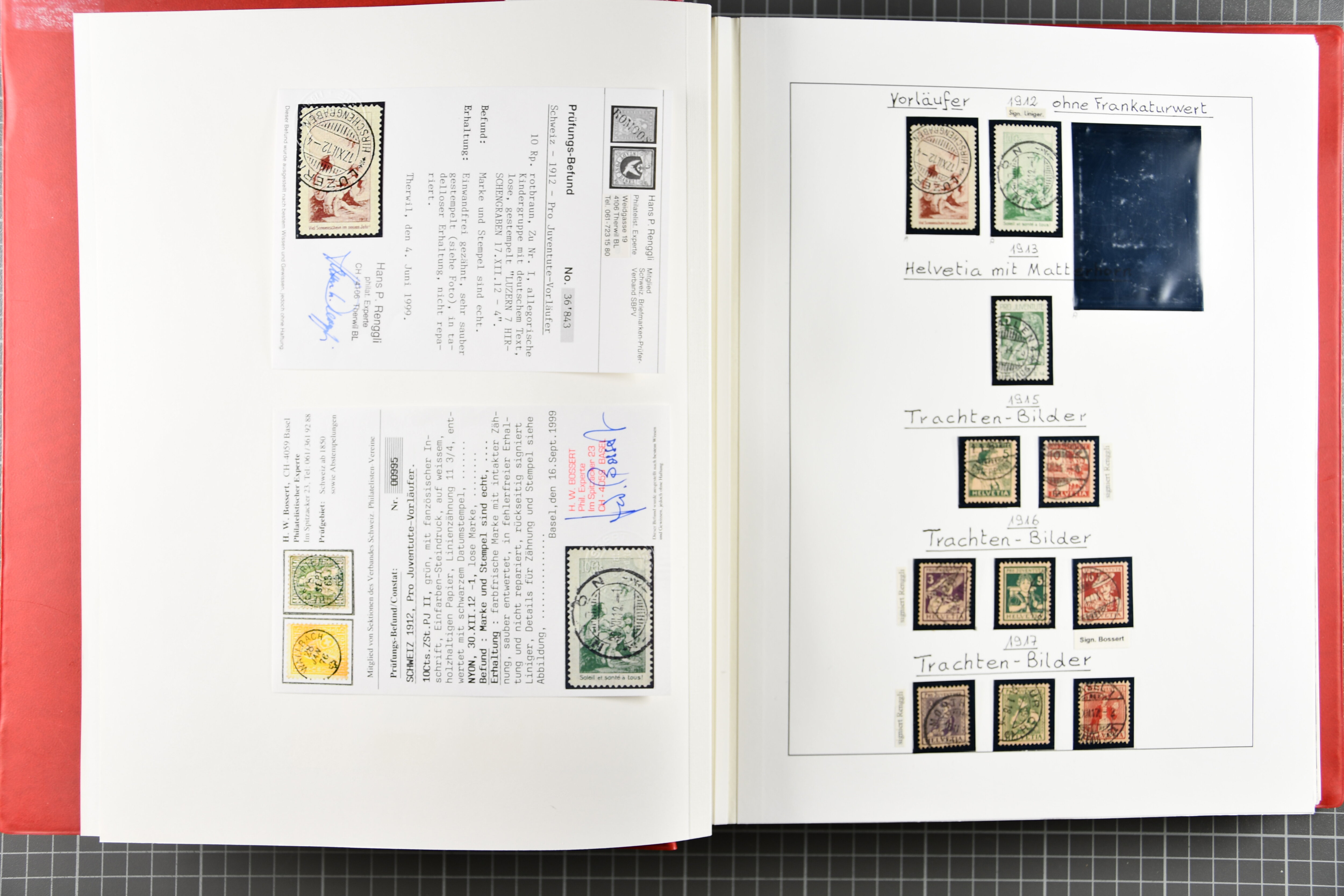 1912/1999: Prächtige, gestempelte Sammlung, komplett auf Blättern aufgezogen. Vorläufer II zweimal einzeln (einmal signiert Marchand) und einmal im Paar (signiert Liniger), Vorläufer III mit rückdatiertem Stempel
