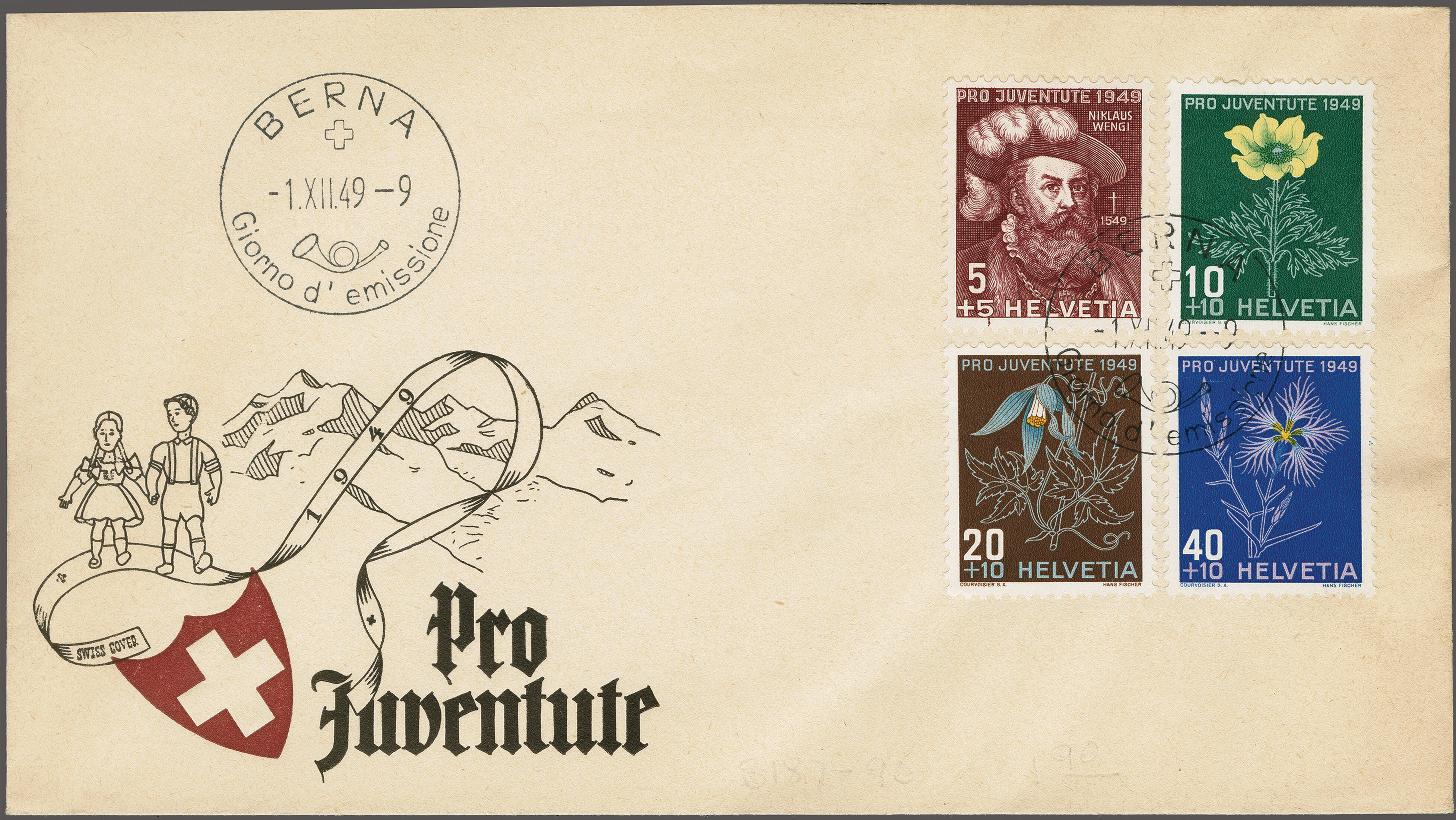 1949: Alpenblumenbilder, kompl. Serie auf illustriertem FDC ohne Adresse in ital. 'Berna 1.XII.49 Giorno d'emissione'. Ein grosse Seltenheit in perfekter Erhaltung. SBK = CHF 550+ (Image 1)
