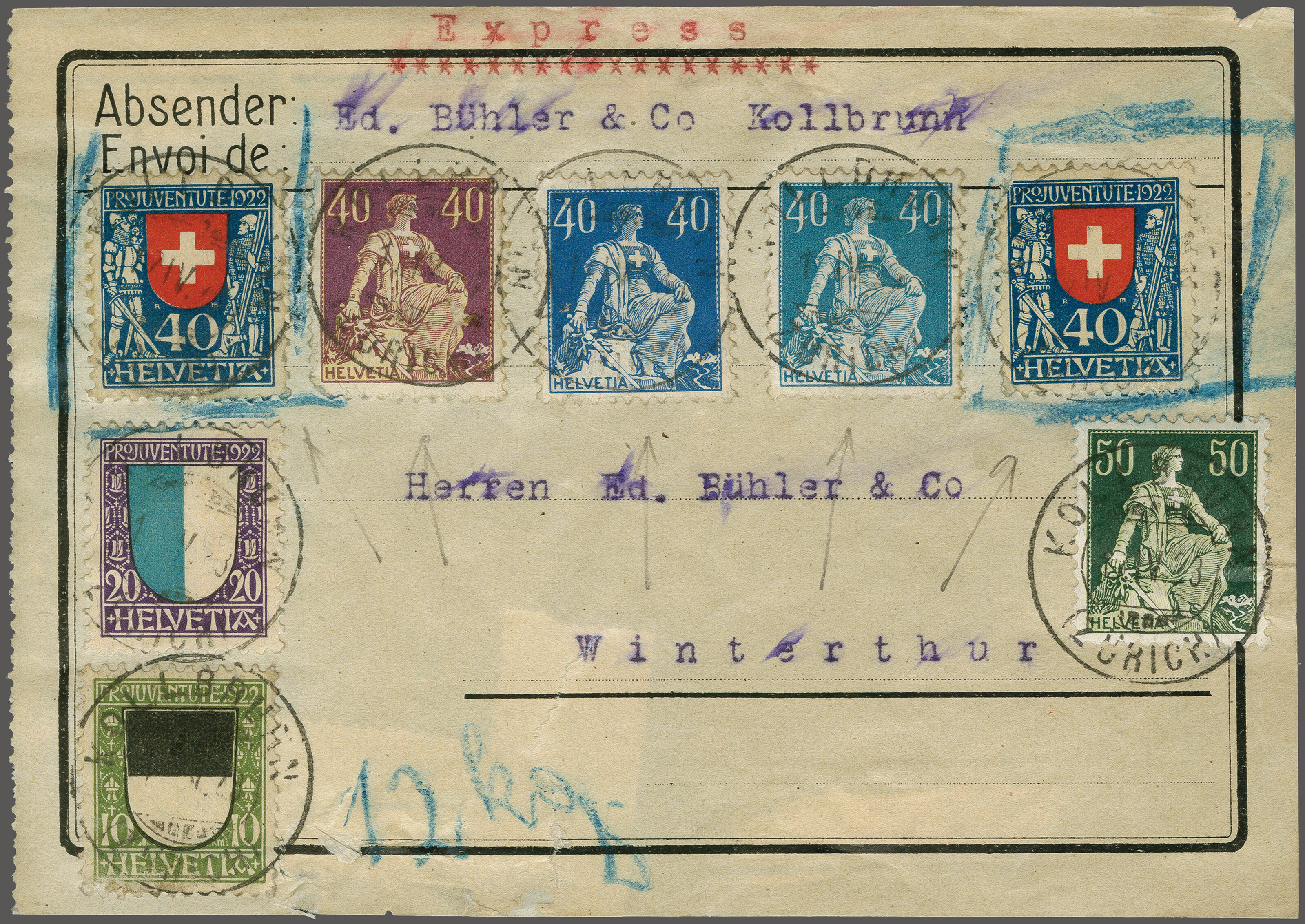 Paketadresse für eine Expresspaket von 12kg nach Winterthur, die Pro Juventute-Marken mit Bläuelstrichen als ungültig gekennzeichnet, da per 30. März ausser Kurs gesetzt. Eine ungewöhnliche Frankatur in Bedarfserhaltung. (Image 1)