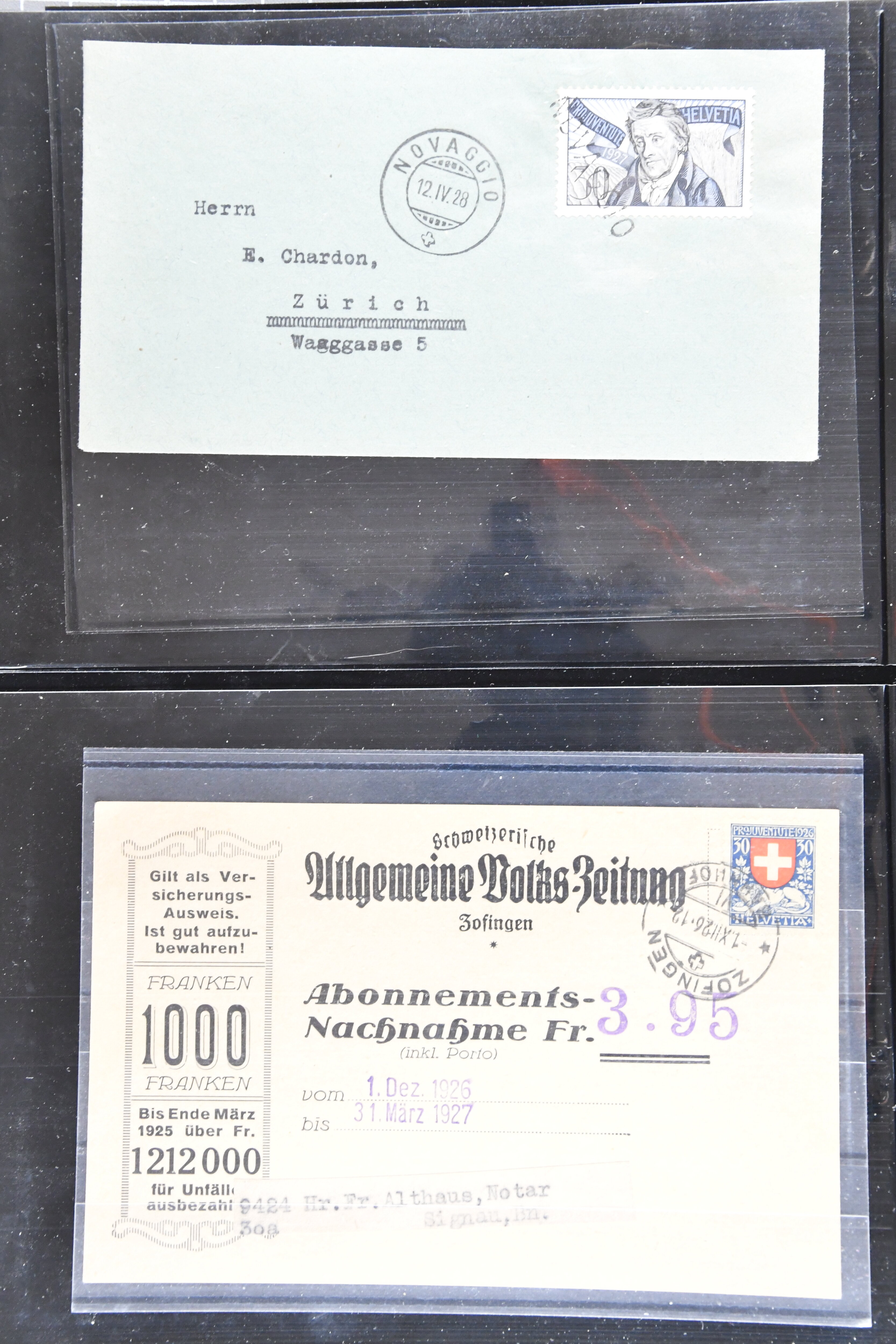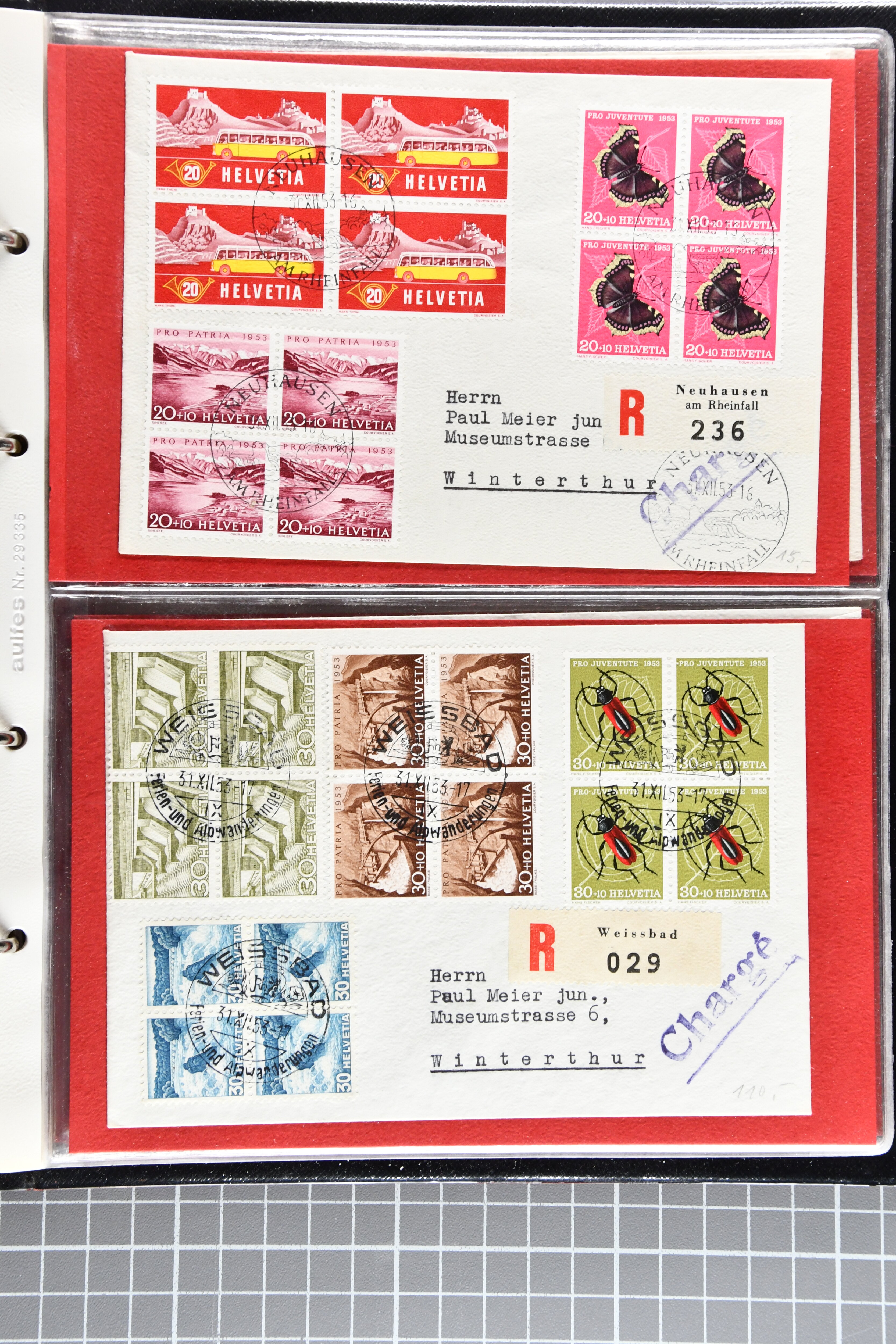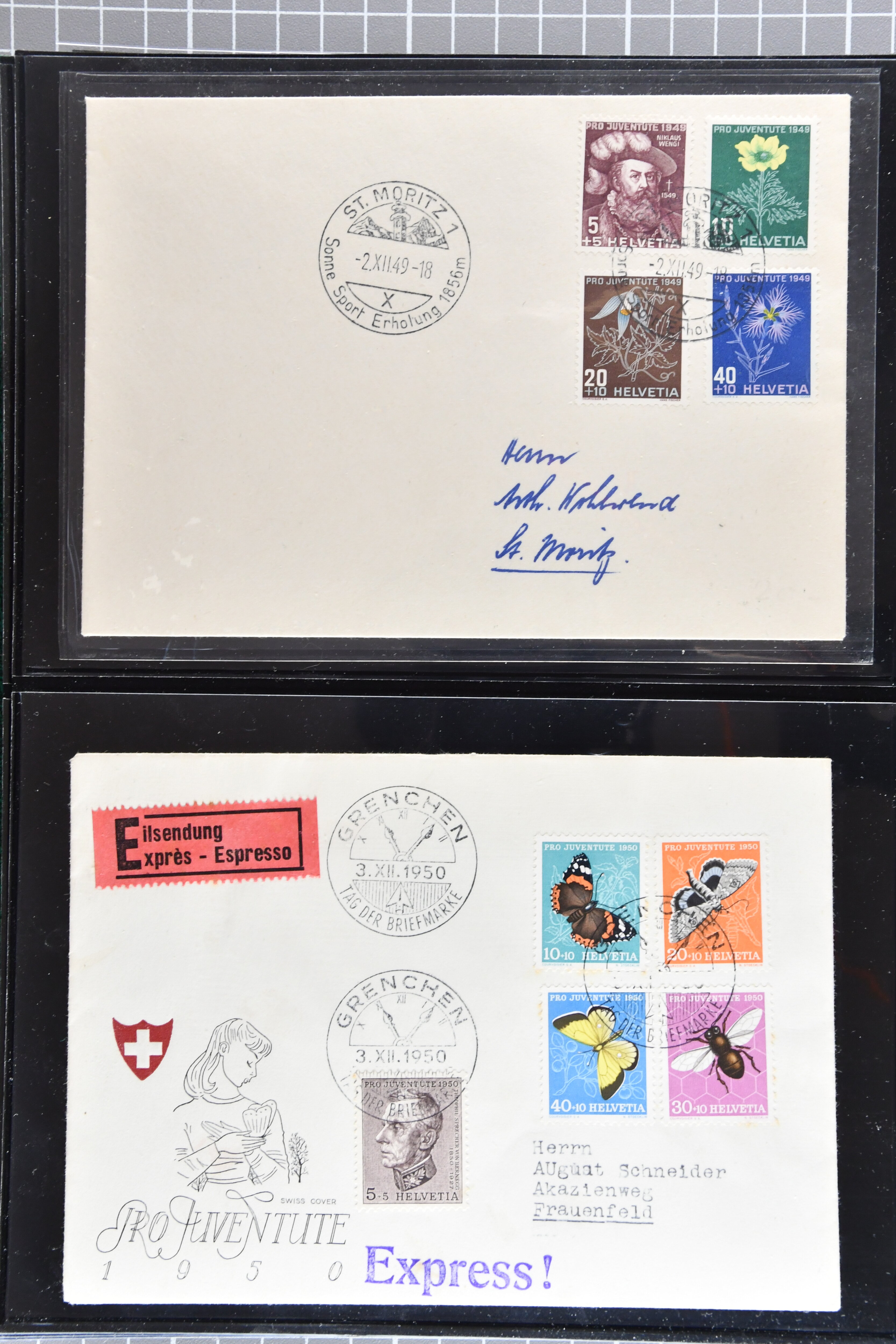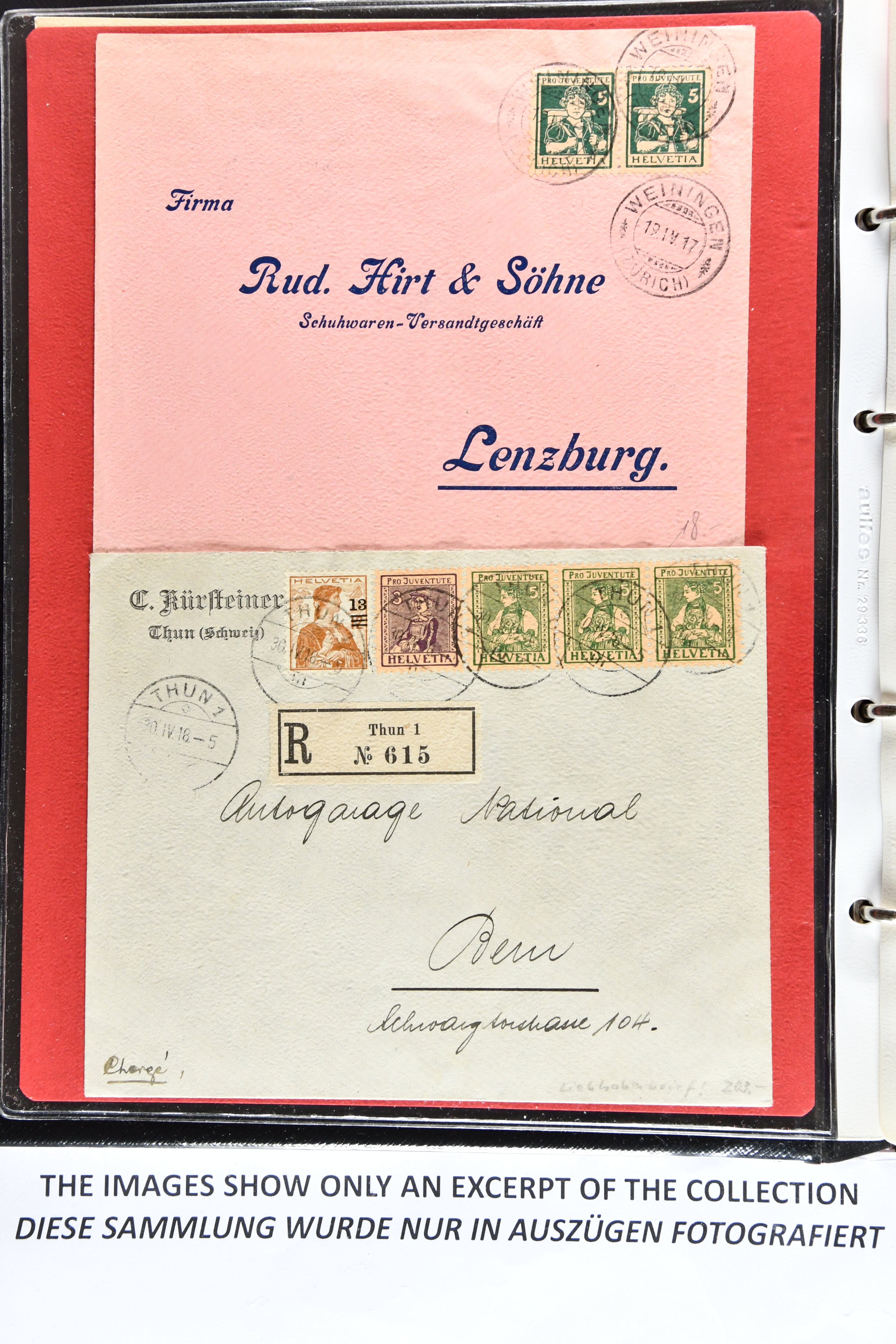 Bedarfspost, darunter unter anderem PJ-Karten, FDCs und K-Stempel auf Pro Juventute und TABs. Ein Album ist mit FDCs von 1963 bis 1992 bestückt, ein weiteres mit TABs von 1948 bis 1975, alle gestempelt. Zudem gibt es ein Briefalbum mit Belegen zum