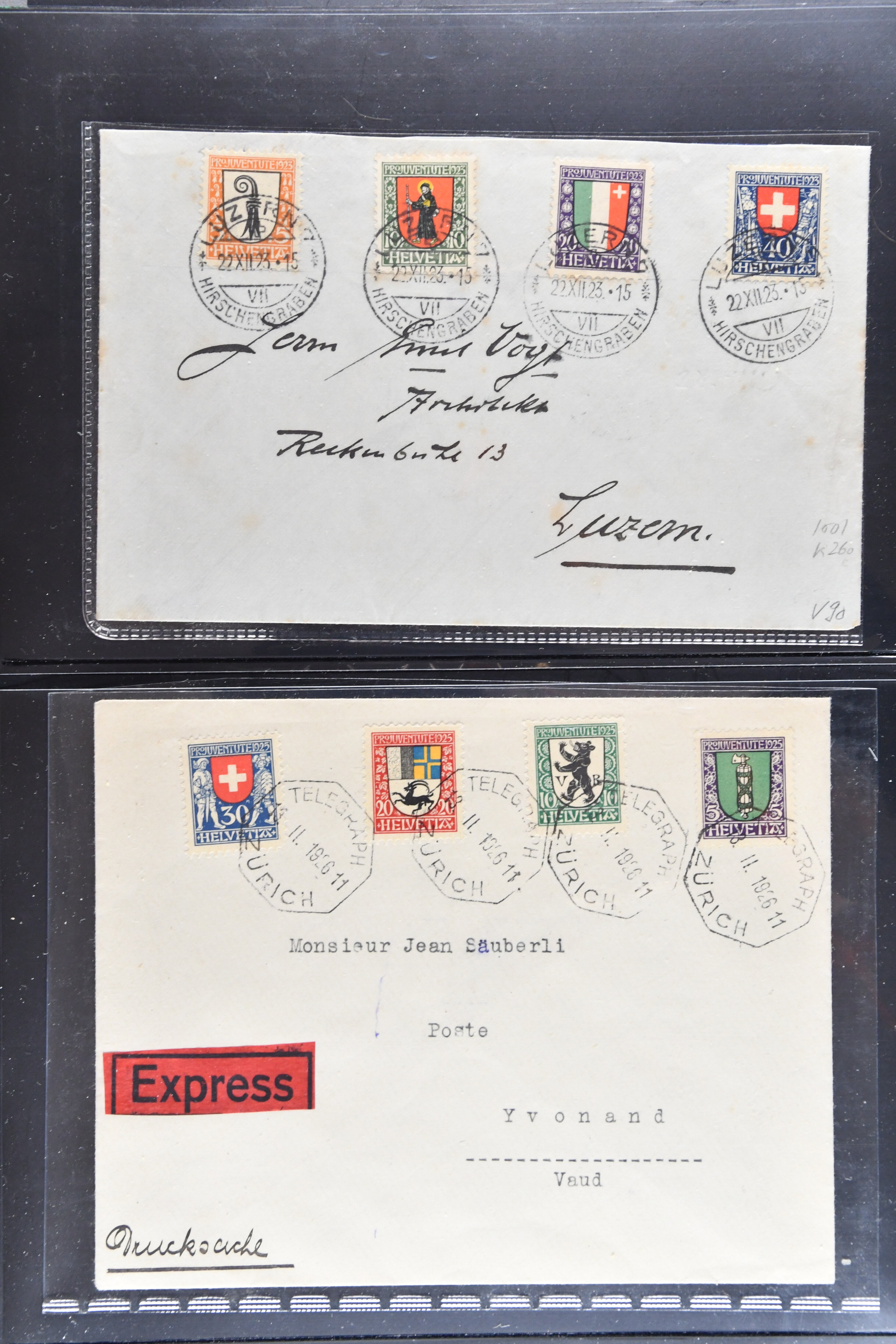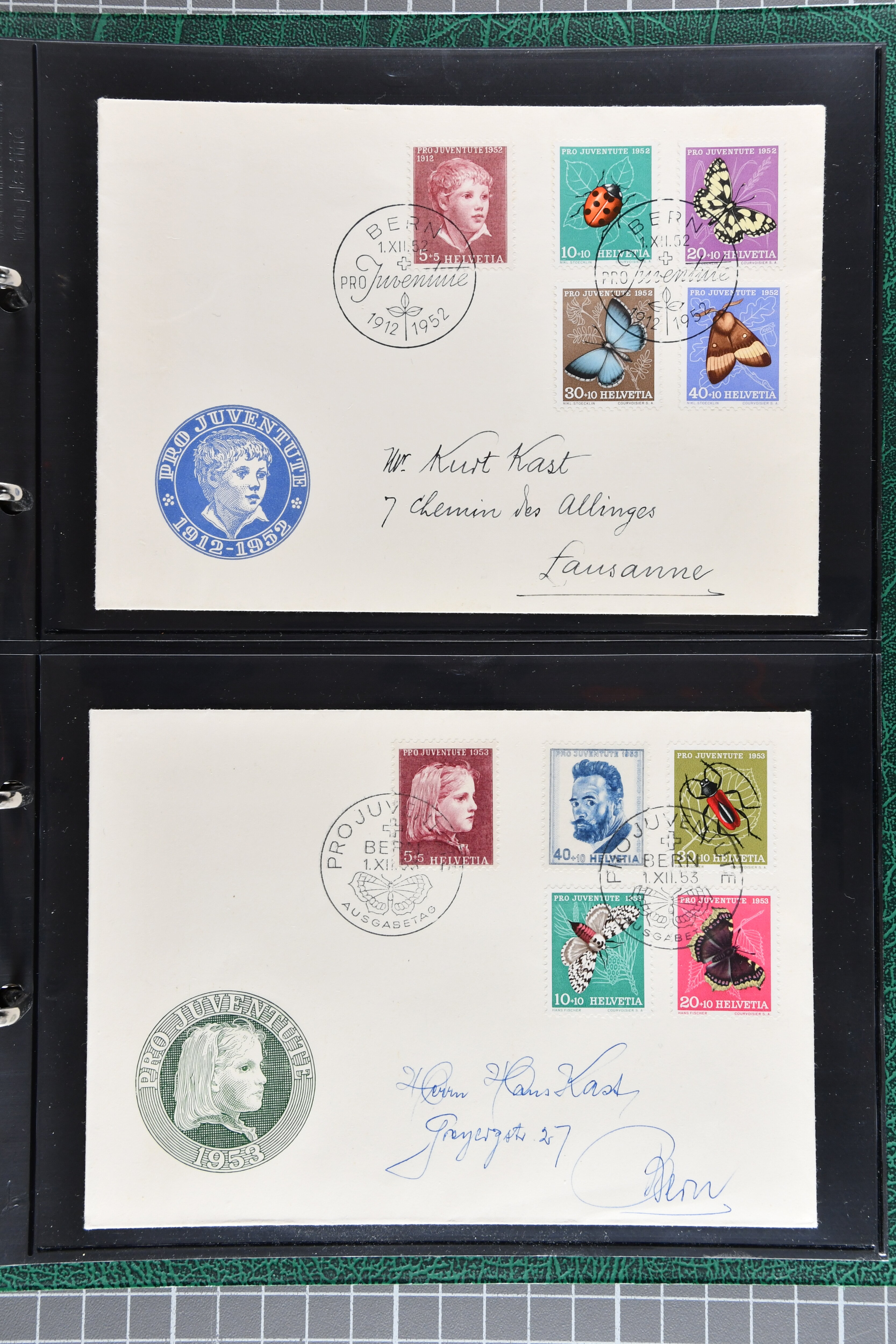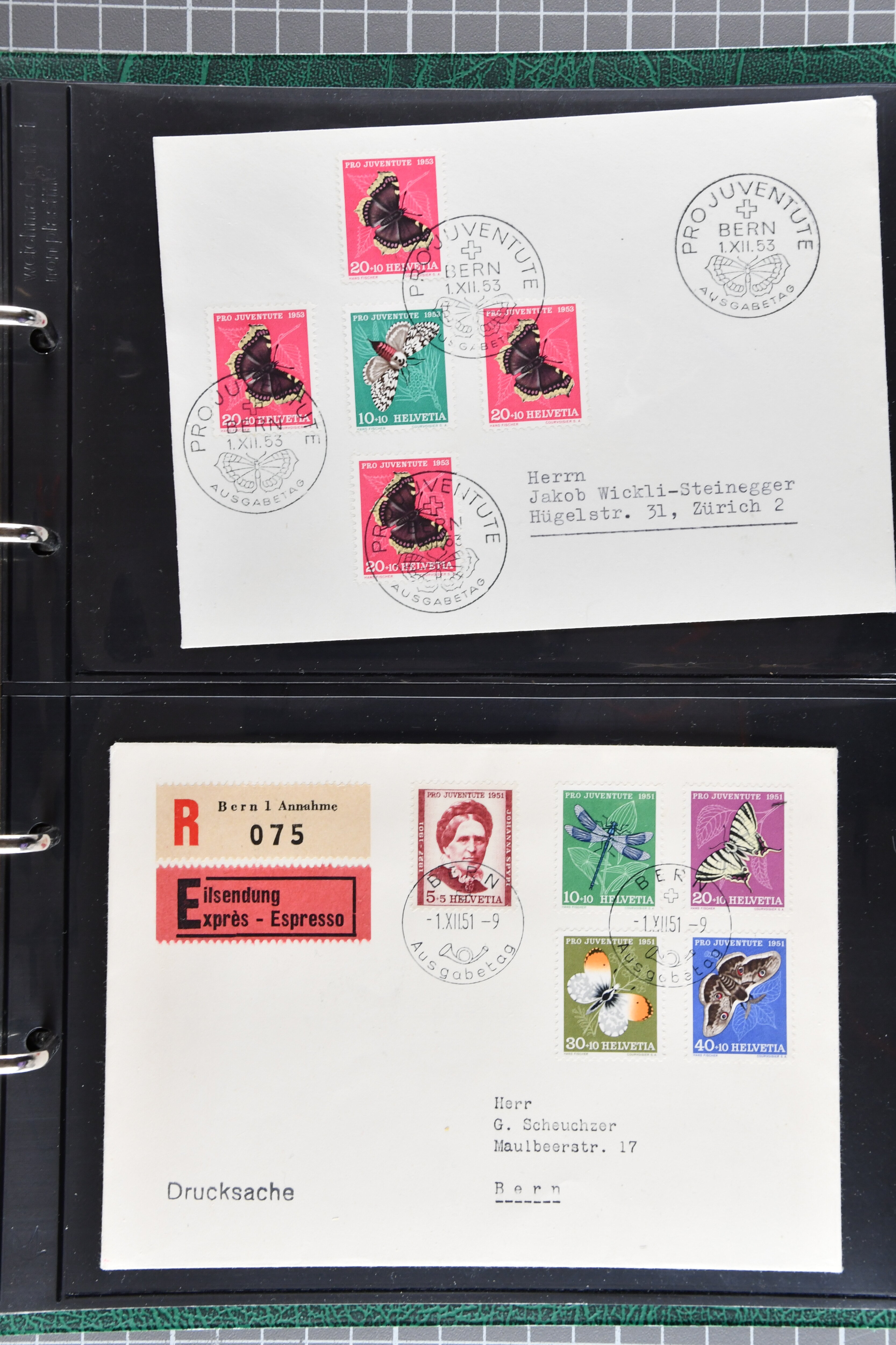 Bedarfspost, darunter unter anderem PJ-Karten, FDCs und K-Stempel auf Pro Juventute und TABs. Ein Album ist mit FDCs von 1963 bis 1992 bestückt, ein weiteres mit TABs von 1948 bis 1975, alle gestempelt. Zudem gibt es ein Briefalbum mit Belegen zum