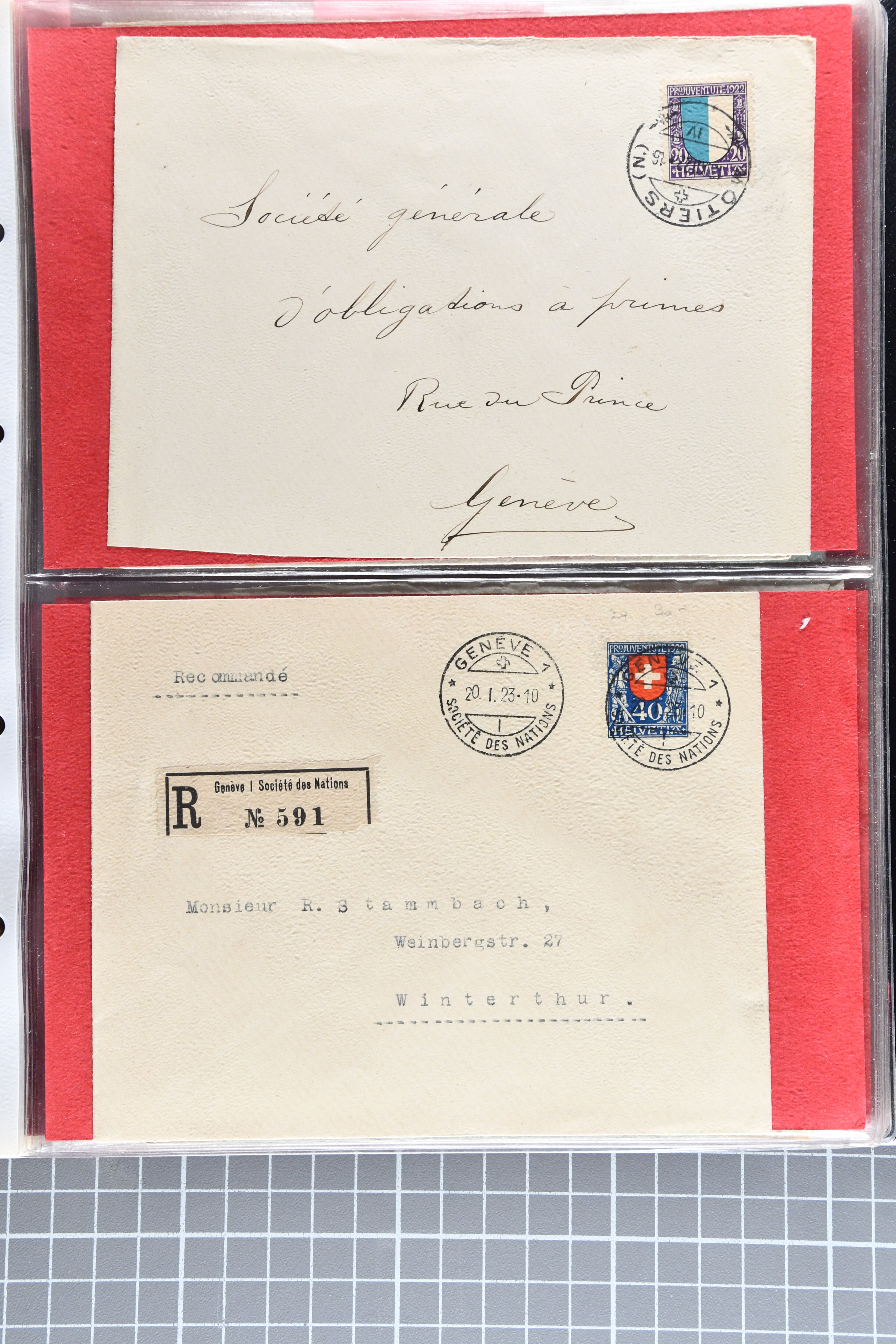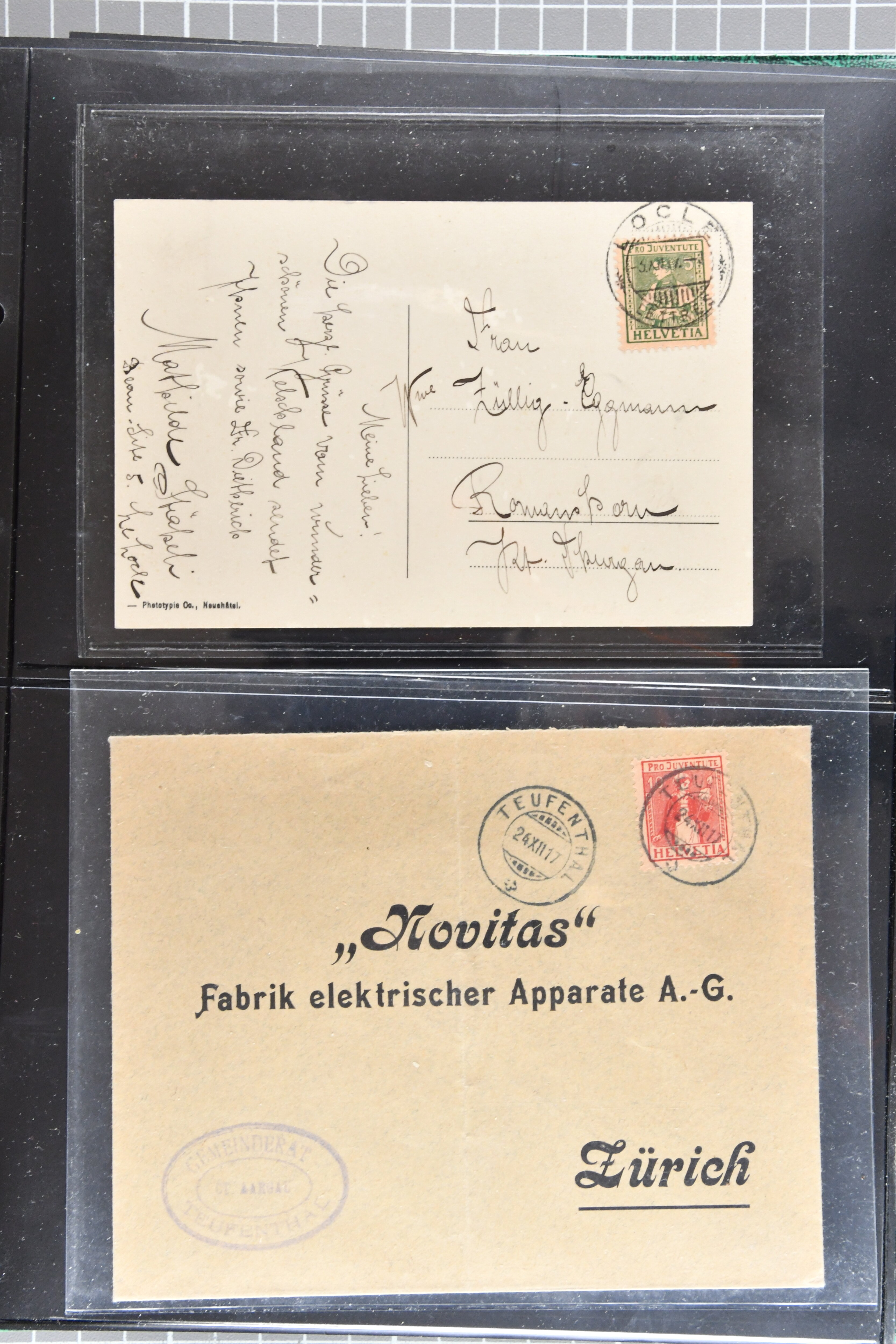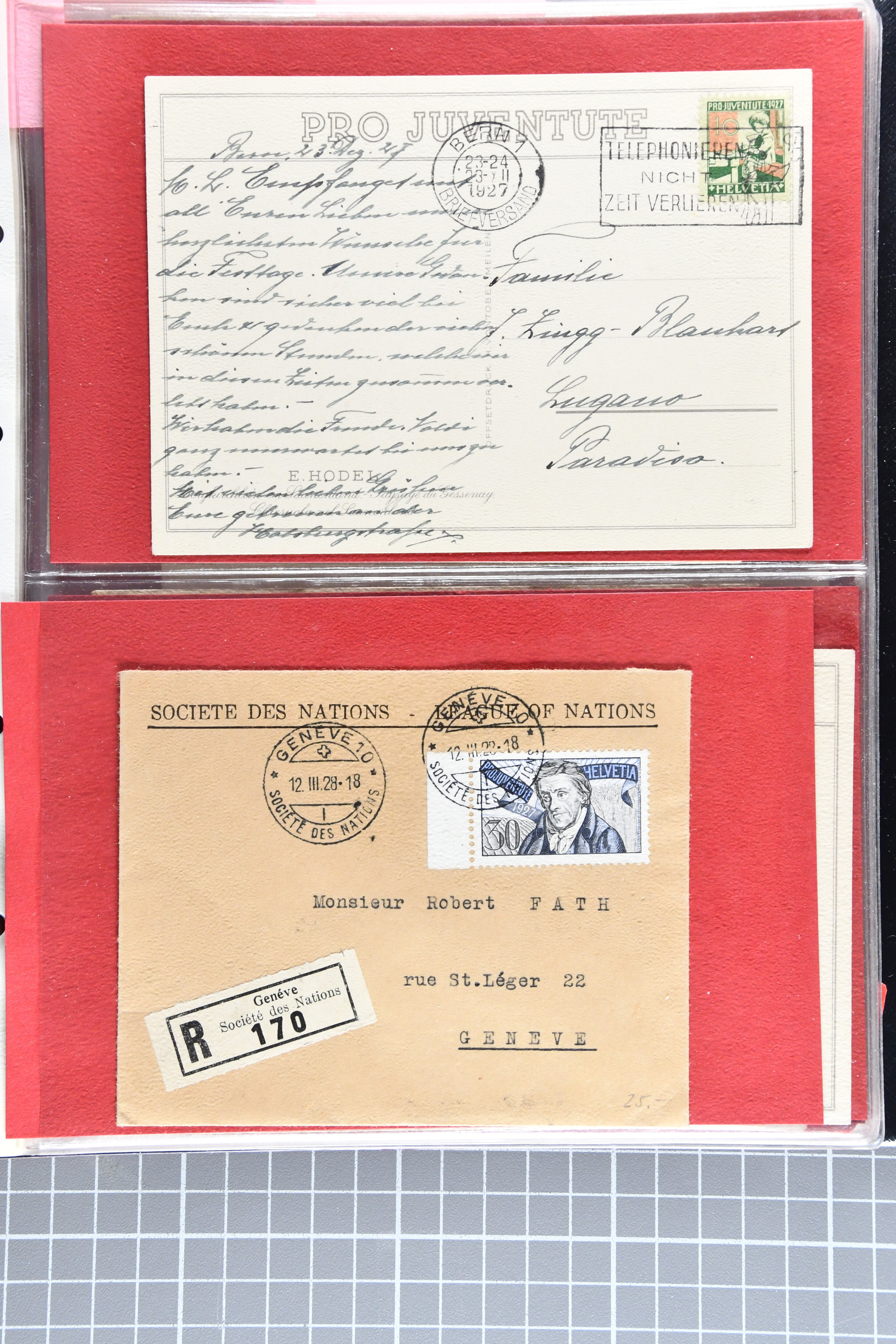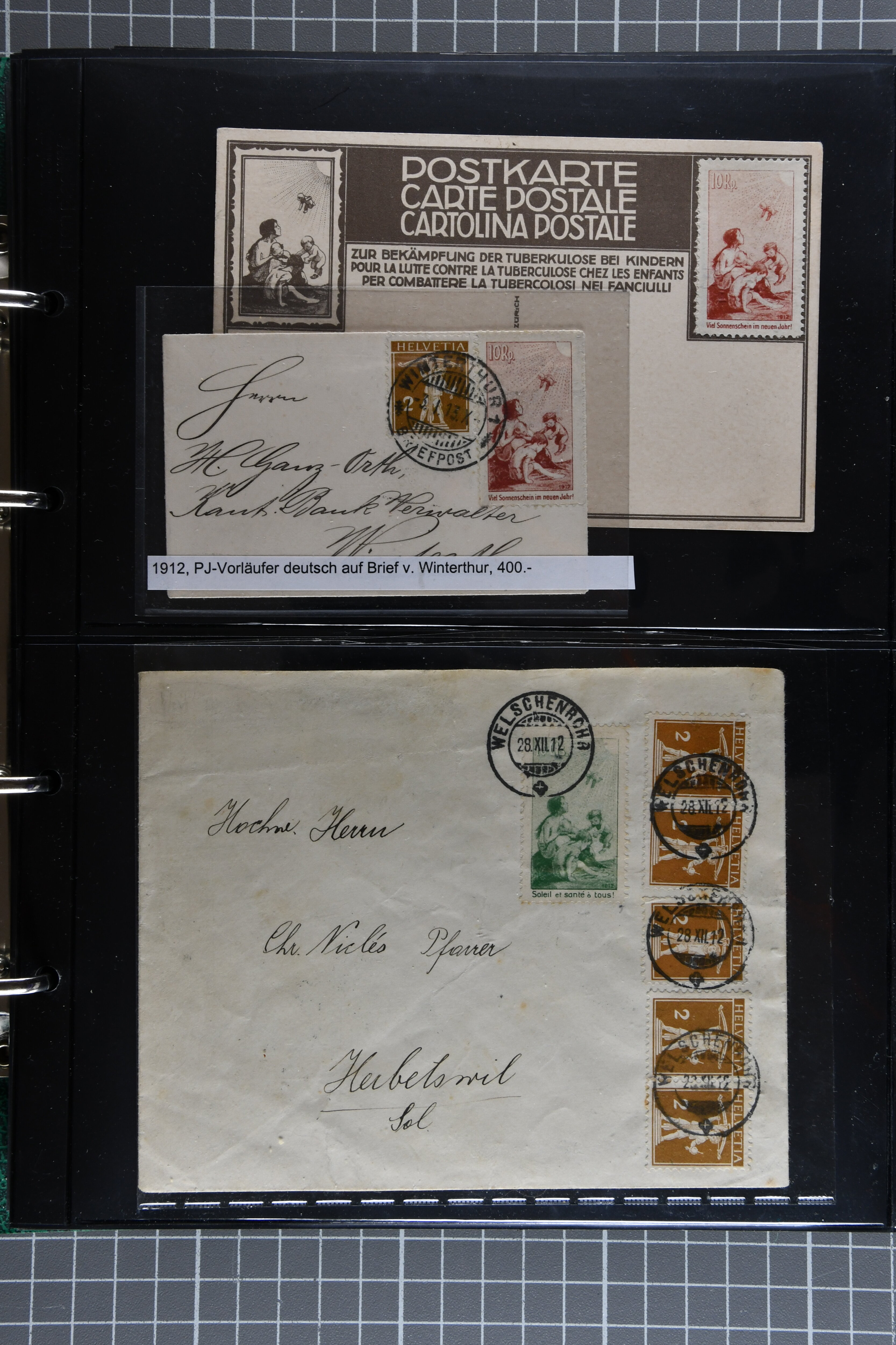 Bedarfspost, darunter unter anderem PJ-Karten, FDCs und K-Stempel auf Pro Juventute und TABs. Ein Album ist mit FDCs von 1963 bis 1992 bestückt, ein weiteres mit TABs von 1948 bis 1975, alle gestempelt. Zudem gibt es ein Briefalbum mit Belegen zum