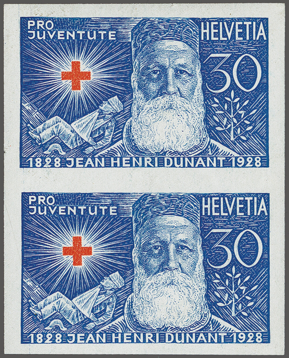 1928: Henri Dunant 30 Rp. blau & rot als ungezähnte Abart im senkrechten Paar postfrisch. SBK = CHF 2'000. (Image 1)