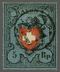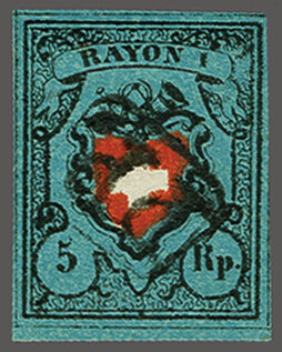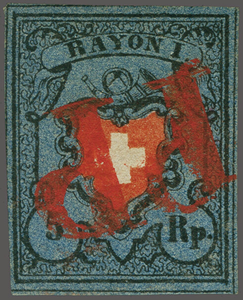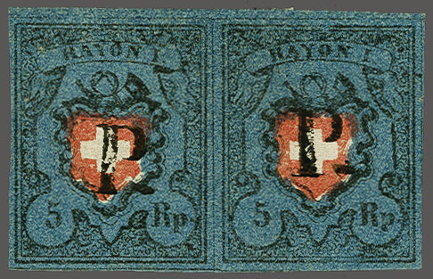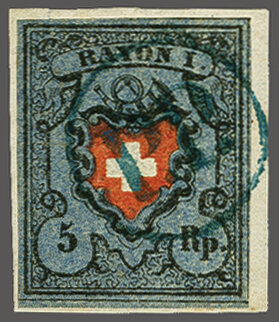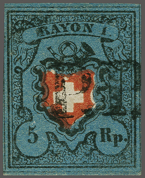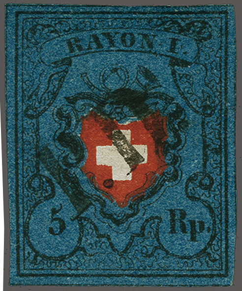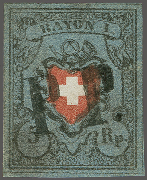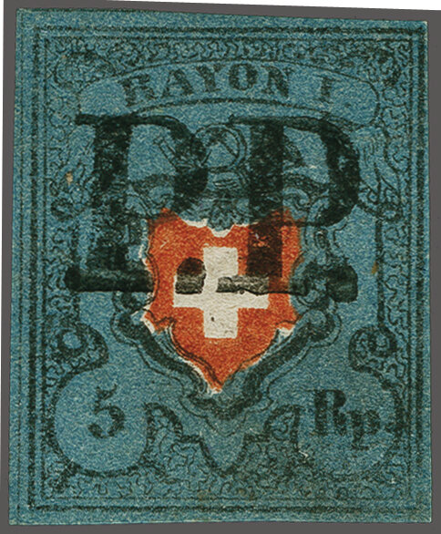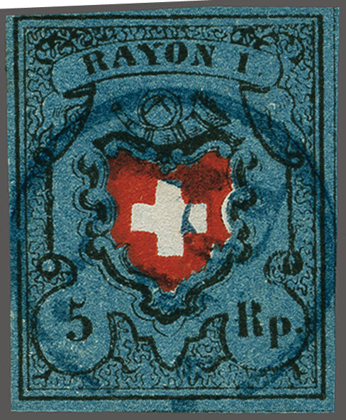 Ohne Kreuzeinfassung, Type 5 in der tiefdunkelblauen Nuance, farbfr. und gut- bis überrandig, ideal klar, kontrastreich und voll aufgesetzt entw. mit ziemlich seltenem schwarzem "PP" im Kreis von Moutier oder Schwarzenburg (AW