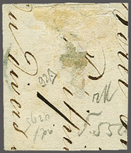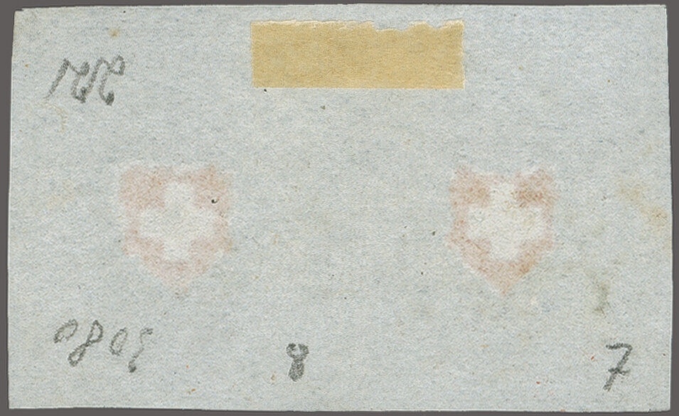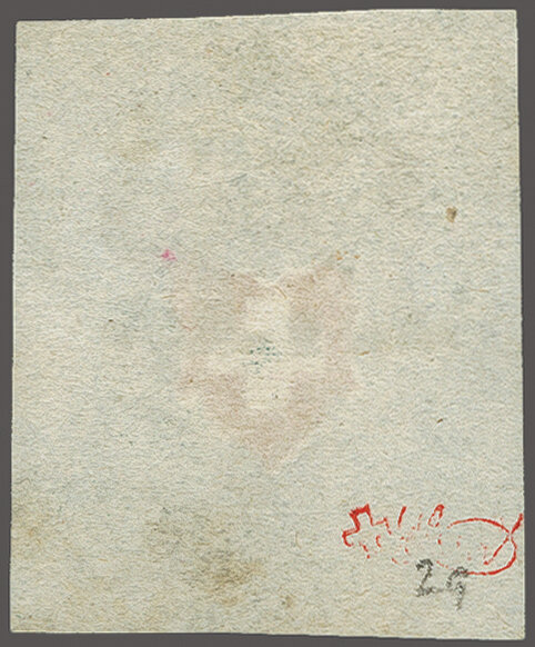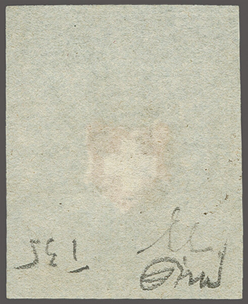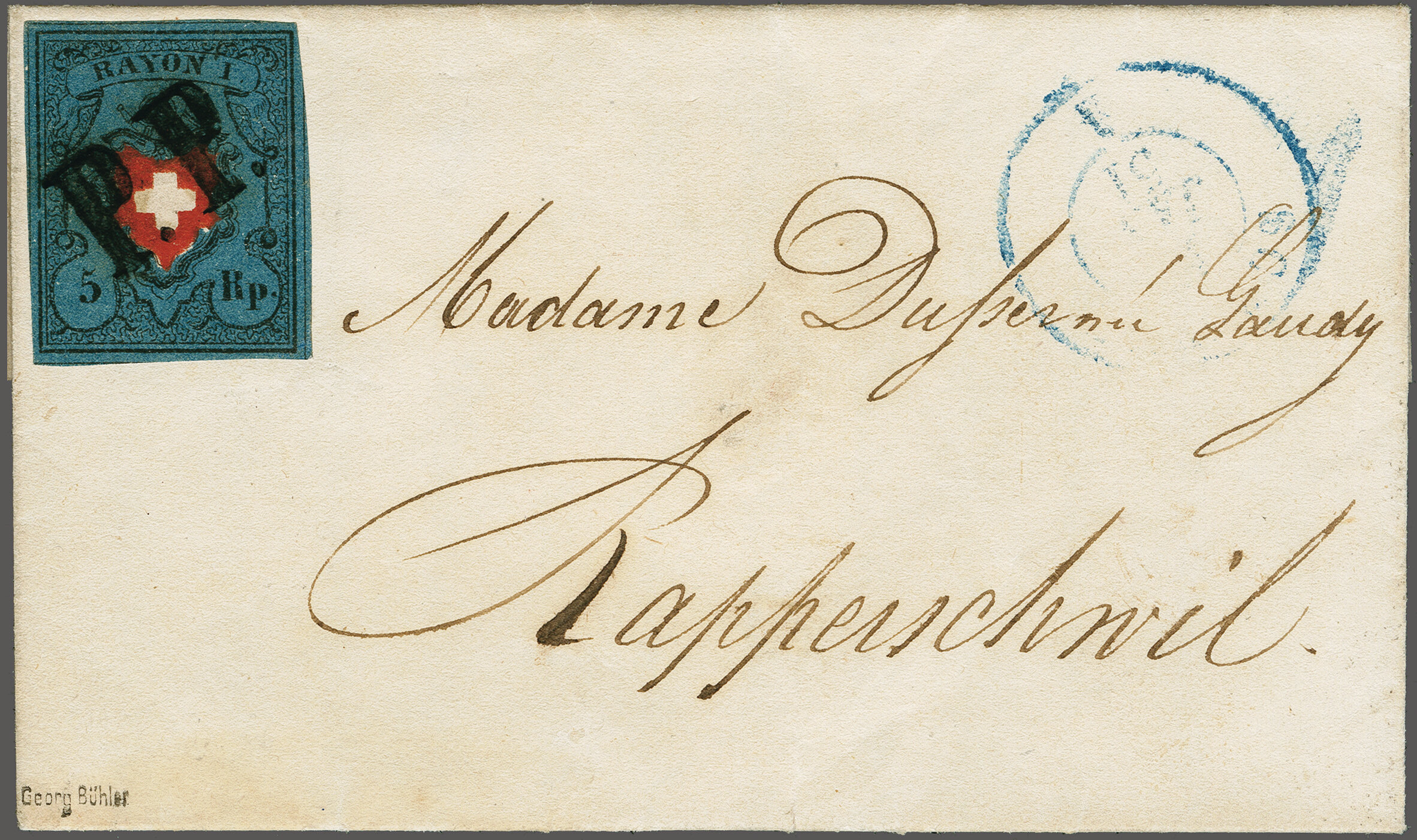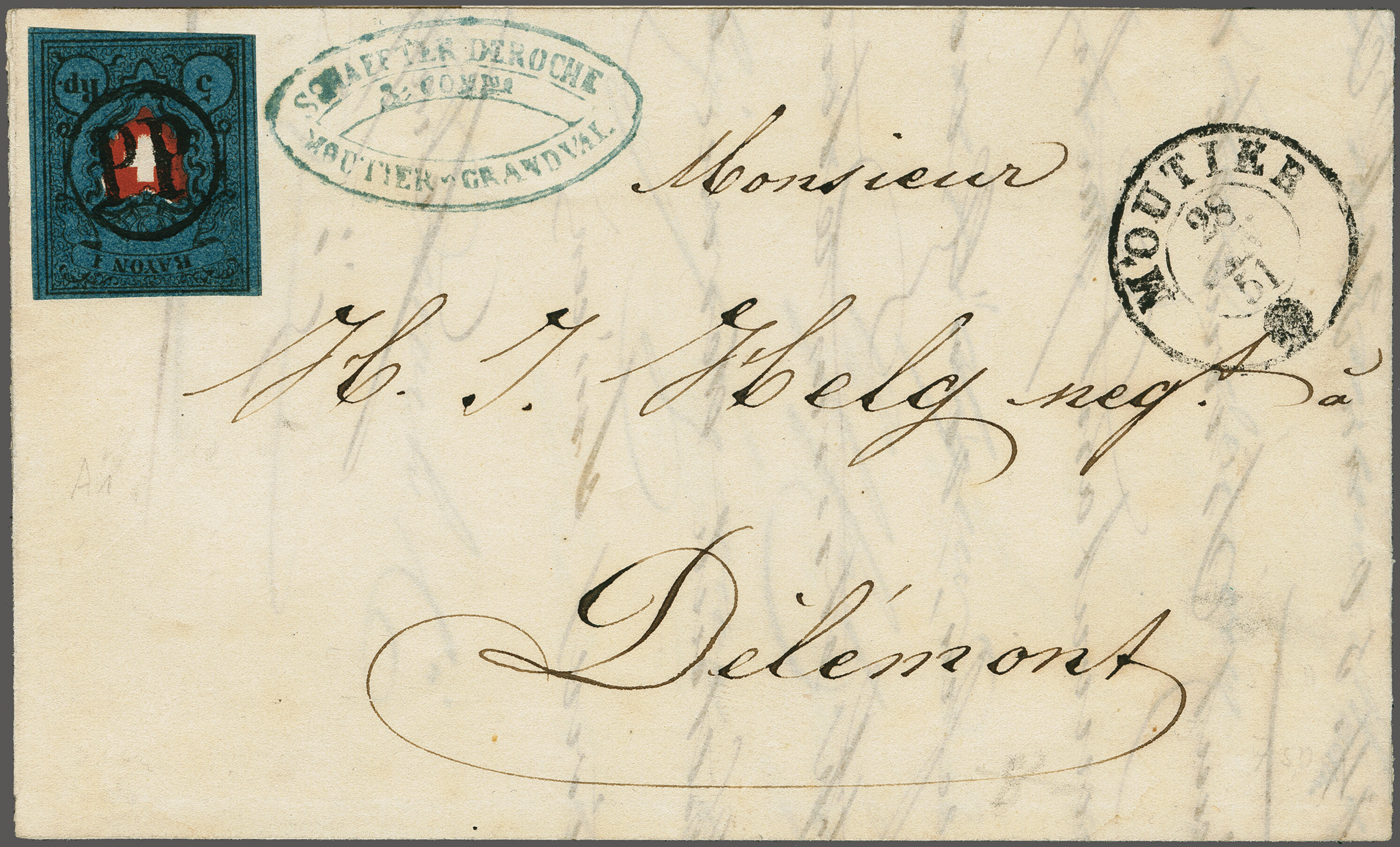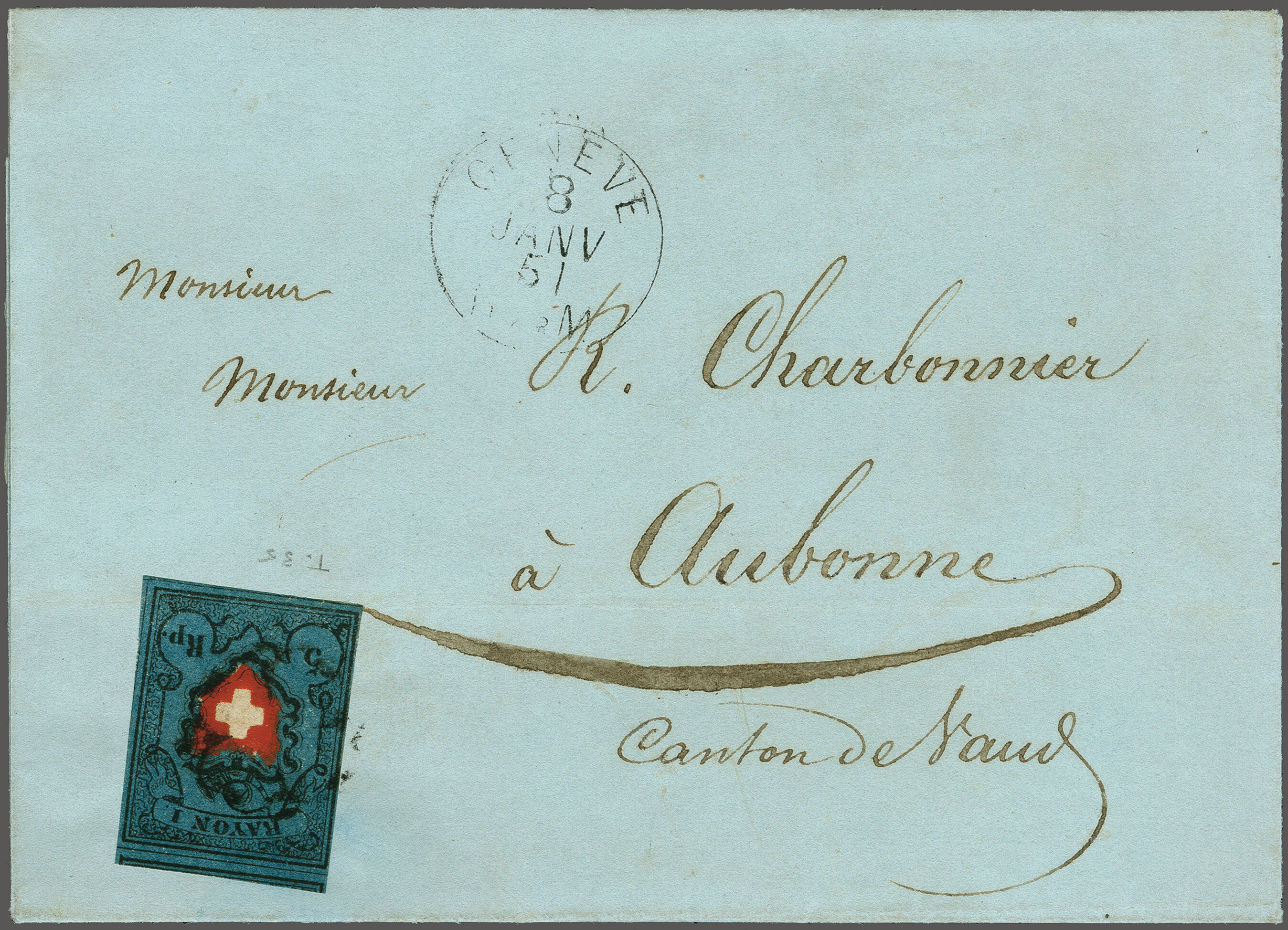 11½M" in derselben Farbe auf frischer Faltbriefhülle im 1. Briefkreis nach Aubonne (waagr. Registraturbugspur durch den unteren Teil der Marke schön ausgeglättet). Eine sehr seltene, nur während der 1. Januarhälfte 1851, zur Verwendung gekommene