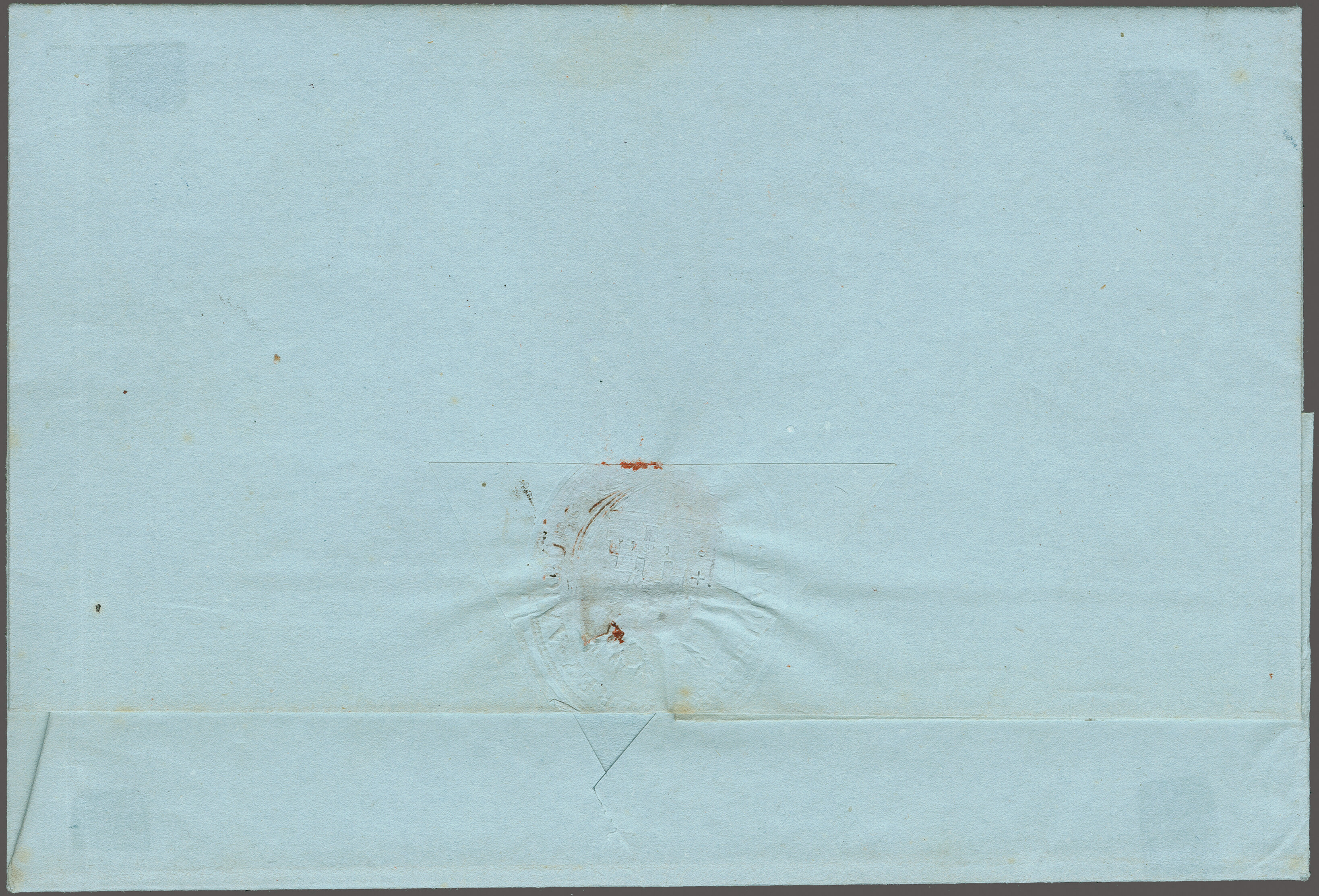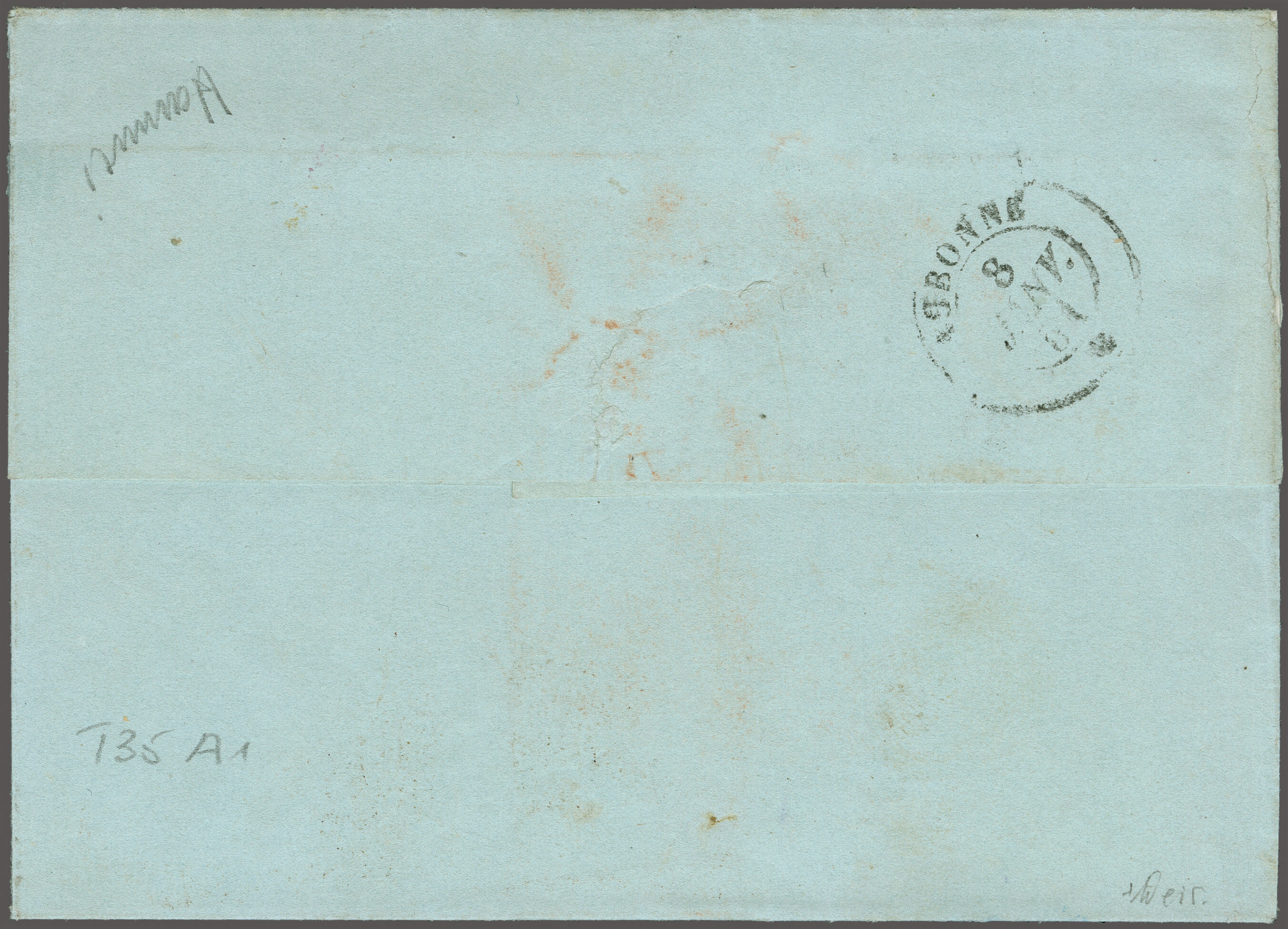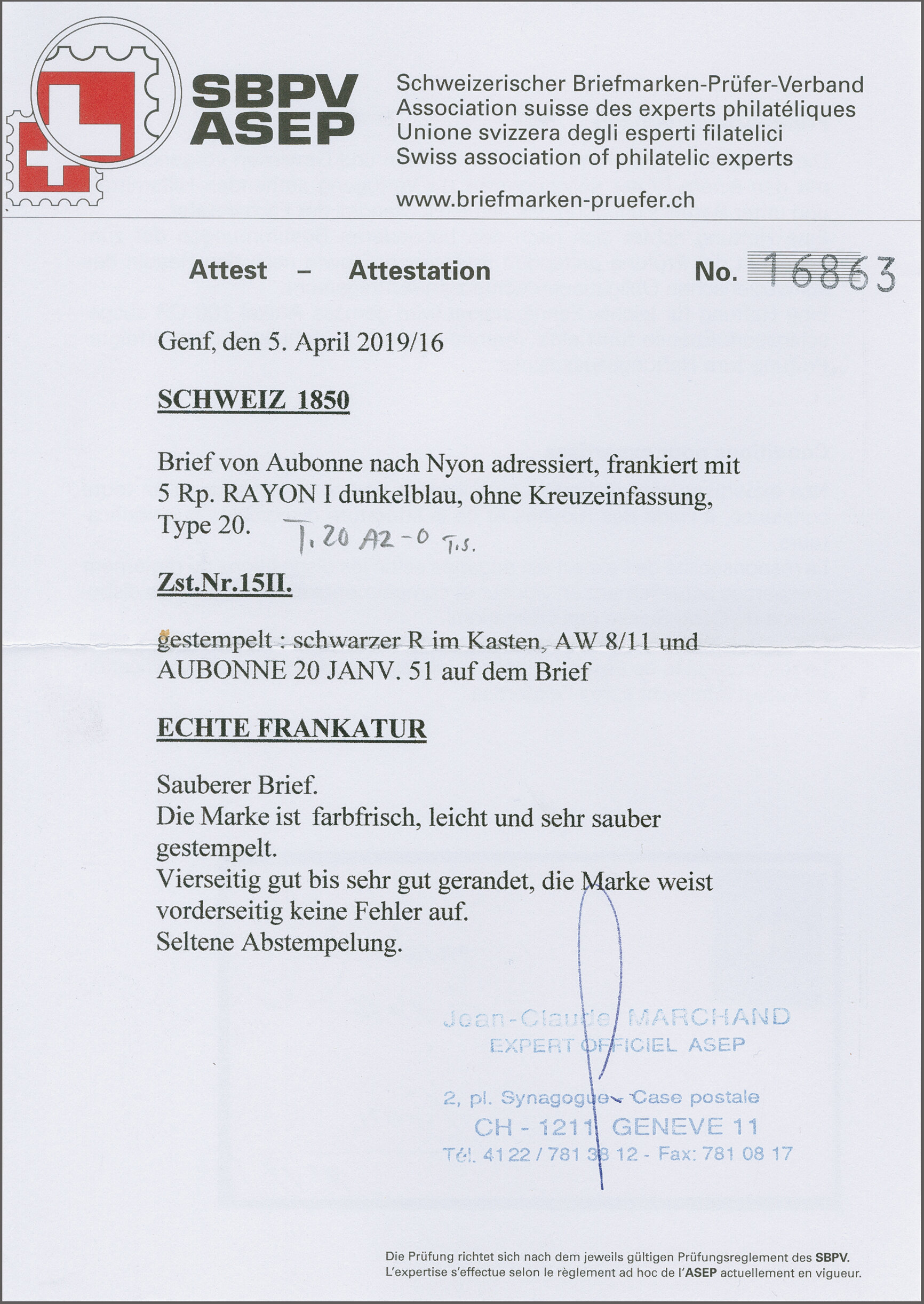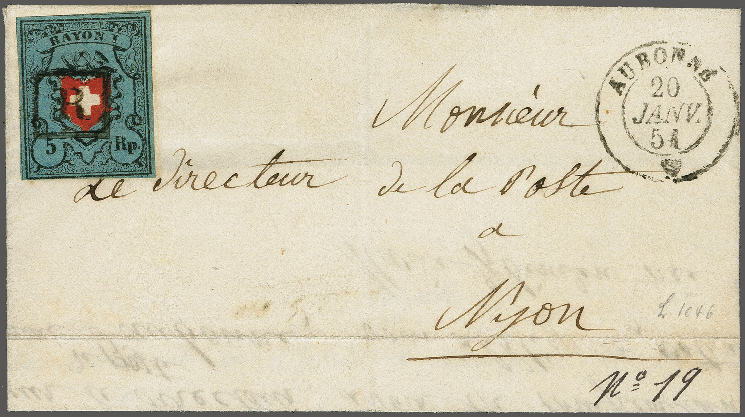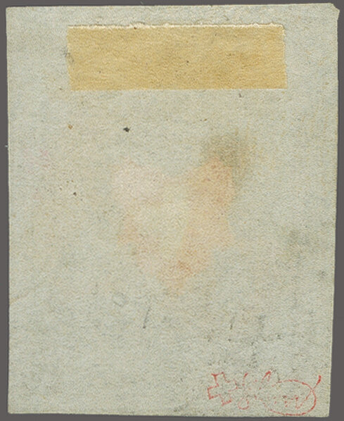11½M" in derselben Farbe auf frischer Faltbriefhülle im 1. Briefkreis nach Aubonne (waagr. Registraturbugspur durch den unteren Teil der Marke schön ausgeglättet). Eine sehr seltene, nur während der 1. Januarhälfte 1851, zur Verwendung gekommene