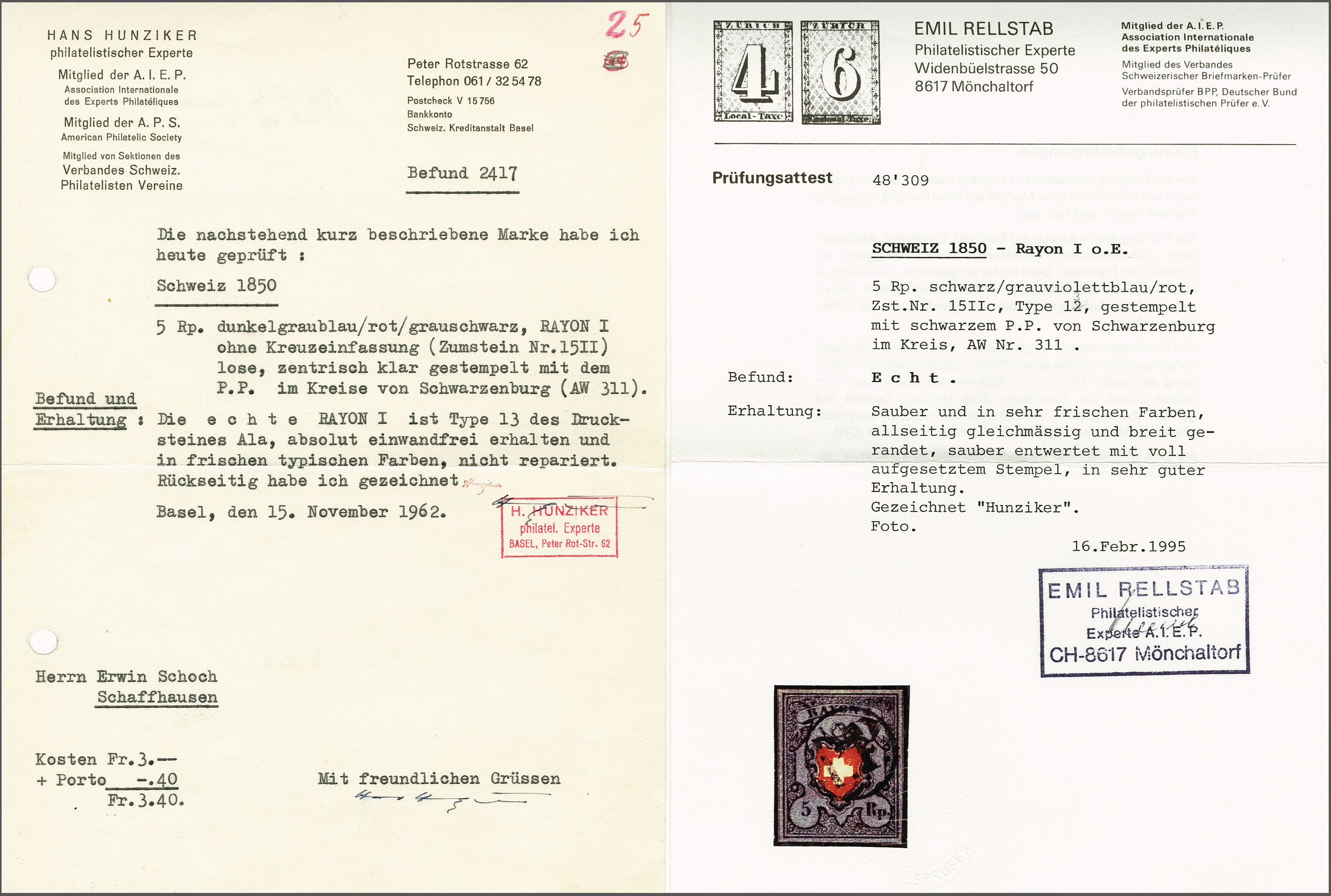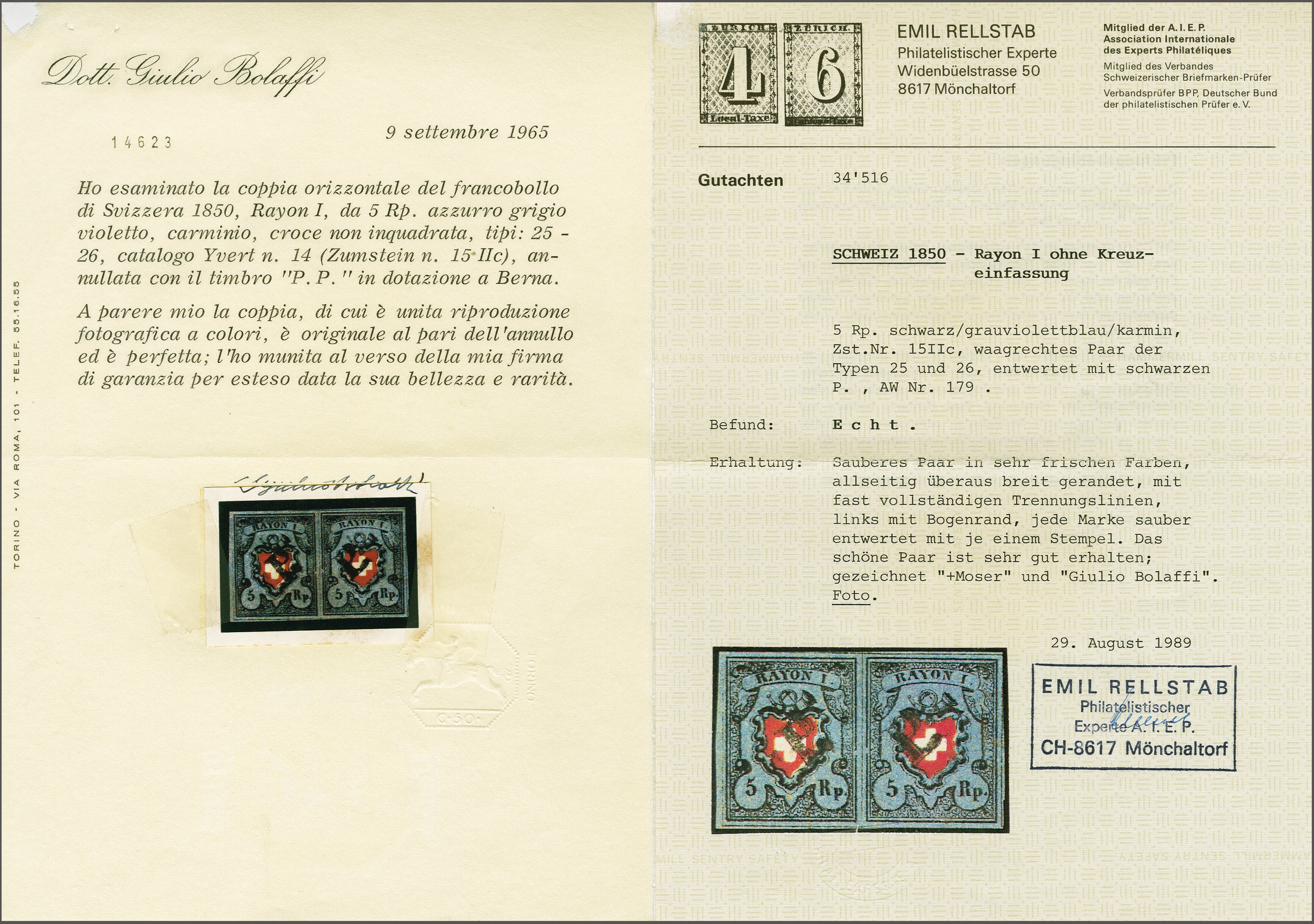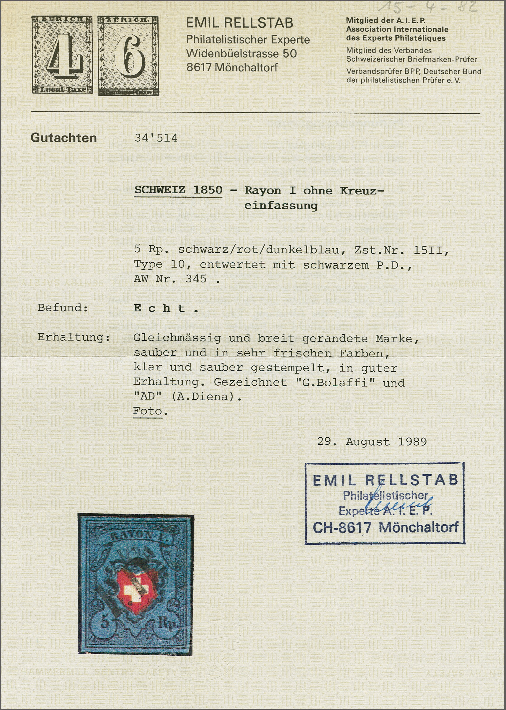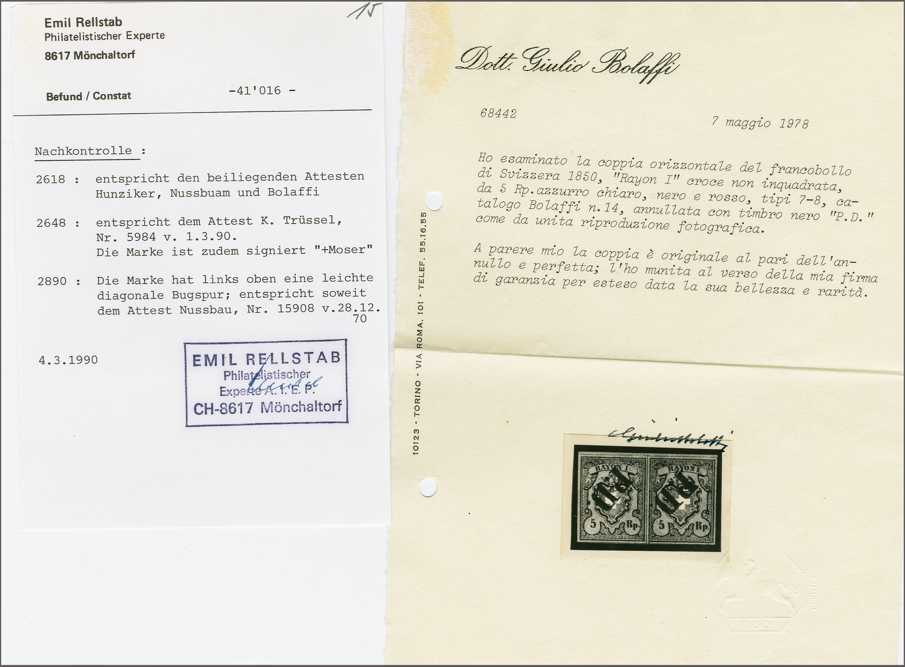 Diena & G. Bolaffi, Attest Rellstab (1989). SBK=CHF 750. (Image 1)
