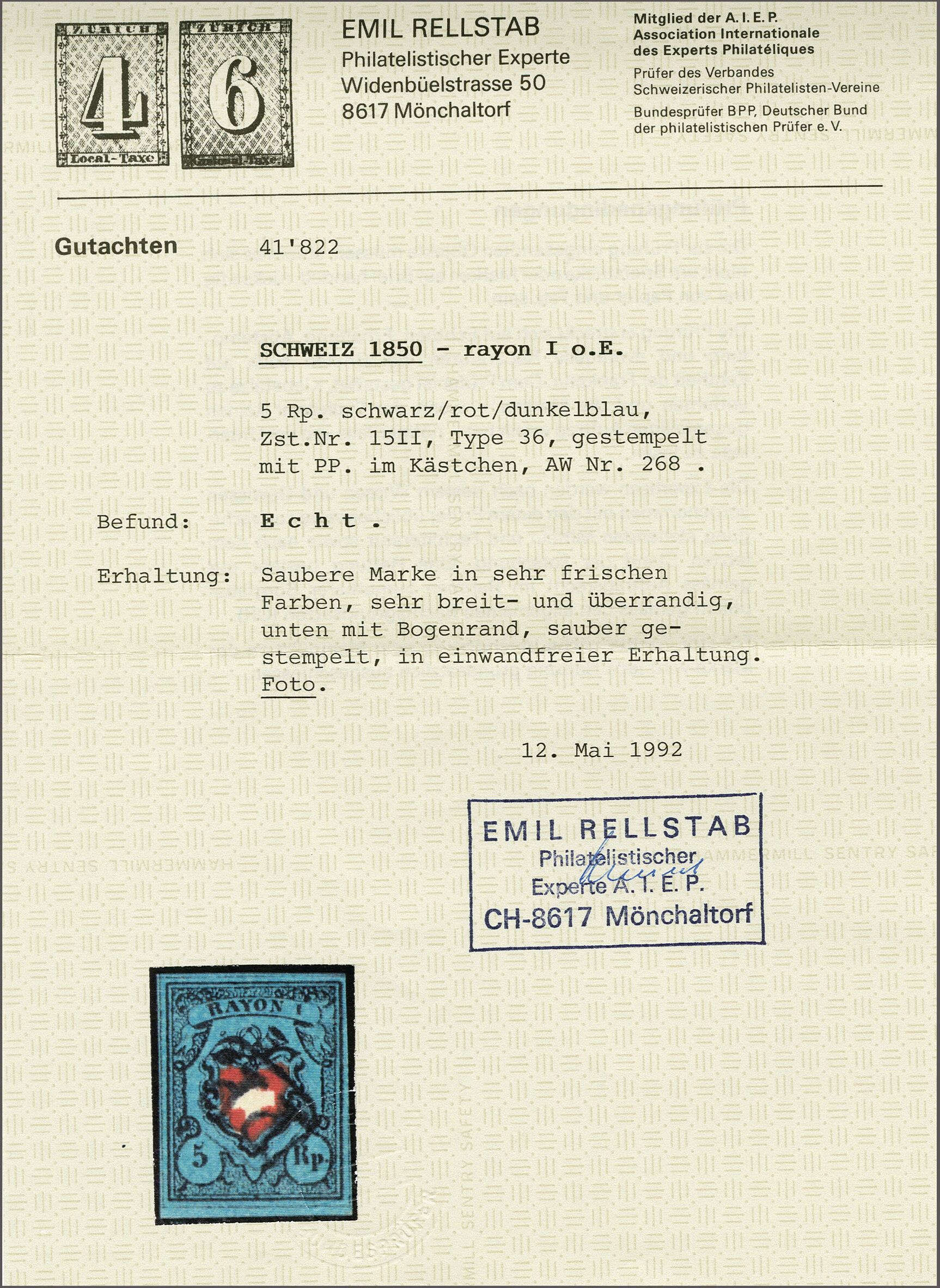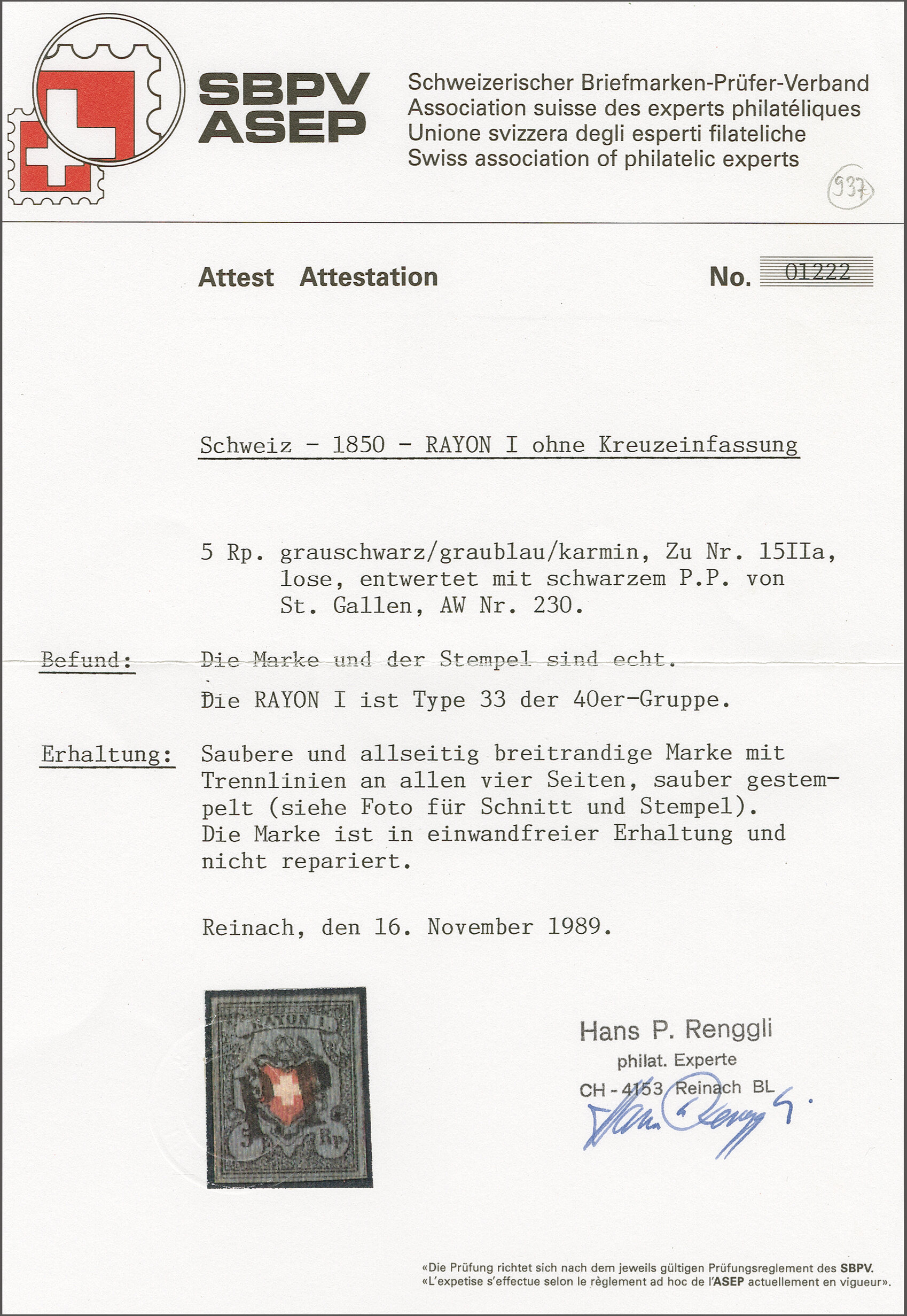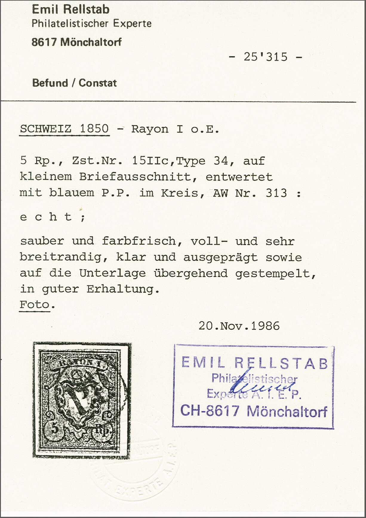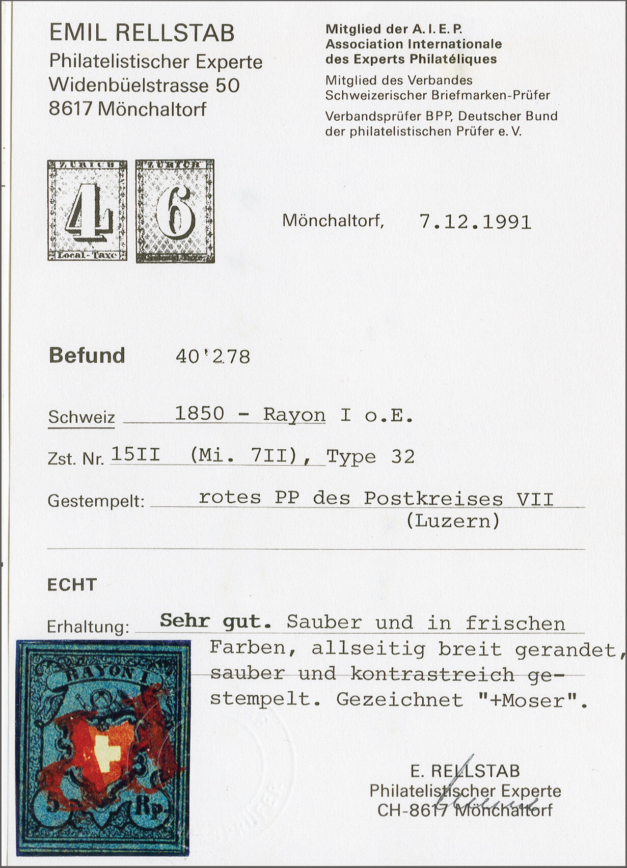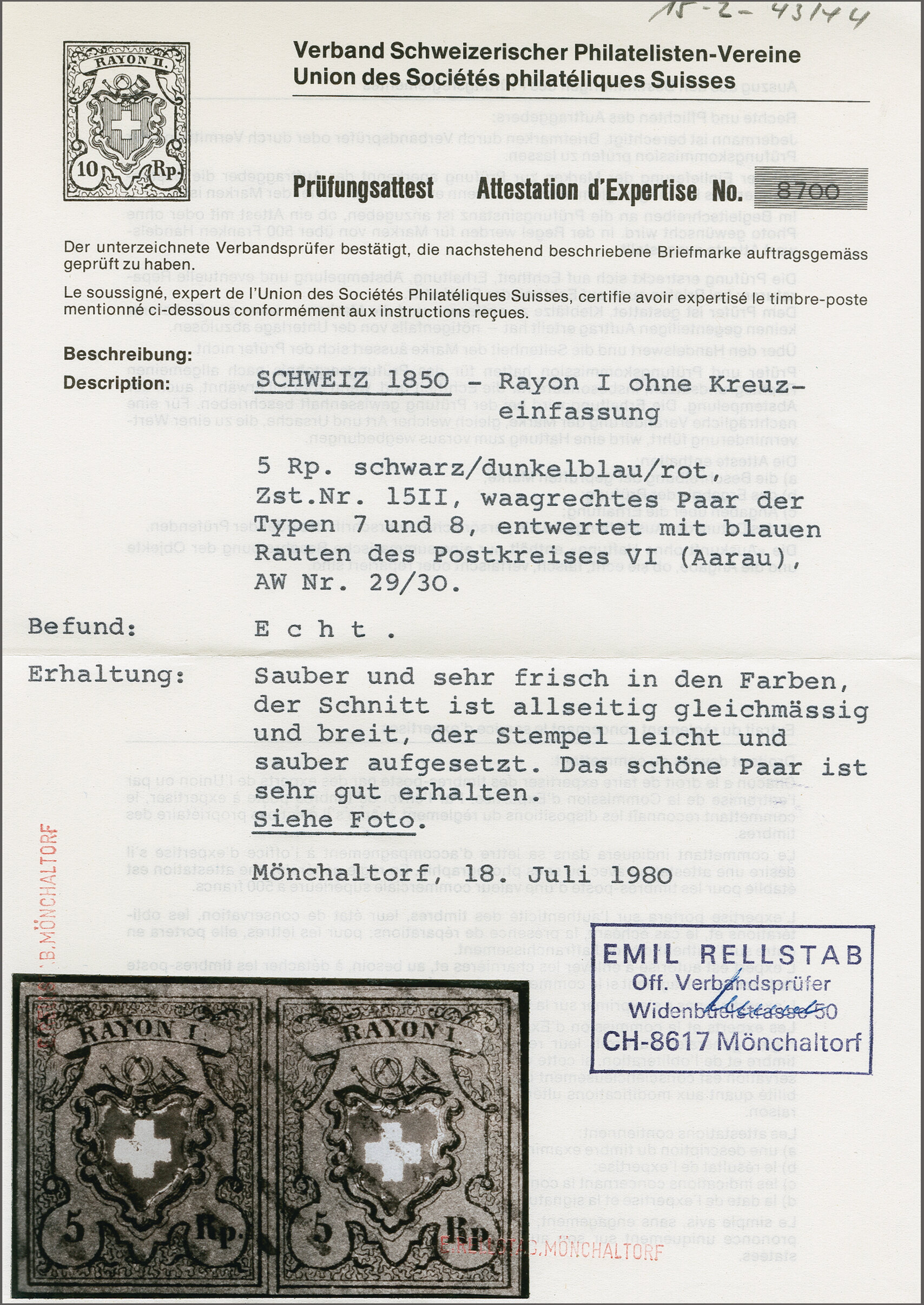 Diena & G. Bolaffi, Attest Rellstab (1989). SBK=CHF 750. (Image 1)