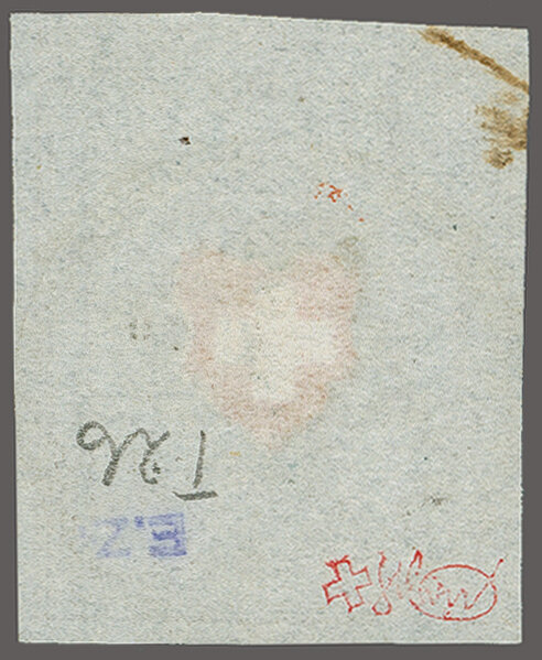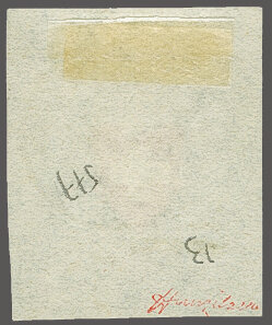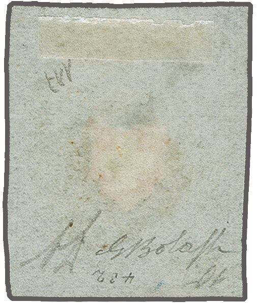 Type 34 in der ziegelroten & grauviolettblauen Nuance, farbfr. und voll- bis überrandig mit Bogenrand unten, klar und leicht übergehend entw. mit blauem P.P. im Kreis (AW 313) auf kl. Briefstück. Befund Rellstab (1986);