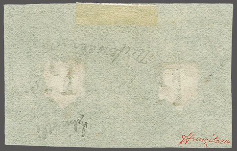 Typen 7+8 von der unteren Gruppe des seltenen Drucksteins A2 als waagr. Luxuspaar in der grünlichblauen Nuance, die linke Marke mit Spuren der Kreuzeinfassung, farbintensiv und gleichmässig breitrandig mit Bogenrand oben, je