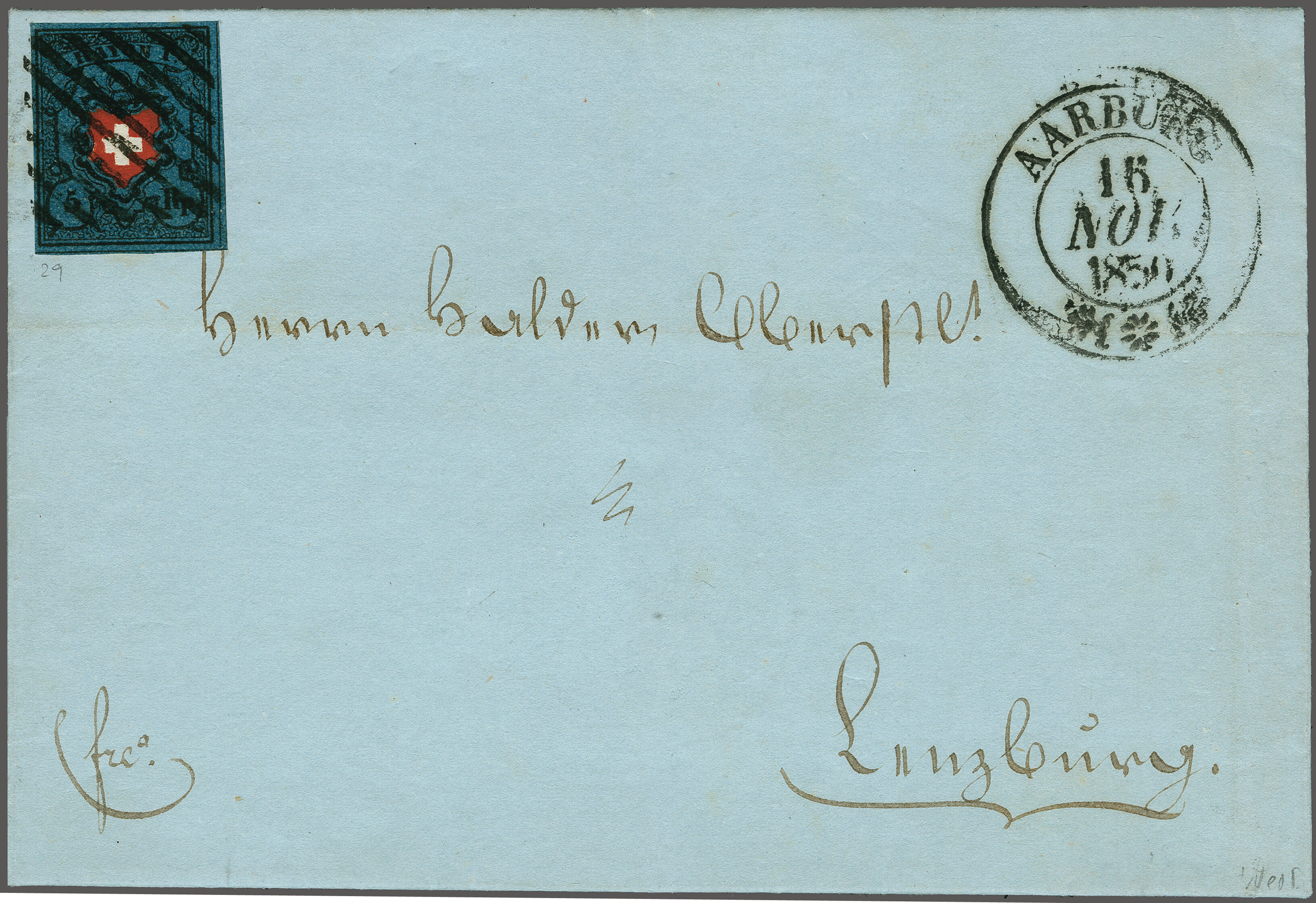 Type 29, farbintensiv und breit- bis überrandig, klar und minim übergehend entw. mit schwarzer Aargauer Raute (AW 29/30) mit nebenges. gr. Zierkreisstp. "AARBURG 16 NOV 50" auf vollständigem, frischem Faltbrief nach Lenzburg.