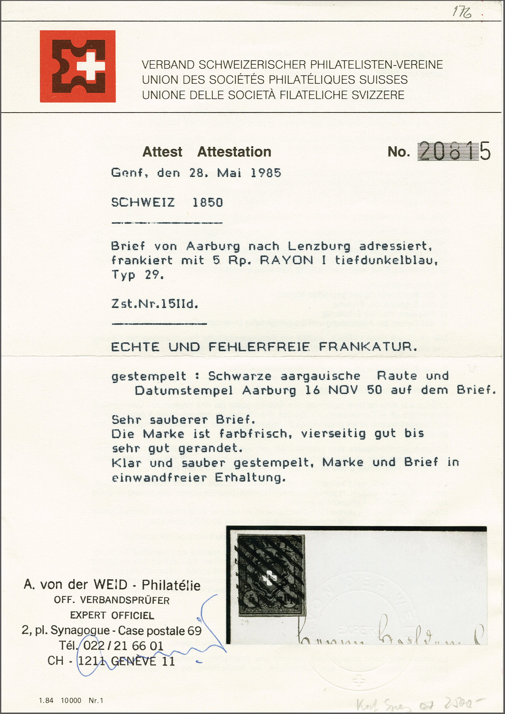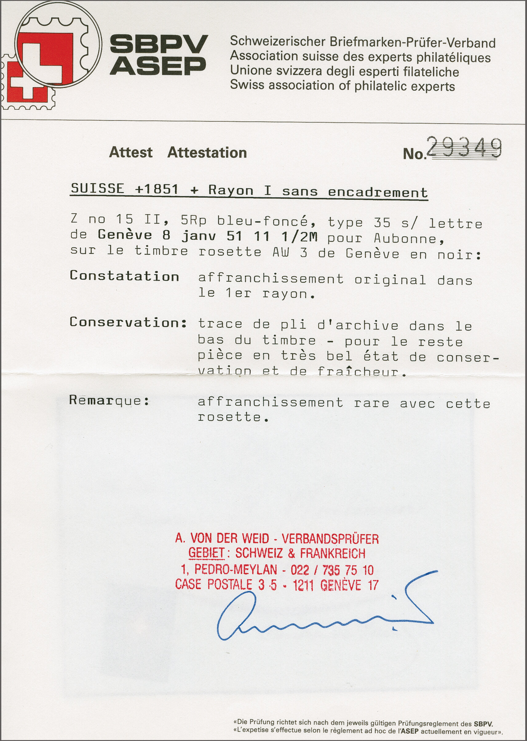 Entwertung und eine allgemein schon seltene Verwendung der Rayon I in Genf; Attest von der Weid. SBK=CHF 1'400. (Image 1)