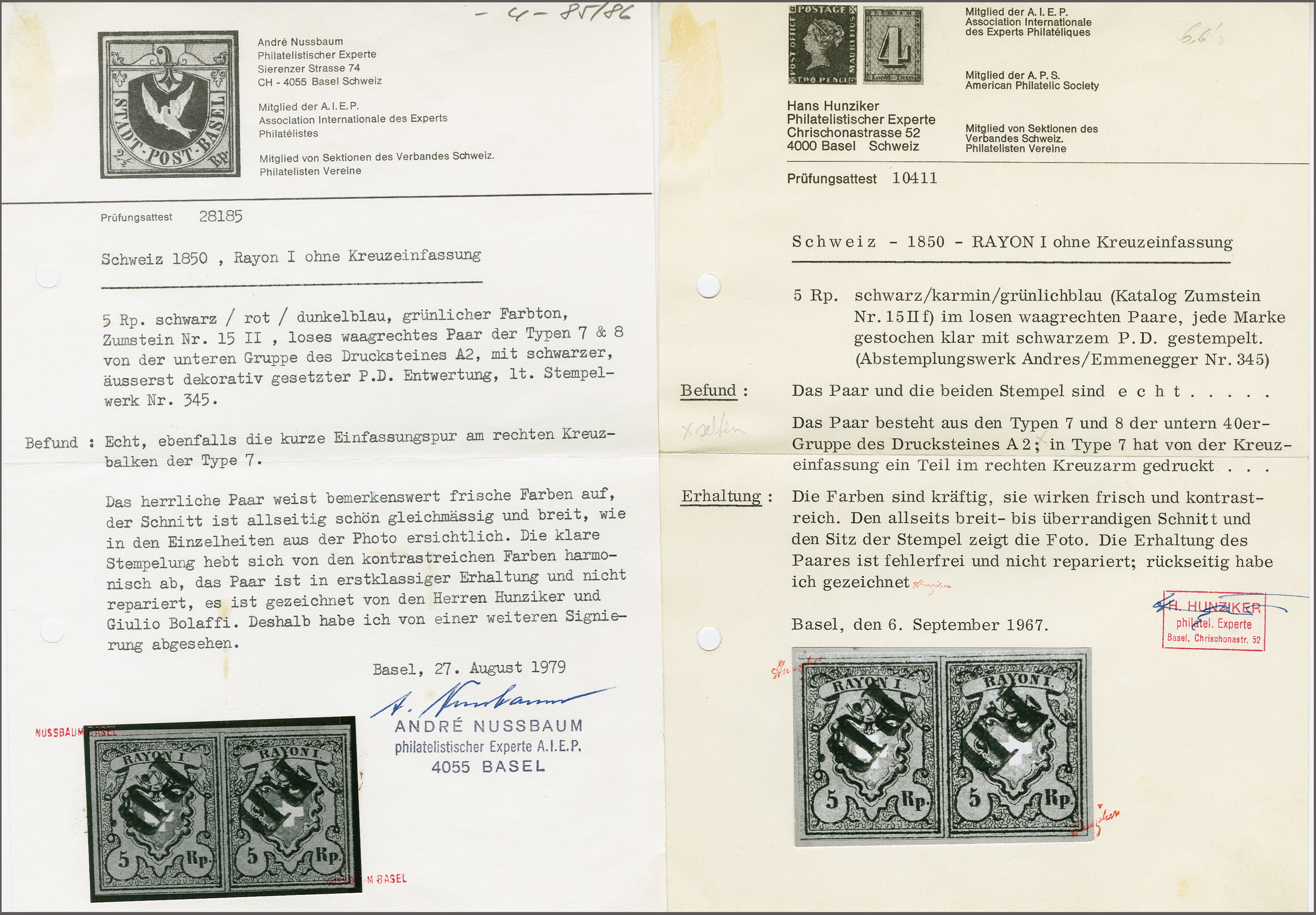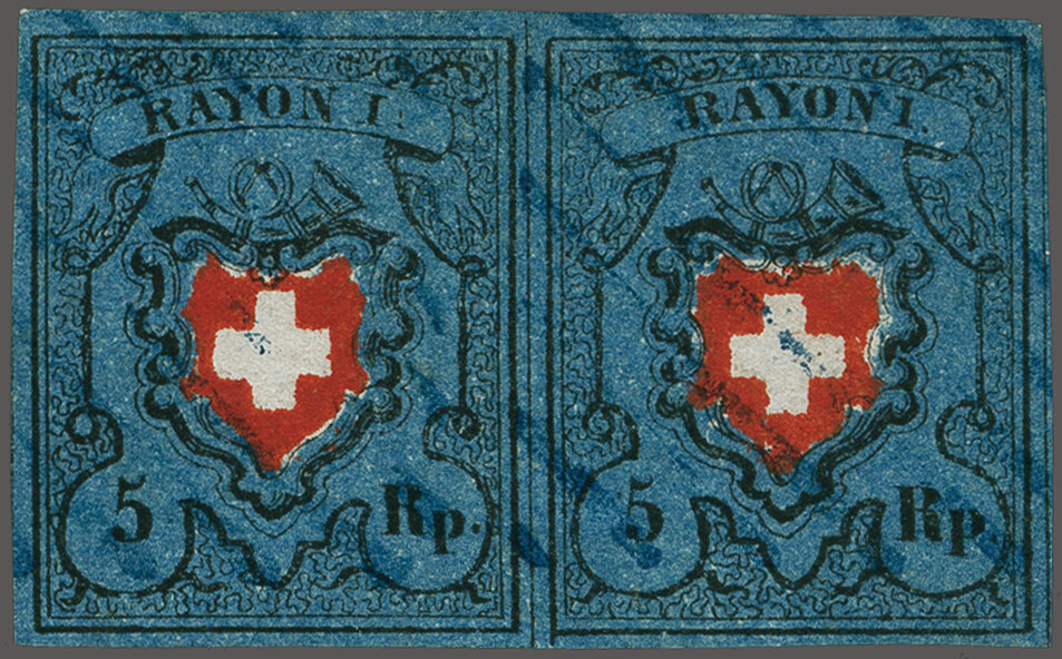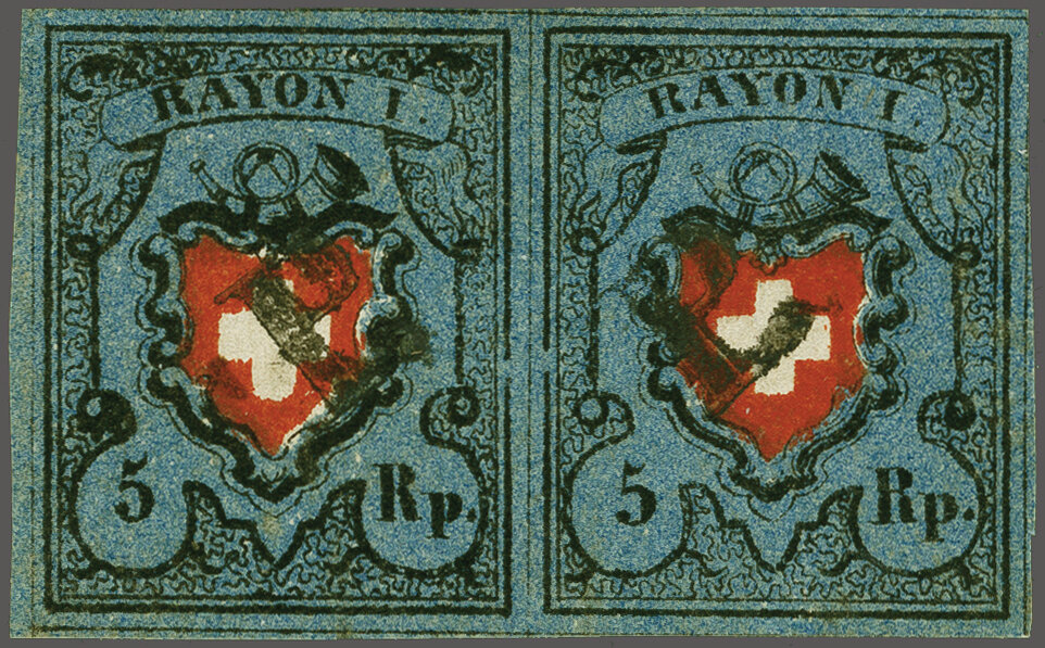 Typen 3+4 im waagr. Paar mit Bogenrand oben, farbfr. und voll- bis überrandig, je klar und zentr. entw. mit seltenem schwarzem "P." von Unterseen (AW 179). Eine Attraktive Einheit, Attest Hunziker (1965). SBK = CHF 1'900. (Image 1)