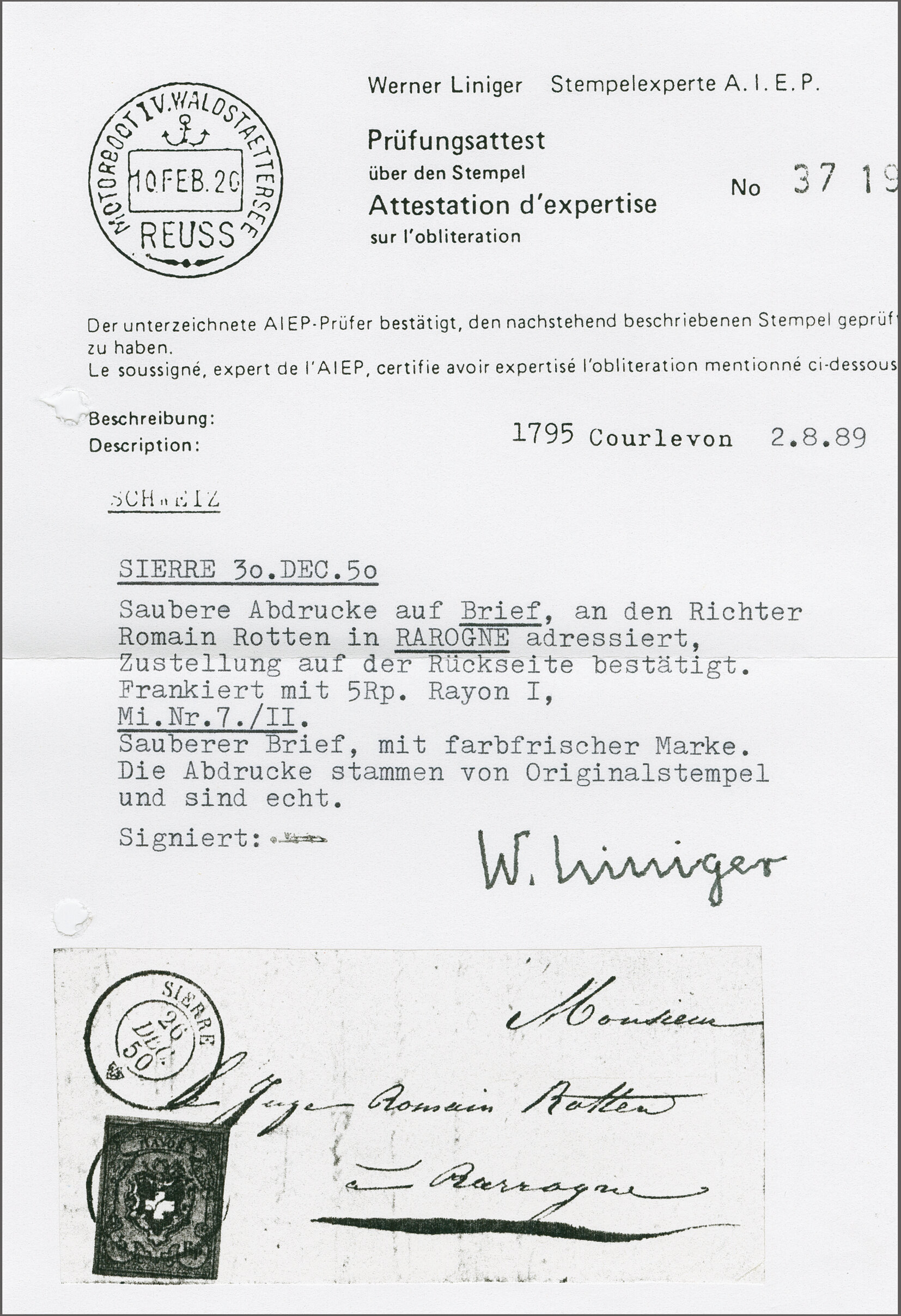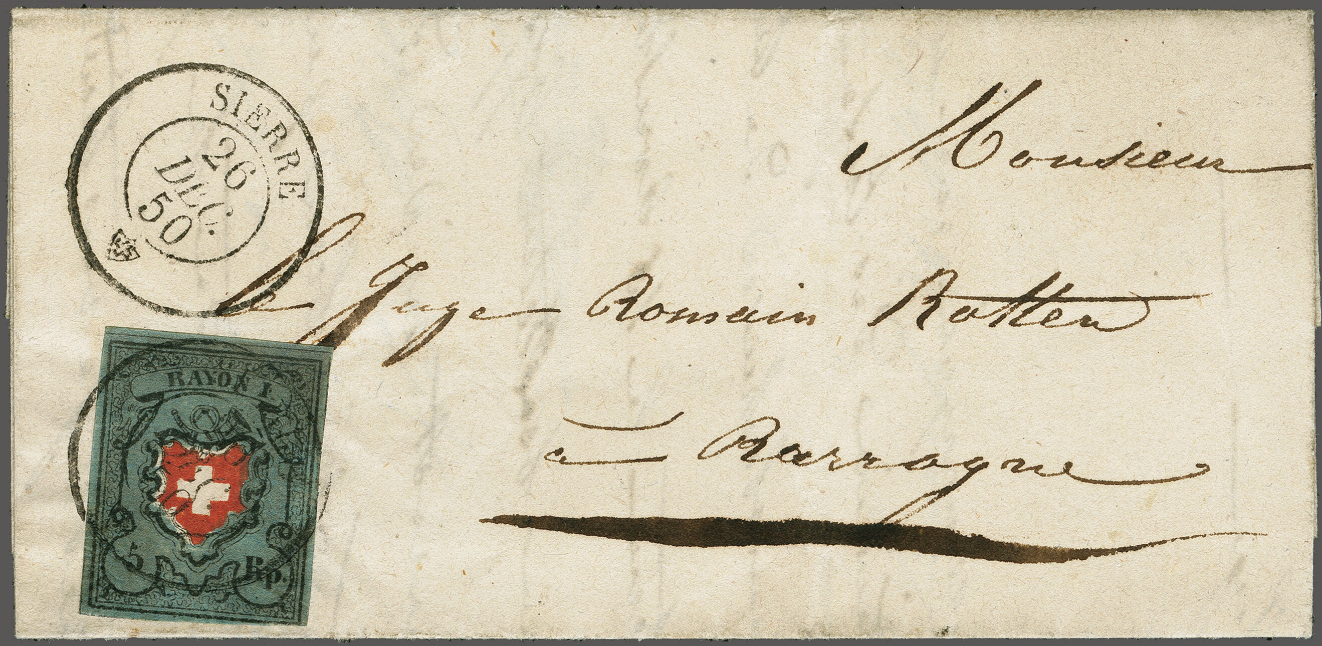 Ankunftsstp. "RAROGNE 27 DEC. 50". Eine seltene Datumstempel-Entwertung aus dem Wallis; Atteste Liniger (1989) und Eichele (2008). SBK=CHF 1'400. (Image