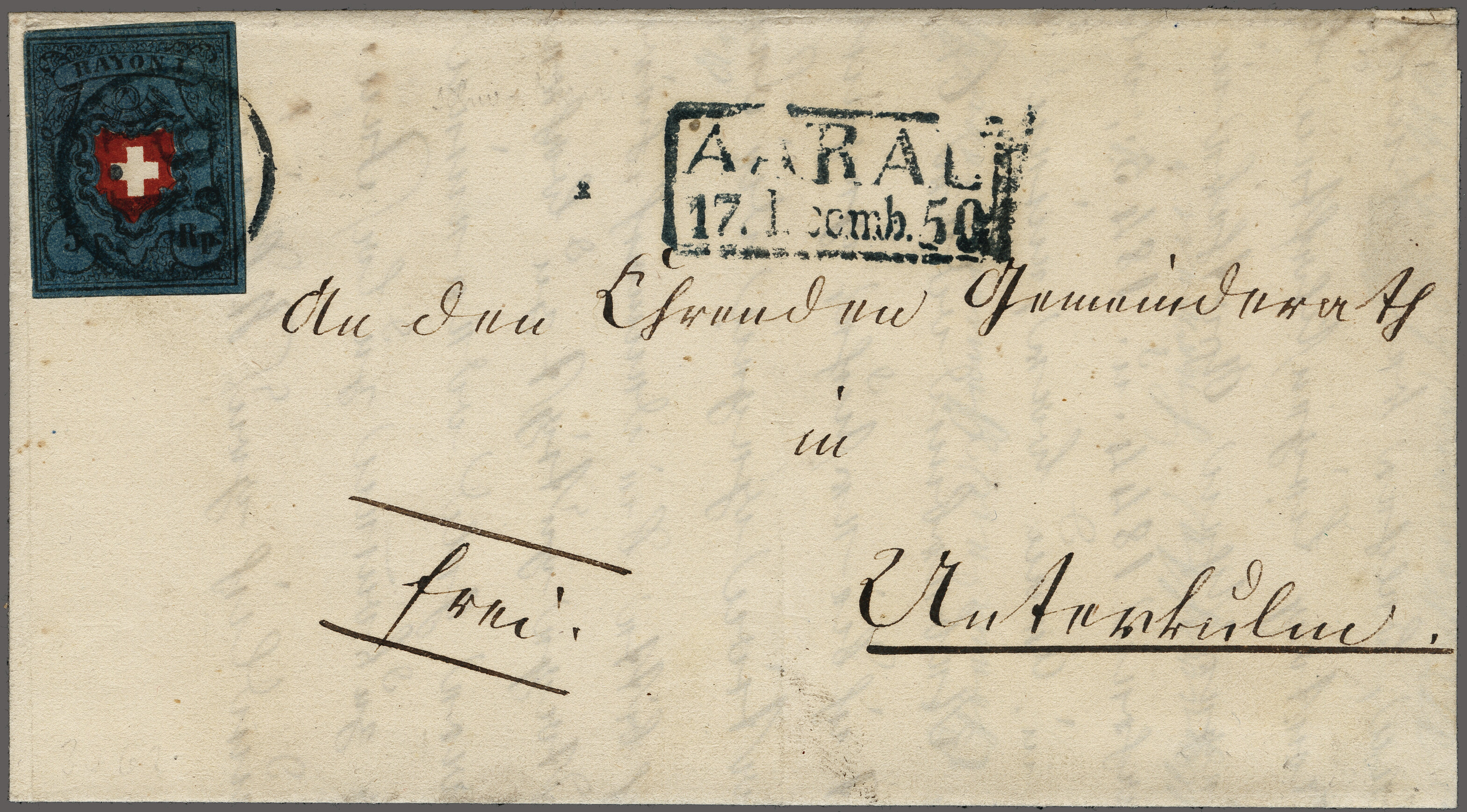 Type 31, farbfr. und gut- bis überrandig, zartklar und übergehend entw. mit schwarzem "PP" im Kreis mit nebenges. gefasstem "AARAU 17 Decemb. 50" auf vollständigem Faltbrief nach Unterkulm. Attest Marchand (2025) SBK = CHF