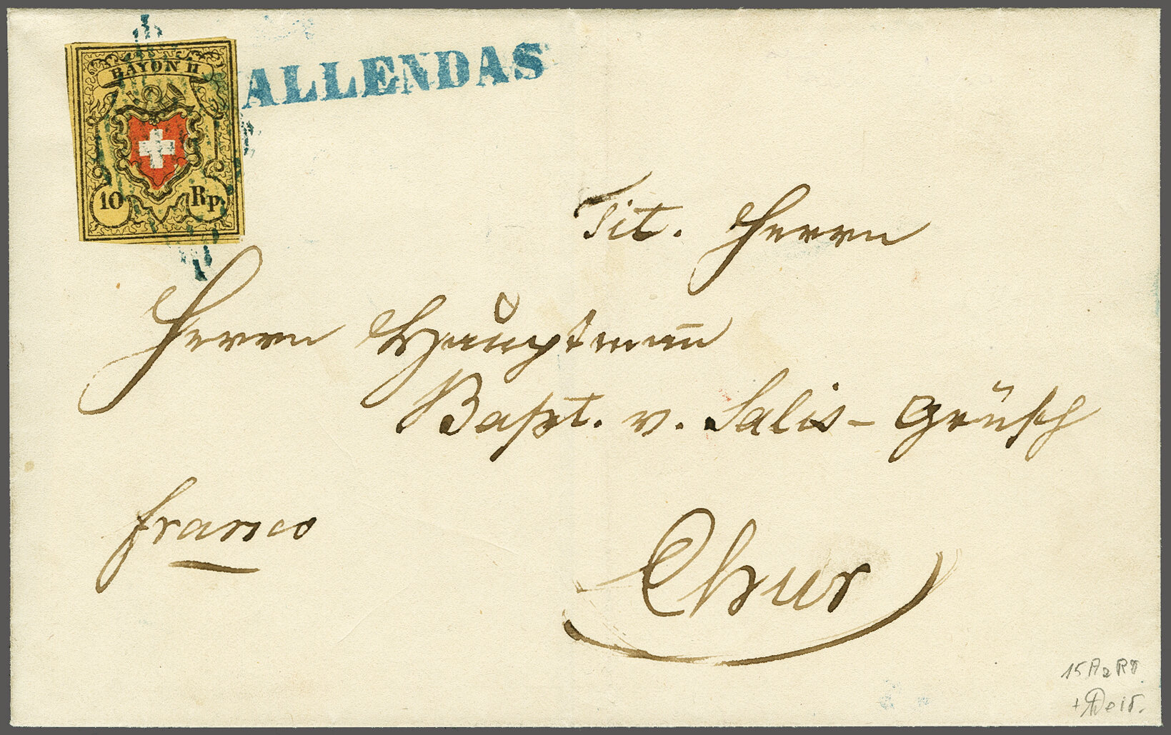 an den Hauptmann Baptist von Salis-Grüsch in Chur mit rücks. Ankunftsstp. "CHUR 8 DEC. 52". Attest von der Weid (1995) SBK = CHF 800. (Image 1)