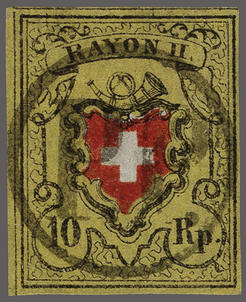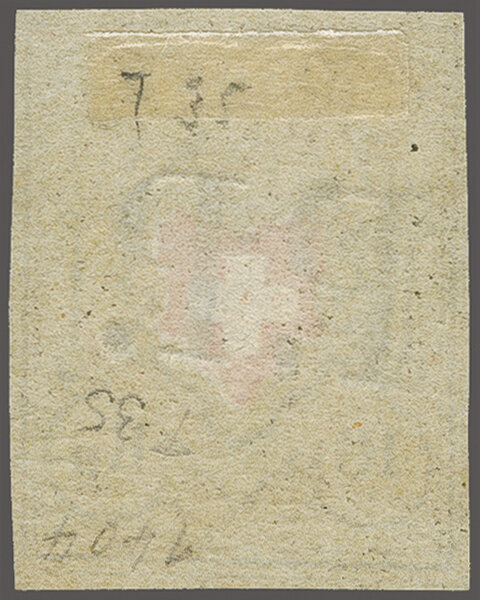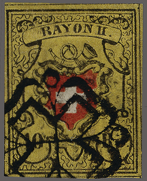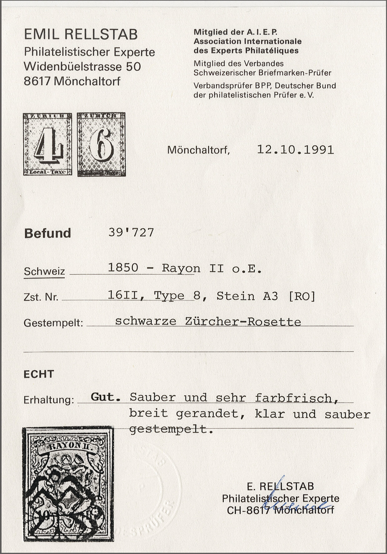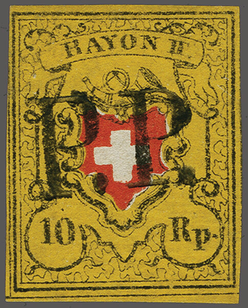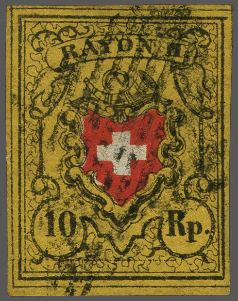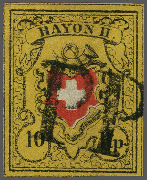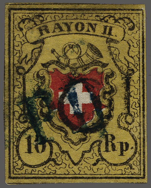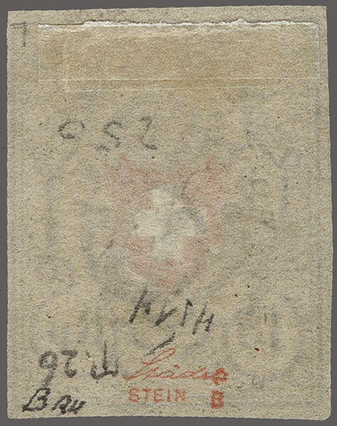 Stein B: Type 37 l/u in der bräunlichgelben Nuance mit den auf diesem Stein öfters vorkommenden Retouchen der Wappeneinfassung, farbfr. und regelmässig breitrandig, zartklar und voll aufgesetzt entw. mit schwarzem Stabstempel