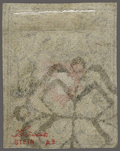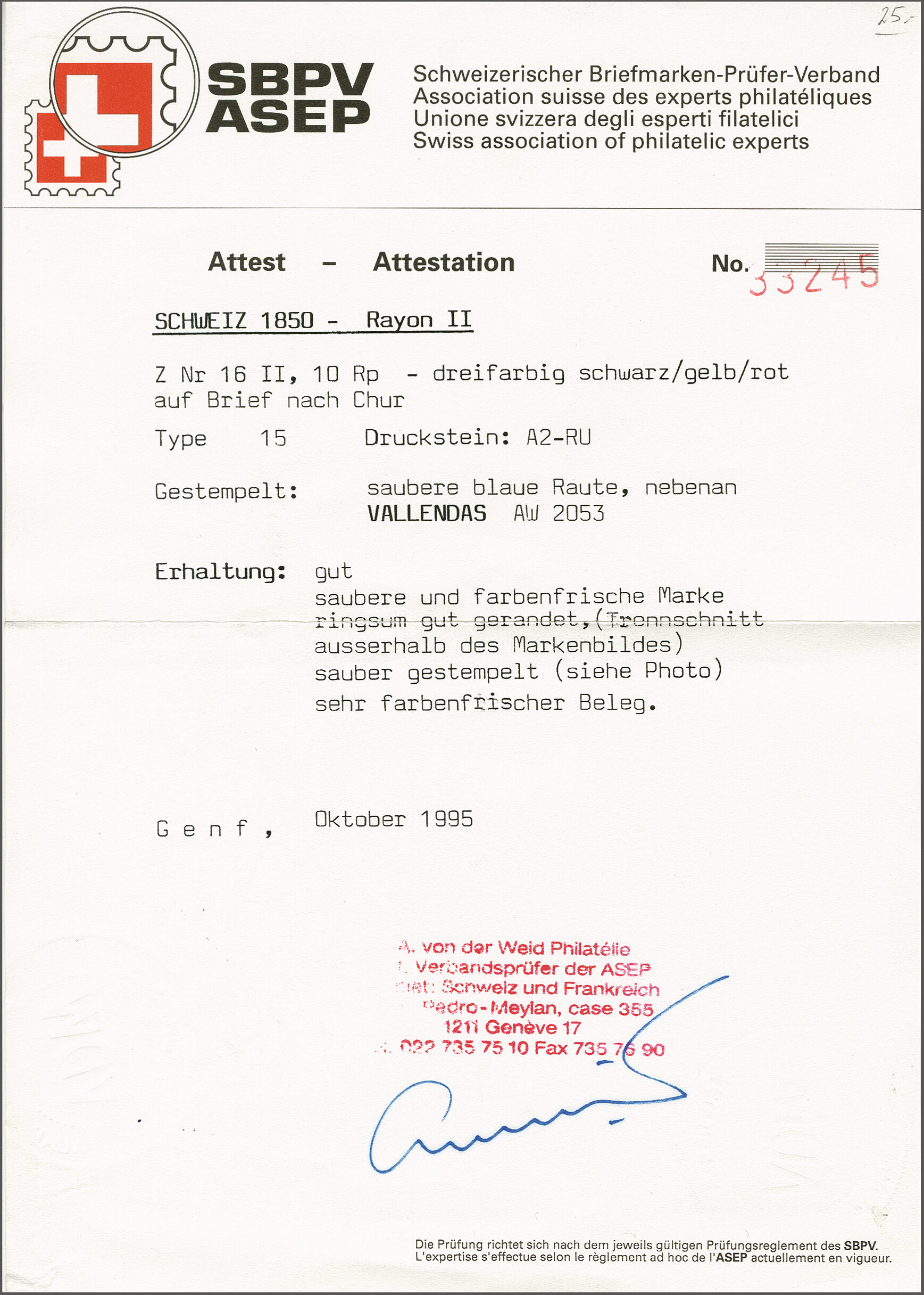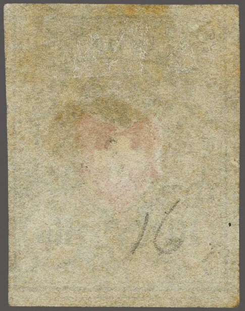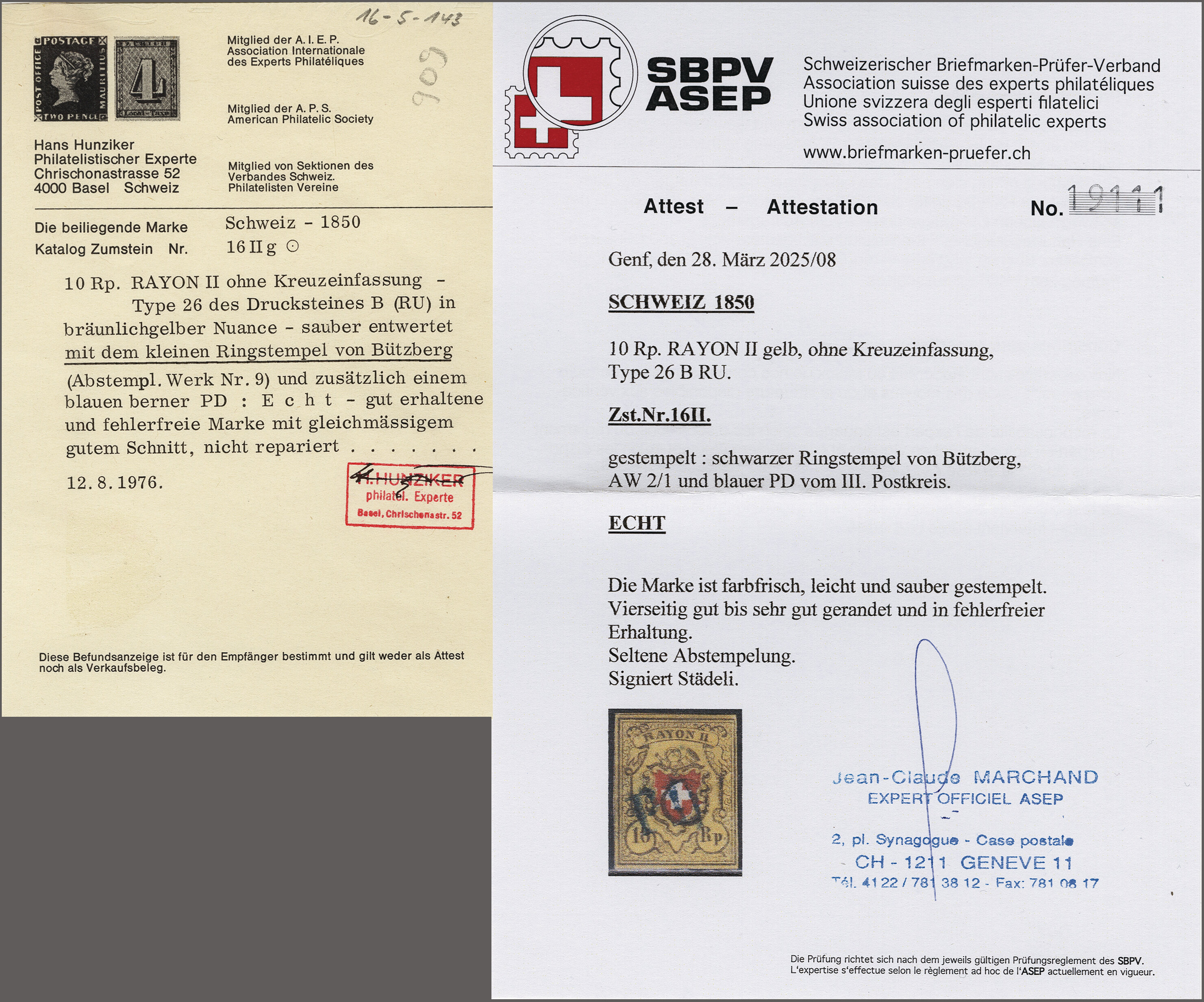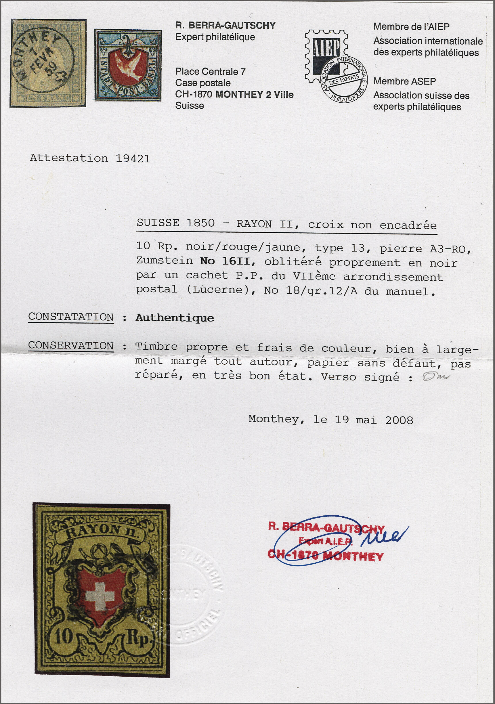 Stein B: Type 37 l/u in der bräunlichgelben Nuance mit den auf diesem Stein öfters vorkommenden Retouchen der Wappeneinfassung, farbfr. und regelmässig breitrandig, zartklar und voll aufgesetzt entw. mit schwarzem Stabstempel