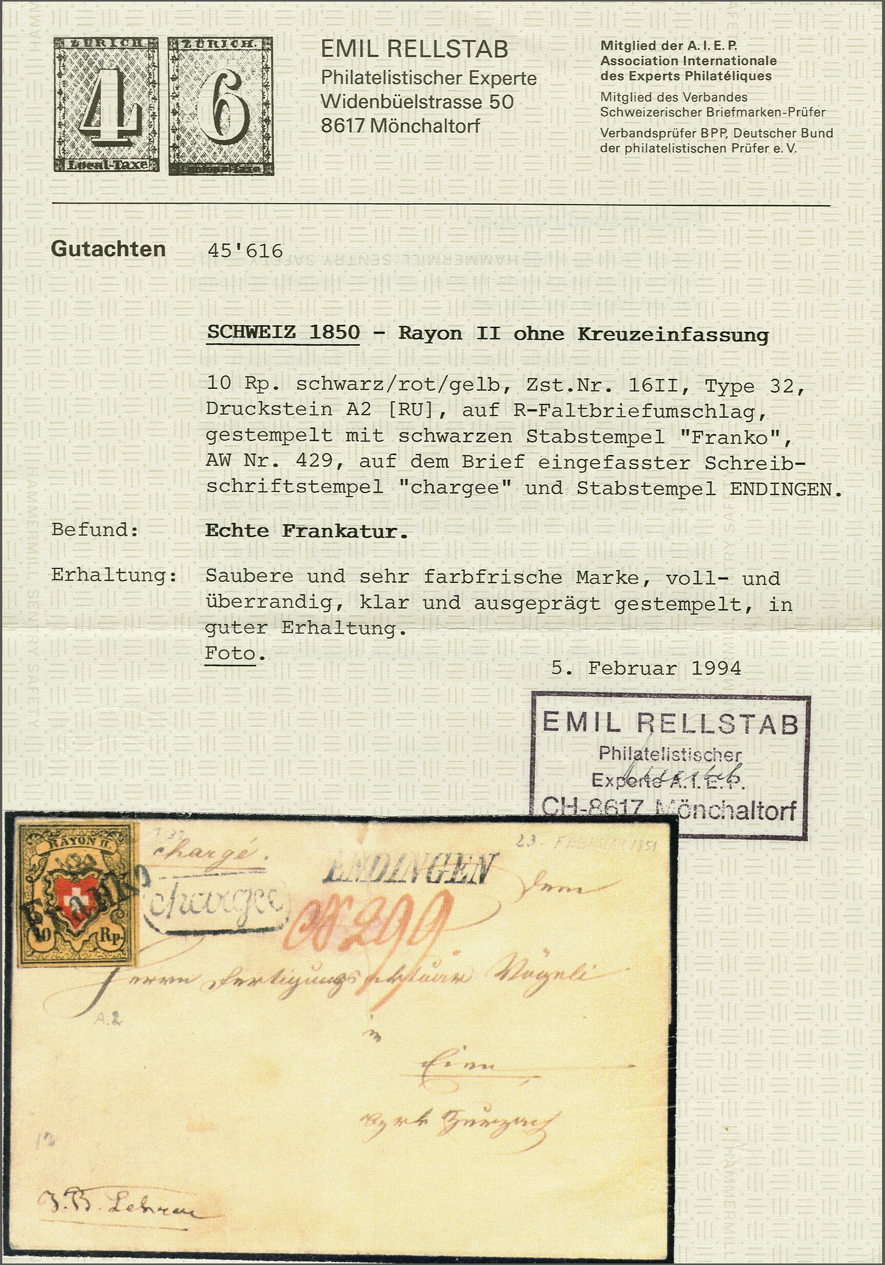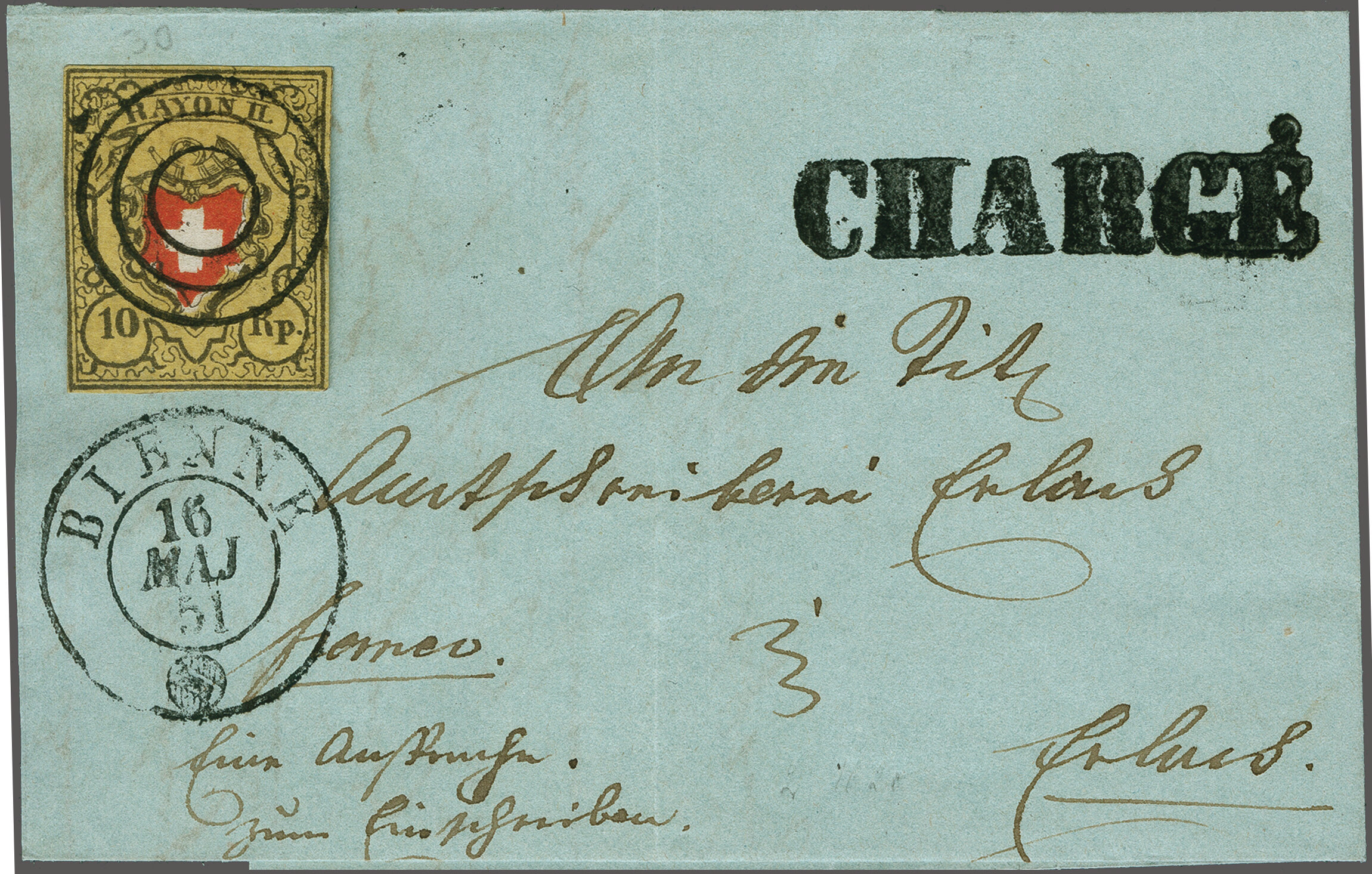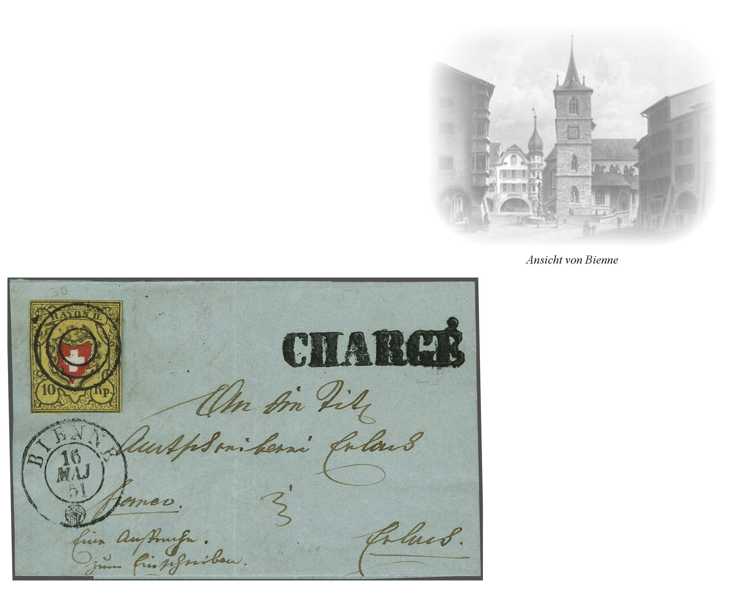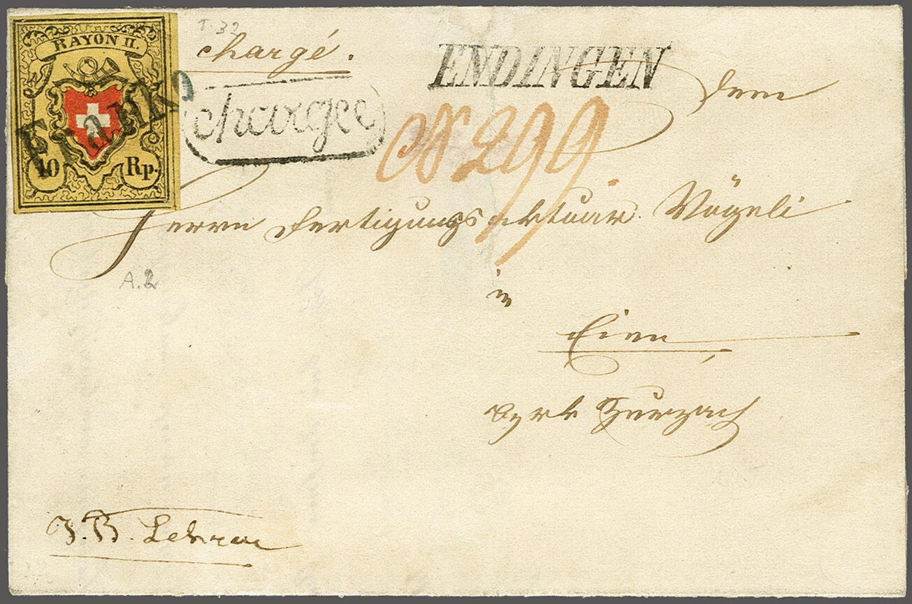 gefasstem Schreibschriftstp. "chargee", beide in schwarz, auf vollständigem Einschreibebrief (verklebter Einriss) im 1. Briefkries nach Eien bei Zurzach. Rücks. Transitstp. "ZURZACH 23 FEVR. 1851". Ein dekorativer und charakteristischer Aargauer