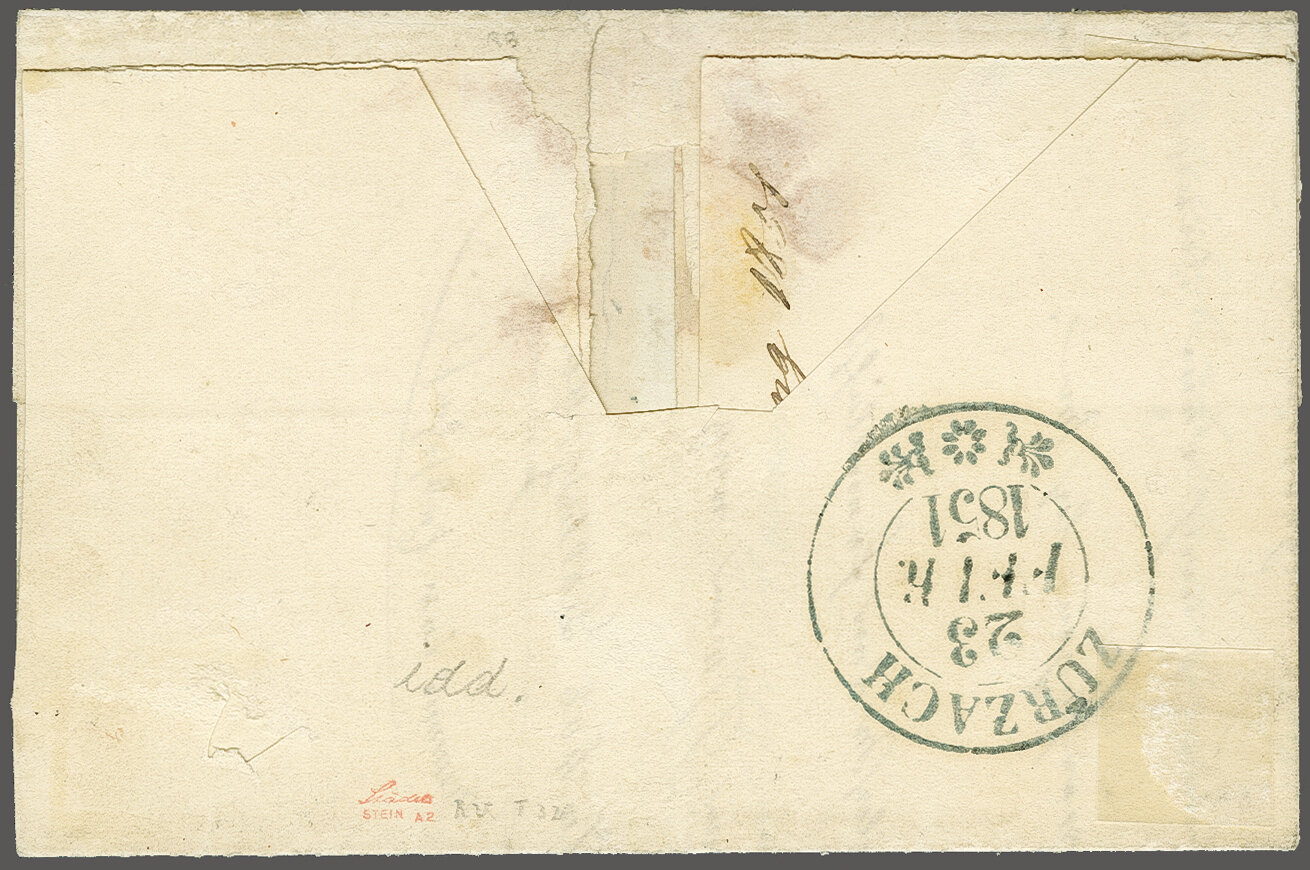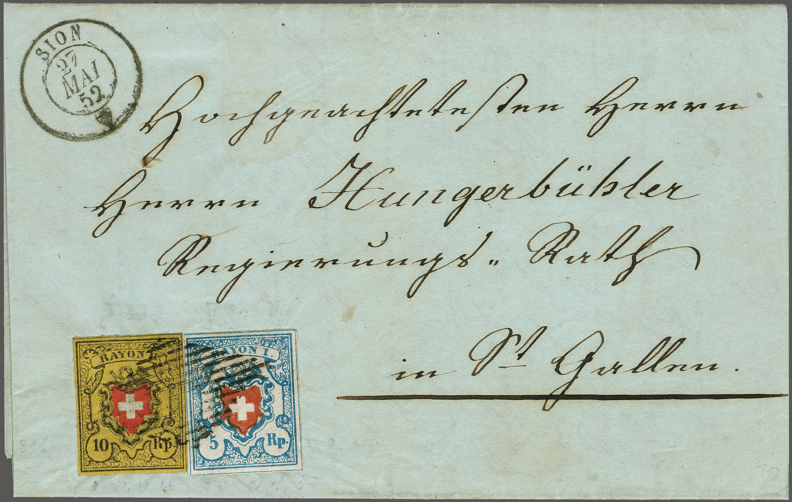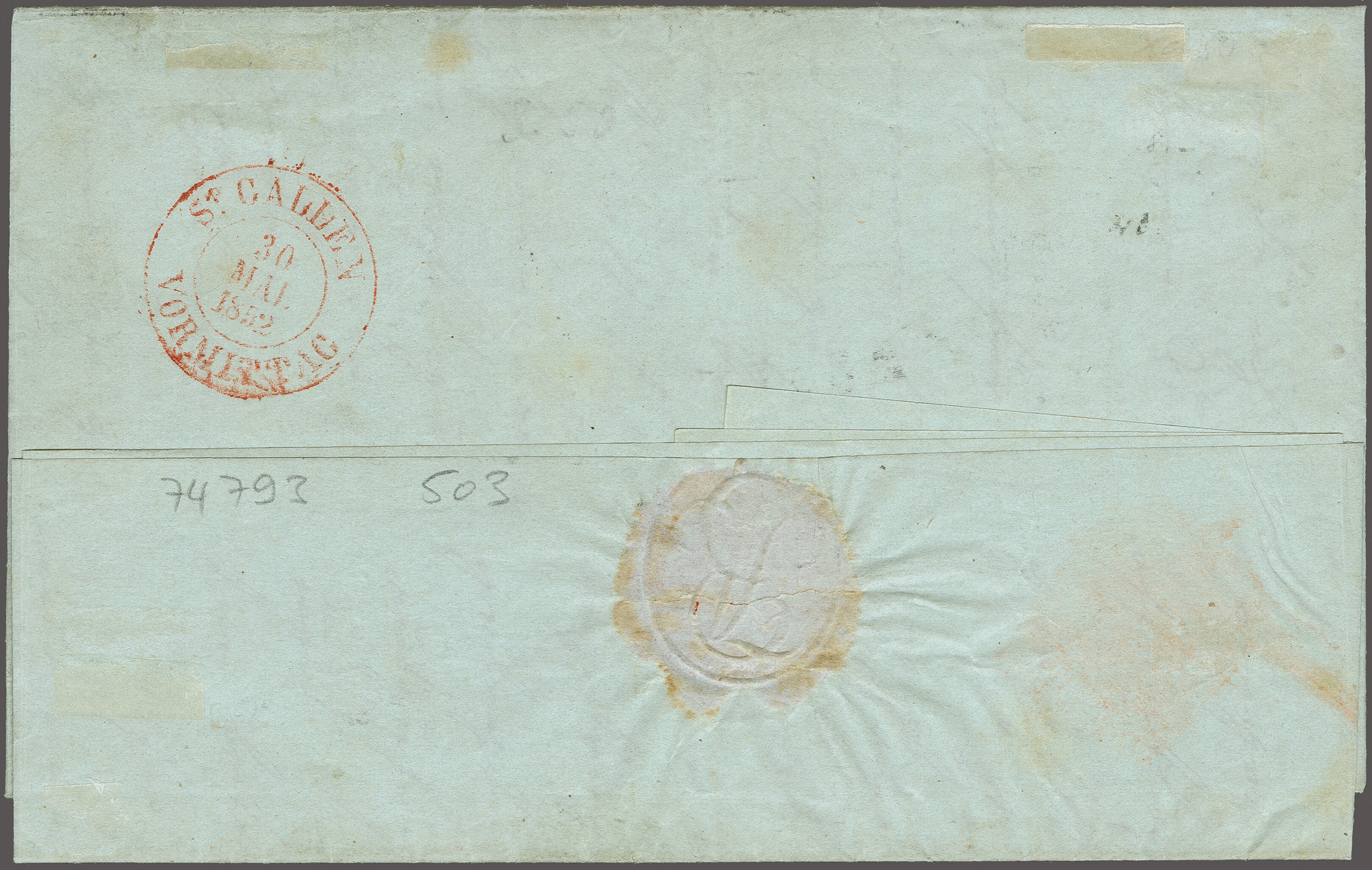 derselben Farbe auf vollständigem Faltbrief im 3. Briefkreis an den "hochgeachtetesten Herrn" Regierungsrat Hungerbühler in St. Gallen. Rücks. Ankunftsstp. "St. GALLEN 39. MAI 1852 VORMITTAG" in rot. Eine interessante und ungewöhnliche Kombination