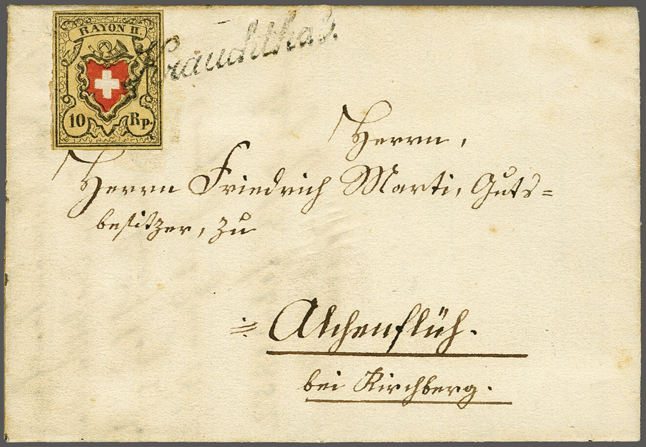Stein A2: Type 27 l/u, farbfr. und voll- bis überrandig, dekorativ und übergehend entw. mit schwarzem kursivem Schreibschriftstp. Krauchthal (AW 3255) auf vollständigem Faltbrief, inwendig datiert "11. Februar 1852" nach