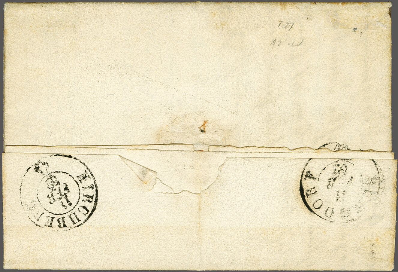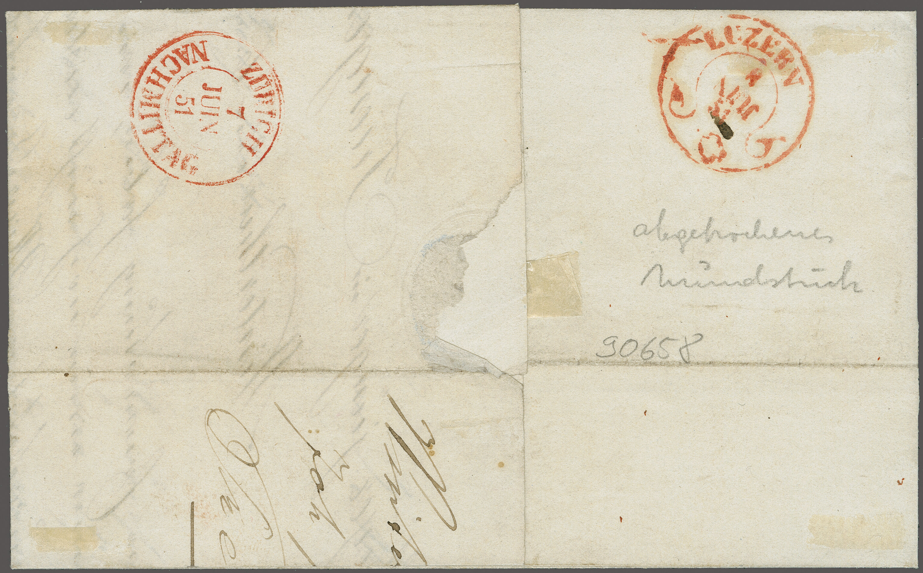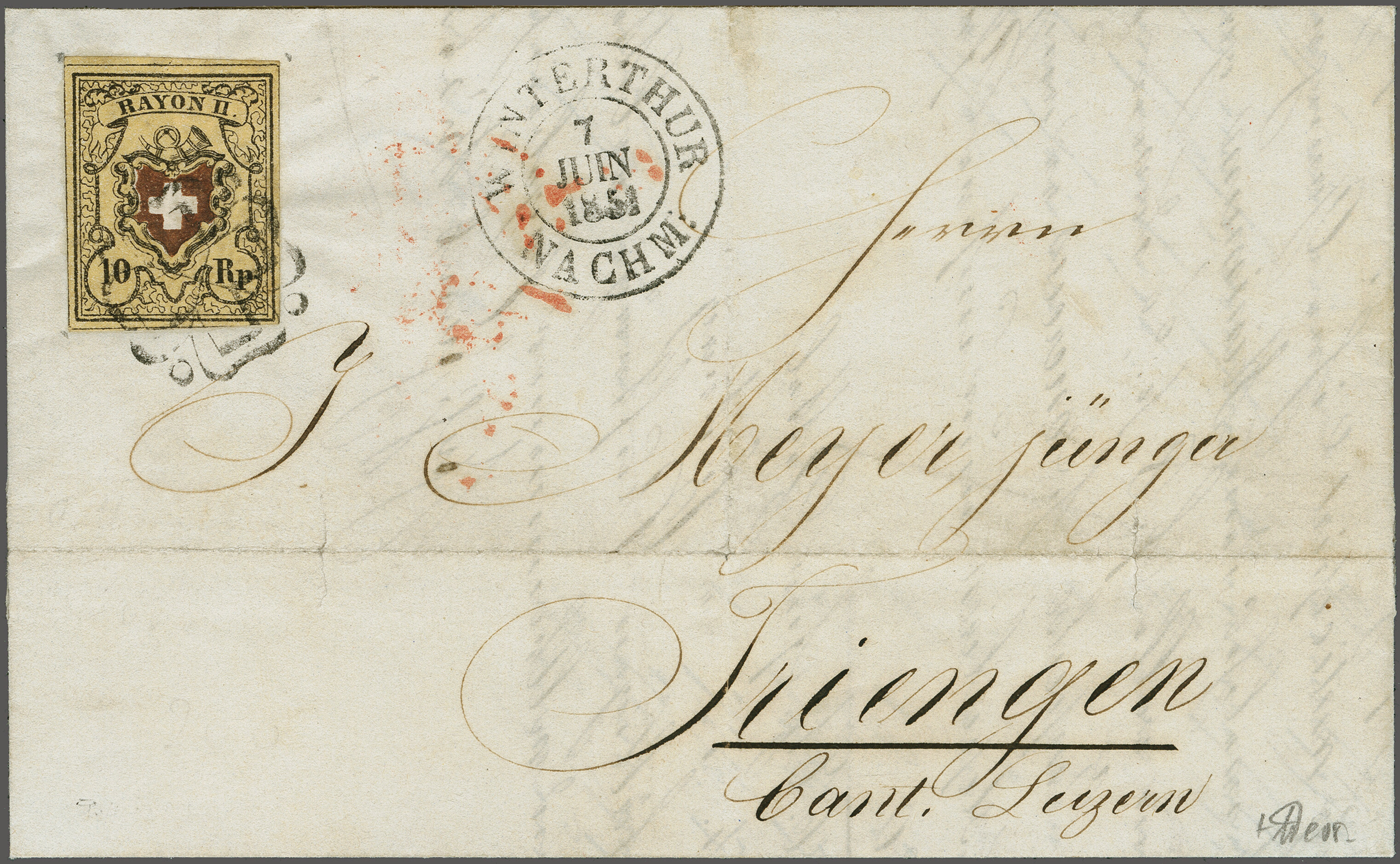 schwarzer Zürcher Rosette (AW 1) und nebenges. kl. Zweikreisstp. "WINTERTHUR 7 JUIN 1851 NACHM:" auf vollständigem Faltbrief im 2. Briefkreis nach Triengen (LU). Rücks. Transitstp. "ZÜRICH 7 JUIN 51 NACHMITTAG" und "LUZERN 8 JUIN 51", beide in rot.