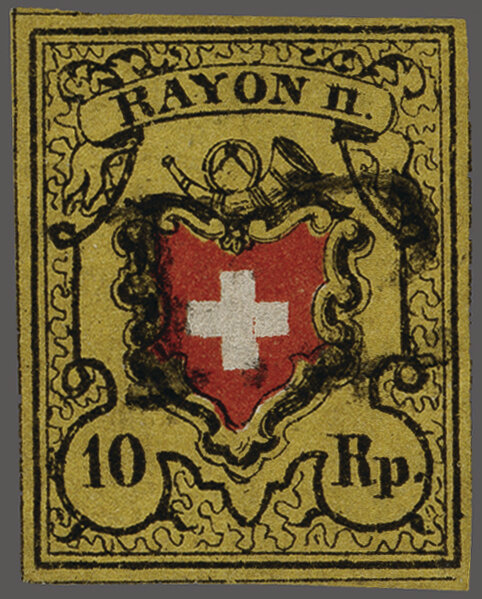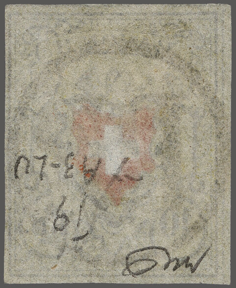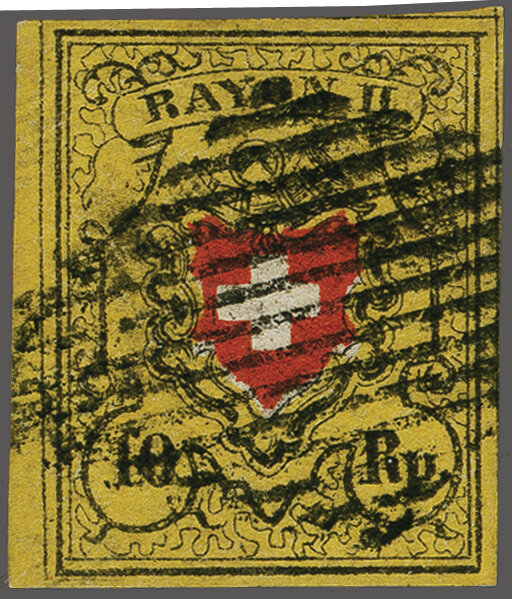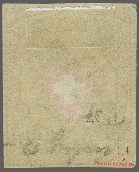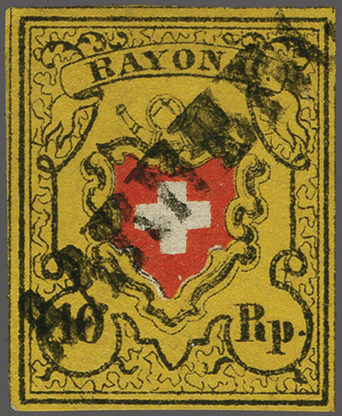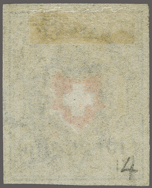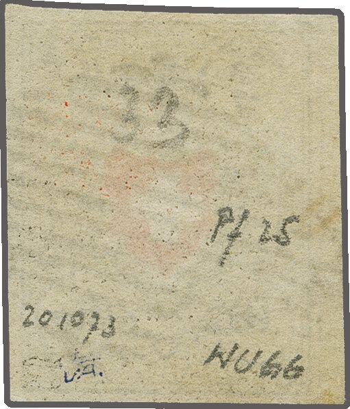 Stein B: Type 33 r/o mit Plattenfehler "Linienkreuz" und "Stecherzeichen (Anstrich am "R" von "Rp.")", farbfr. und gut- bis überrandig mit Gruppenabstand unten, leicht entw. mit schwarzer eidg. Raute. Ein markanter und
