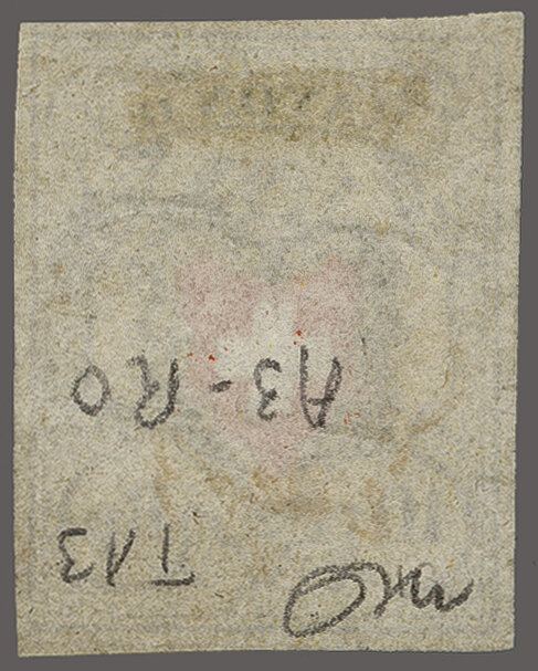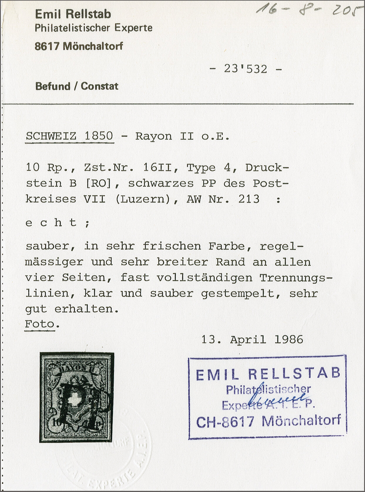 Stein B: Type 4 r/o, farbfr. und regelmässig sehr breitrandig geschnitten, zartklar entw. mit schwarzem "PP" des Postkreises Luzern (AW 213). Befund Rellstab (1986). (Image 1)