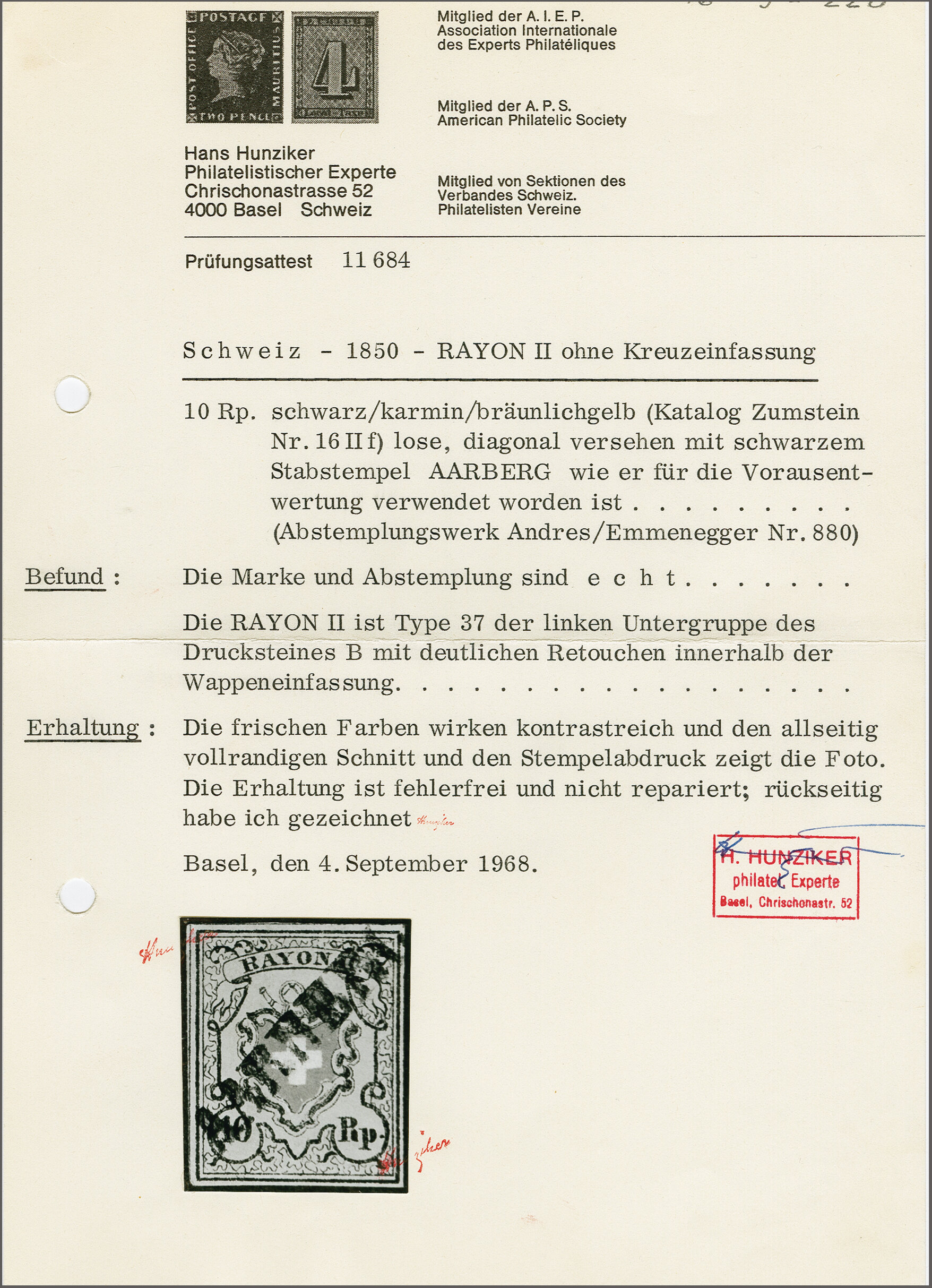 "AARBERG" (AW 880). Attest Hunziker (1968). (Image 1)