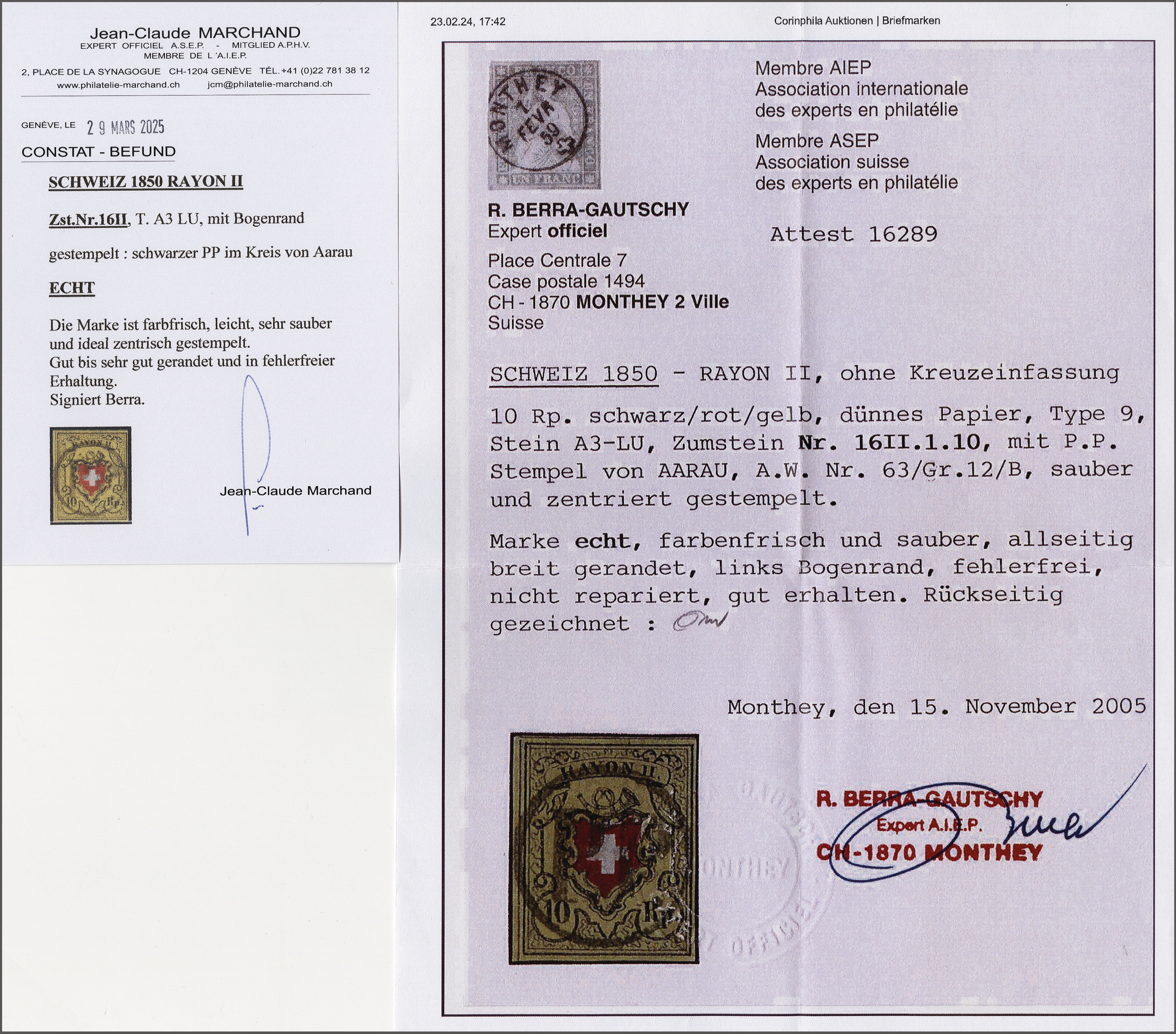 Stein A3: Type 9 l/u, farbfr. und sehr gut- bis überrandig mit Bogenrand links, zart und zentr. entw. mit schwarzem "P.P." im Kreis von Aarau (AW 315). Signiert Berra-Gautschy, Befund Marchand (2025). SBK = CHF 750. (Image 1)