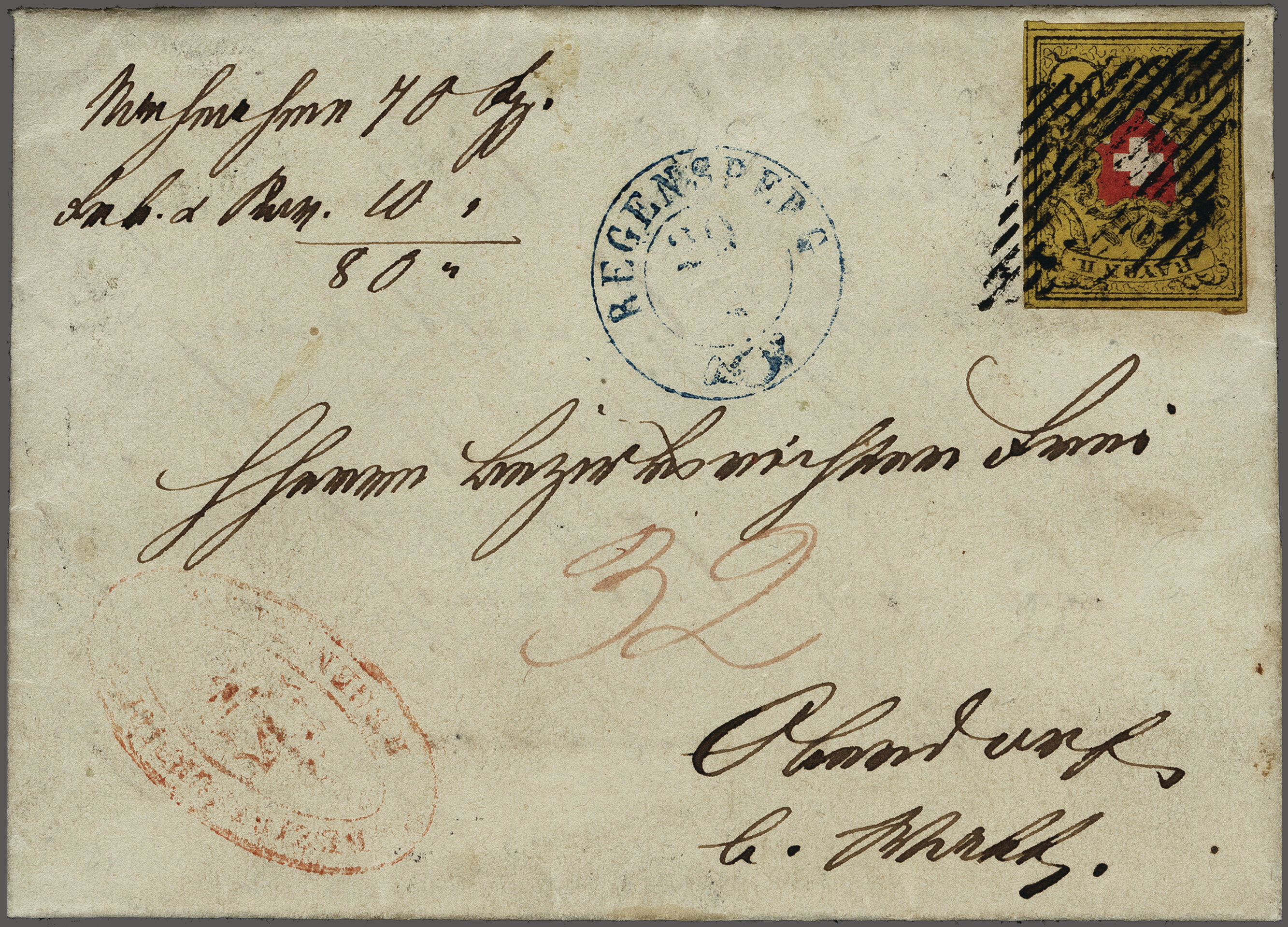 Stein A2: Type 38 r/u, farbintensiv und gut- bis überrandig mit Bogenrand unten, klar und übergehend entw. mit schwarzer eidg. Raute mit nebenges. Bruchstp. "REGENSPERG 29/8 (AW 5840) in blau als 5 Rp.-Porto für den 1.