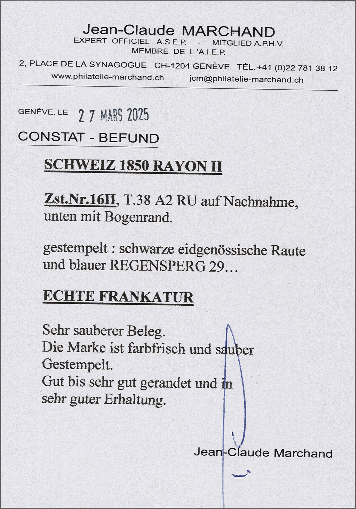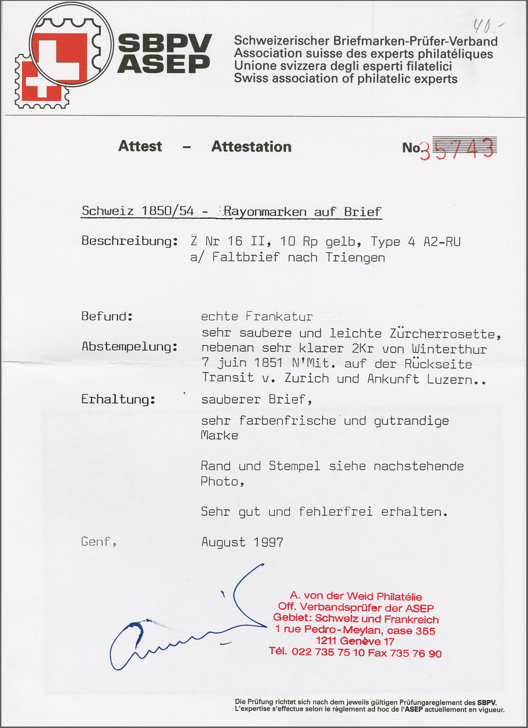 Einschreibebrief, signiert Städeli, Attest Rellstab (1994). (Image 1)