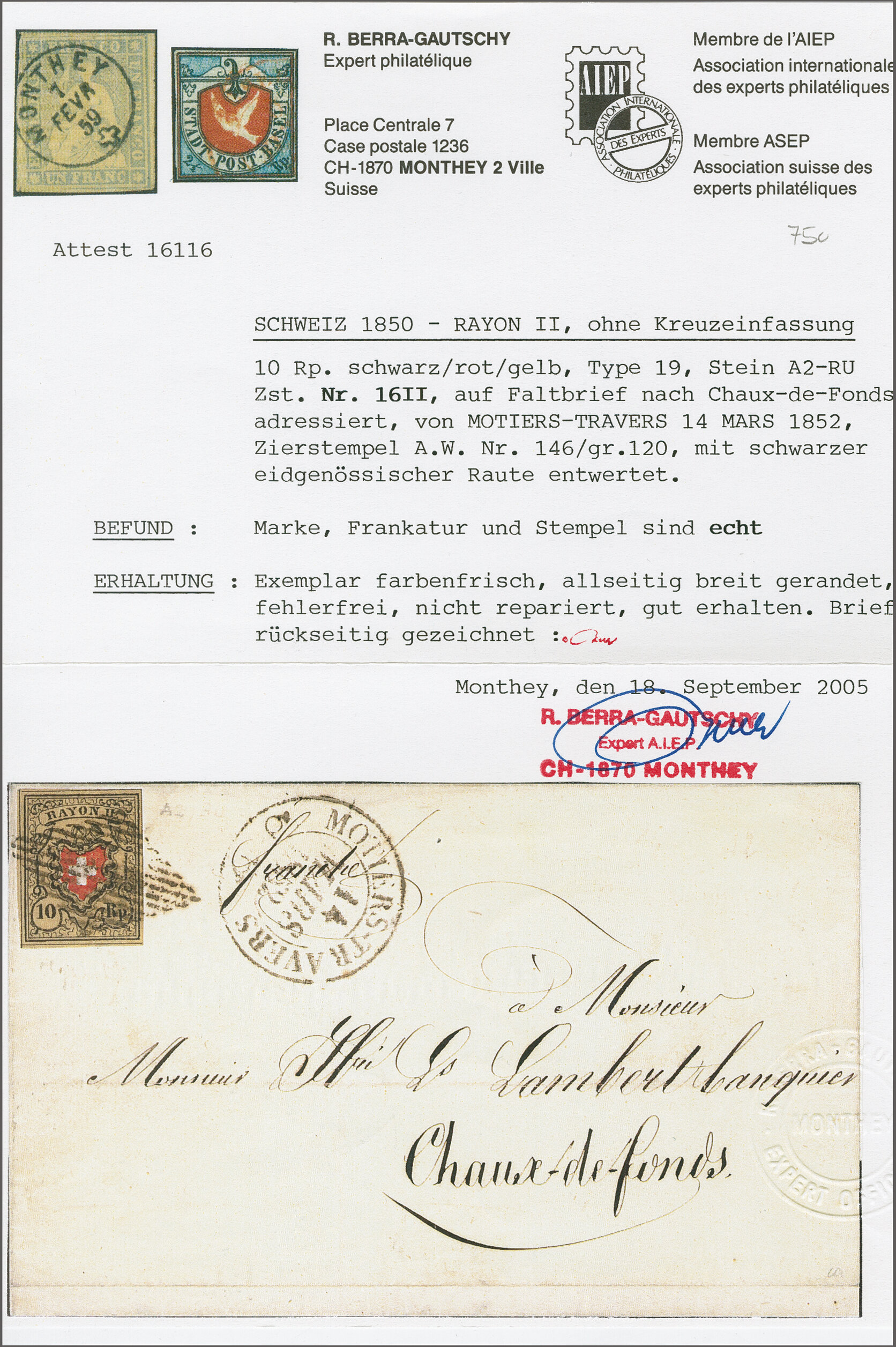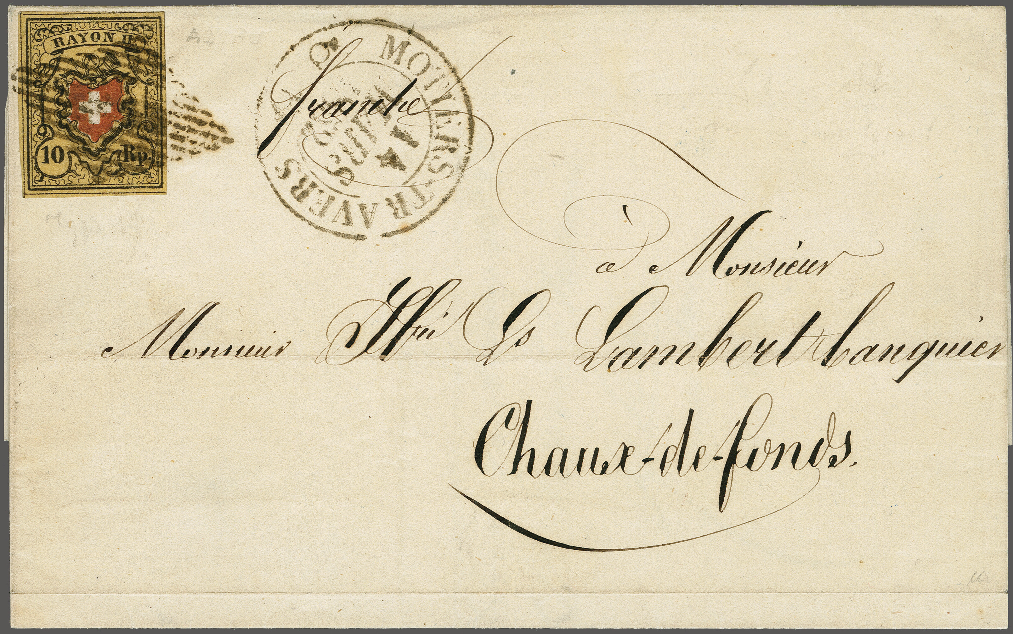 Stein A2: Type 10 r/u, farbfr. und breit- bis überrandig, klar und übergehend entw. mit schwarzer eidg. Raute und nebenges. gr. Zierkreisstp. "MOTIERS-TRAVERS 14 MARS 1852" auf Faltbriefhülle nach La Chaux-de-Fonds. Rücks.