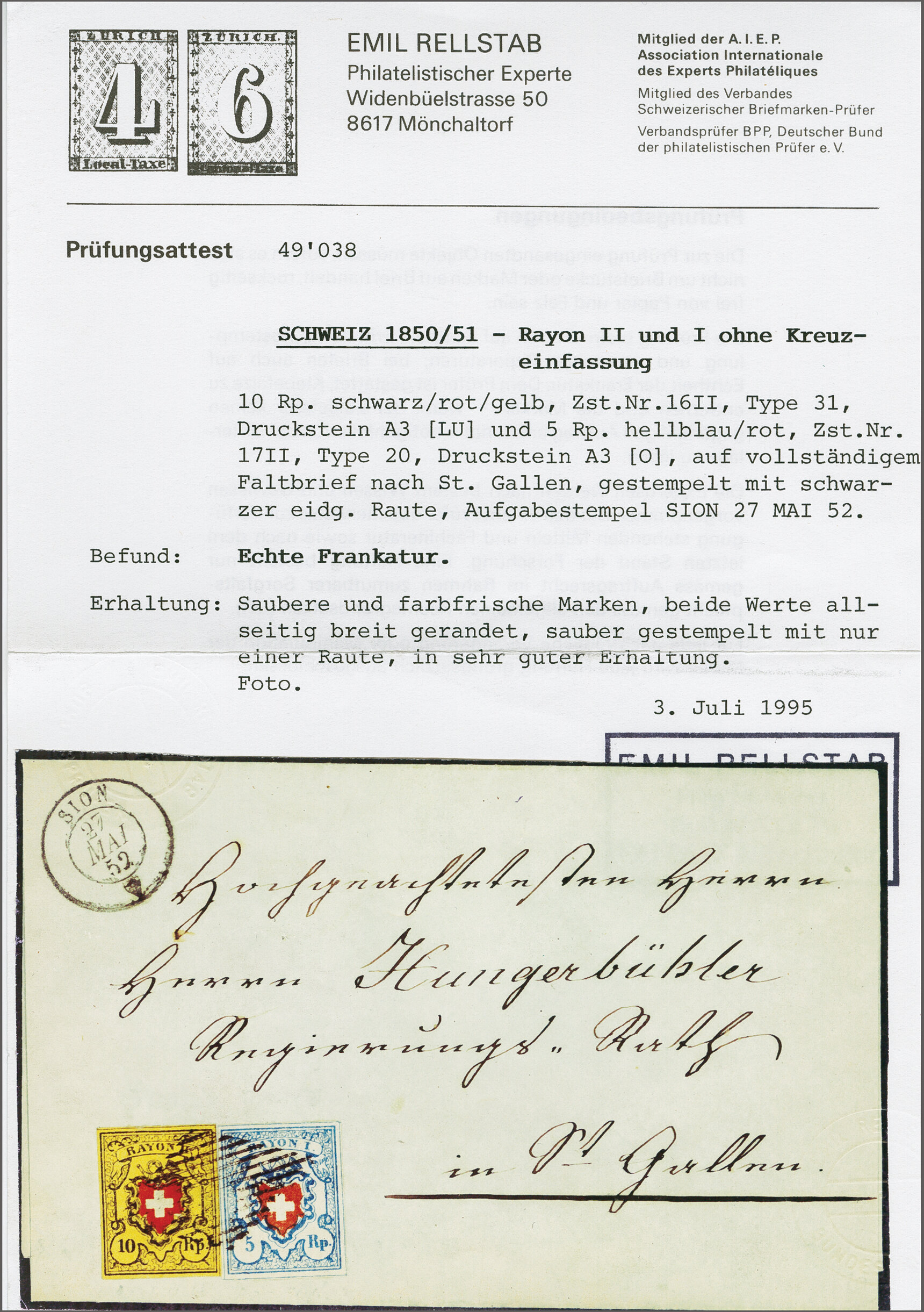 Stein A3: Type 20 o/G in Kombination mit Rayon II, Stein A3, Type 31 l/u, zwei farbfr. und breit- bis überrandige Einzelwerte, zusammen leicht entw. mit schwarzer eidg. Raute und nebenges. kl. Zweikreisstp. "SION 27 MAI 52" in