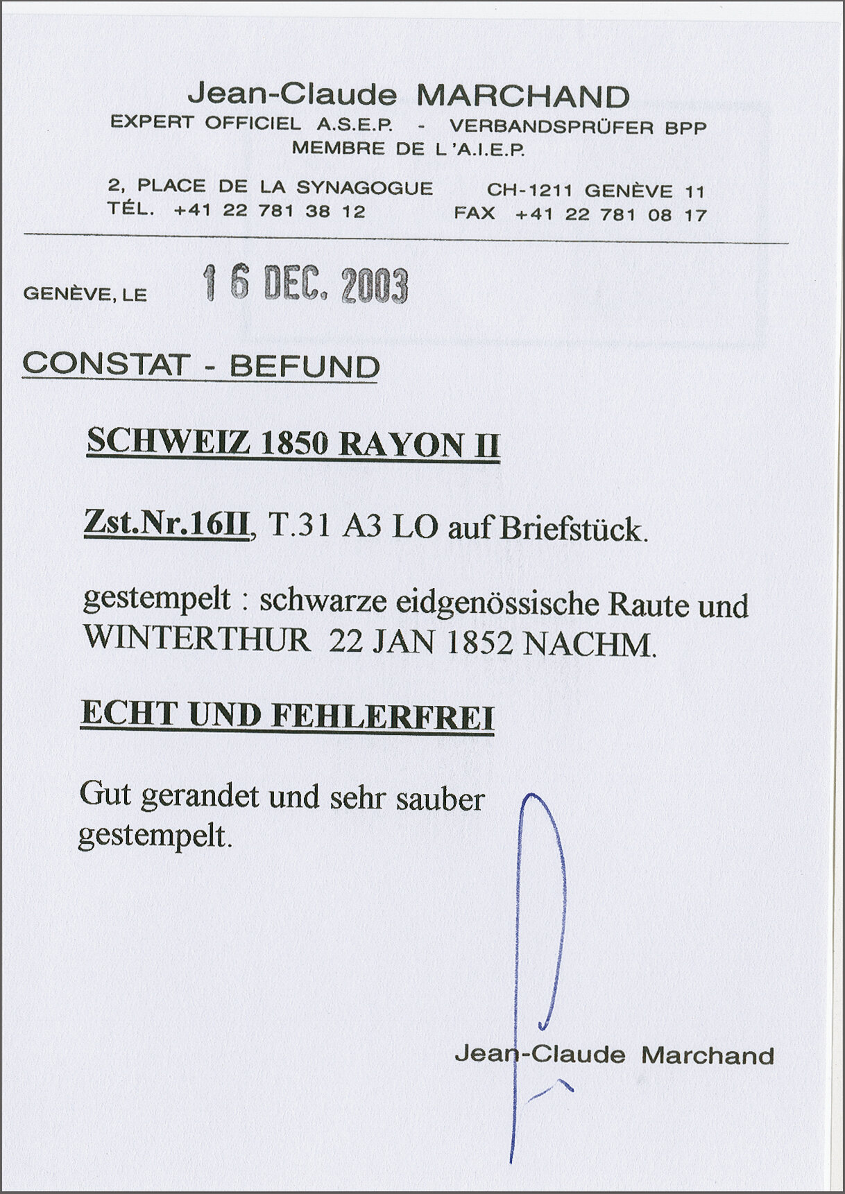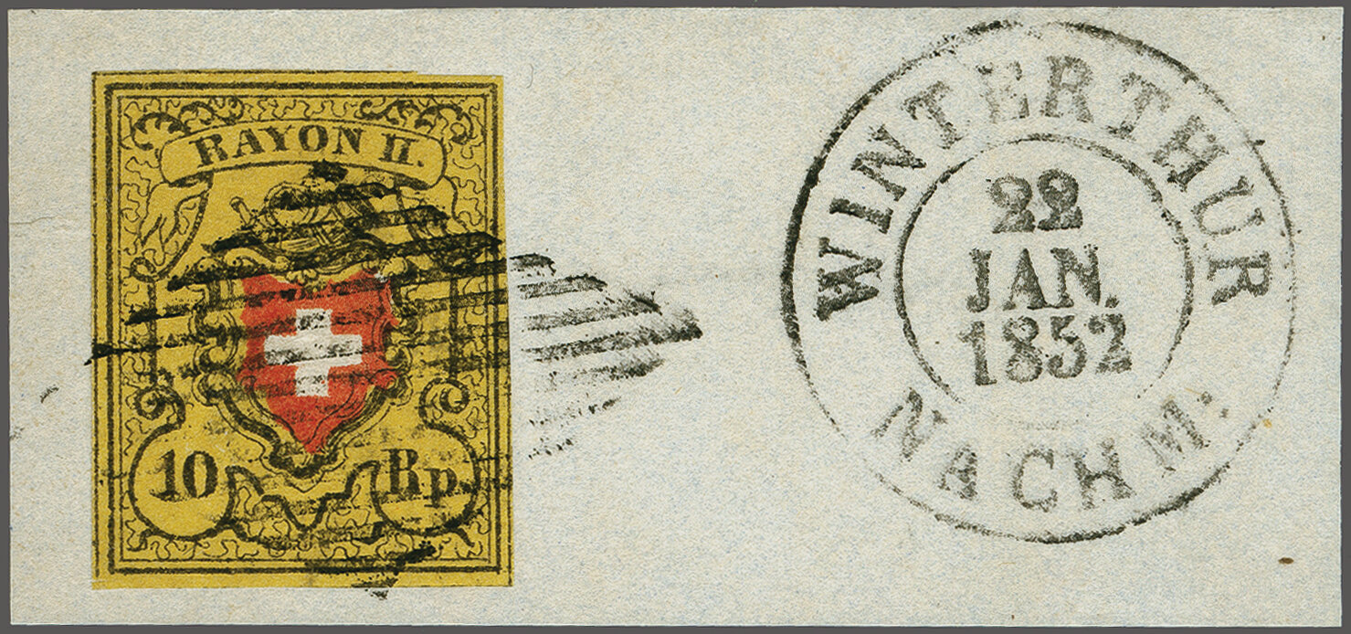 Stein A3: Type 31 l/o, farbfr. und breitrandig, zartklar und übergehend entw. mit schwarzer eidg. Raute und nebenges. kl. Zweikreisstp. "WINTERTHUR 28 JAN. 1852 NACHM:" auf Briefstück. Befund Marchand (2003). SBK=CHF 750+20%.