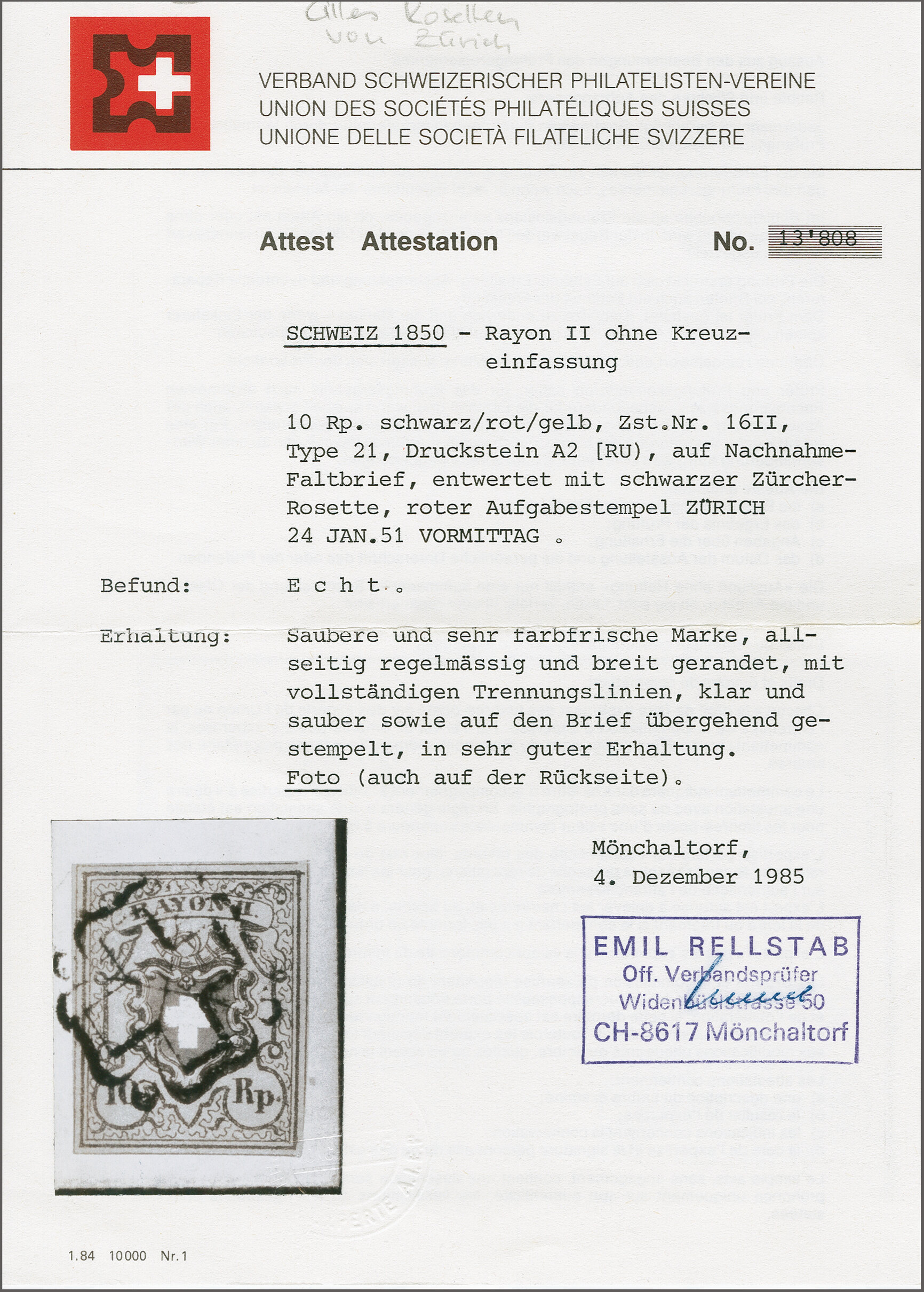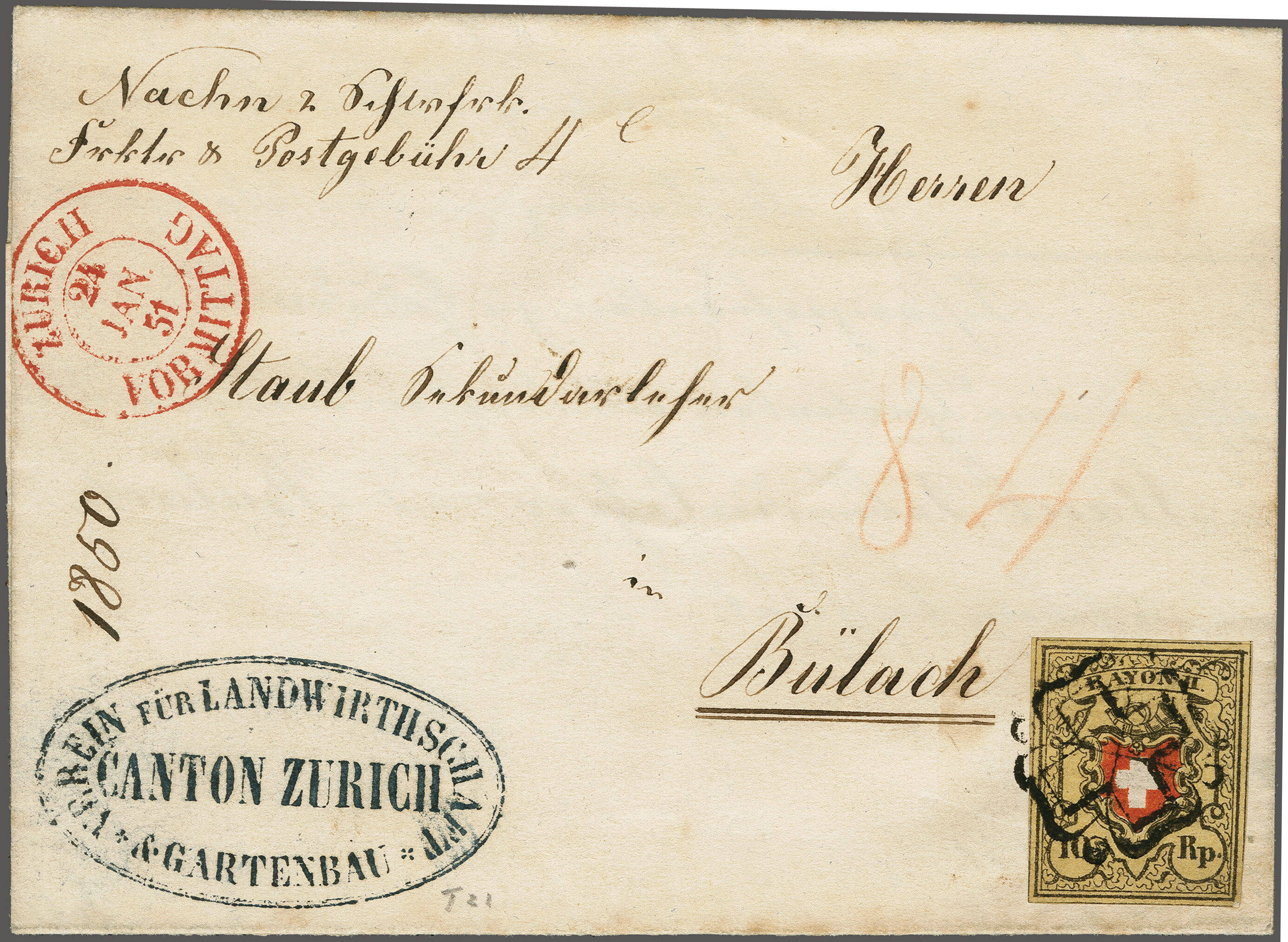 Stein A2: Type 21 r/u, farbfr. und breit- bis überrandig mit kompletten Trennlinien auf allen Seiten, zart und übergehend entw. mit schwarzer Zürcher Rosette (AW 1) mit nebenges. rotem "ZÜRICH 24 JAN 51" auf Quittung als