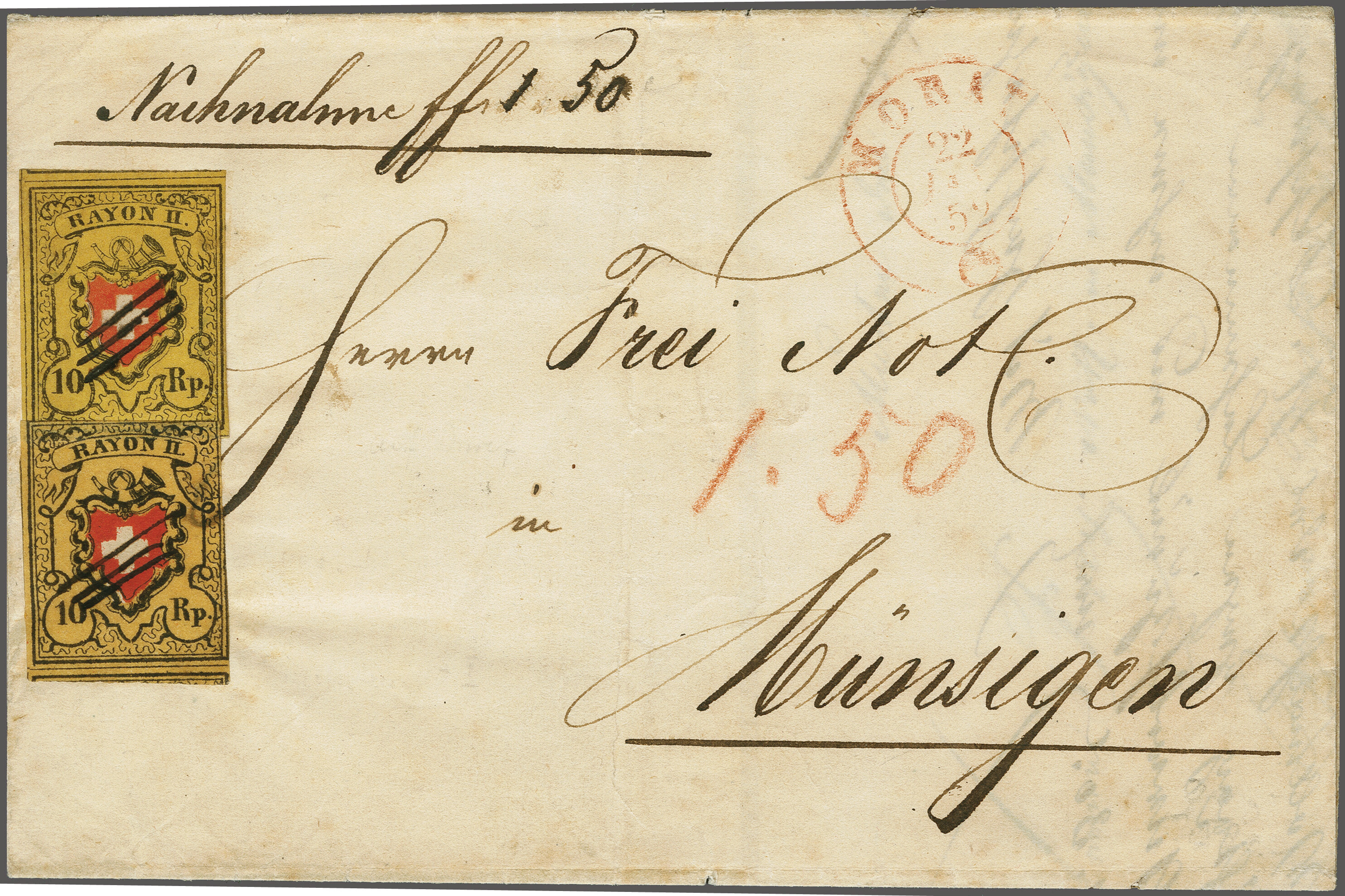 resp. unteren Nebenmarke (Type 30 zweiseitig berührt), je klar, zentrisch und dekorativ entw. mit drei parallelen braunen Tintenstrichen durch das Wappen mit nebenges. kl. Zweikreisstp. "MORAT 22 JAN 52" in rot auf vollständigem Nachnahme-Faltbrief