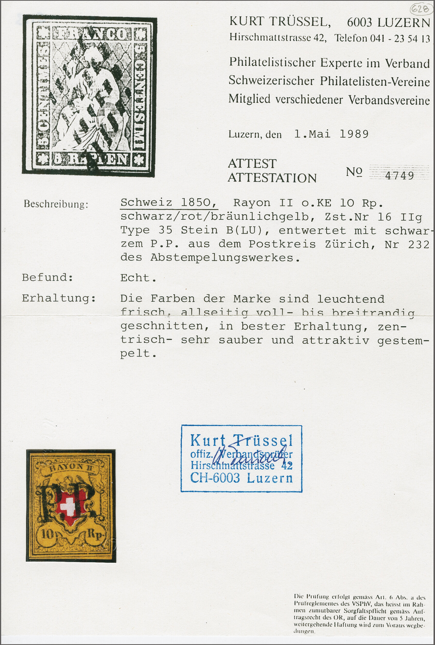 Stein B: Type 35 l/u in der bräunlichgelben Nuance, farbfr. und breit- bis überrandig mit Bogenrand unten, klar, kontrastreich und voll aufgesetzt entw. mit schwarzem "P.P." des Postkreis Zürich (AW 232). Eine ansprechende