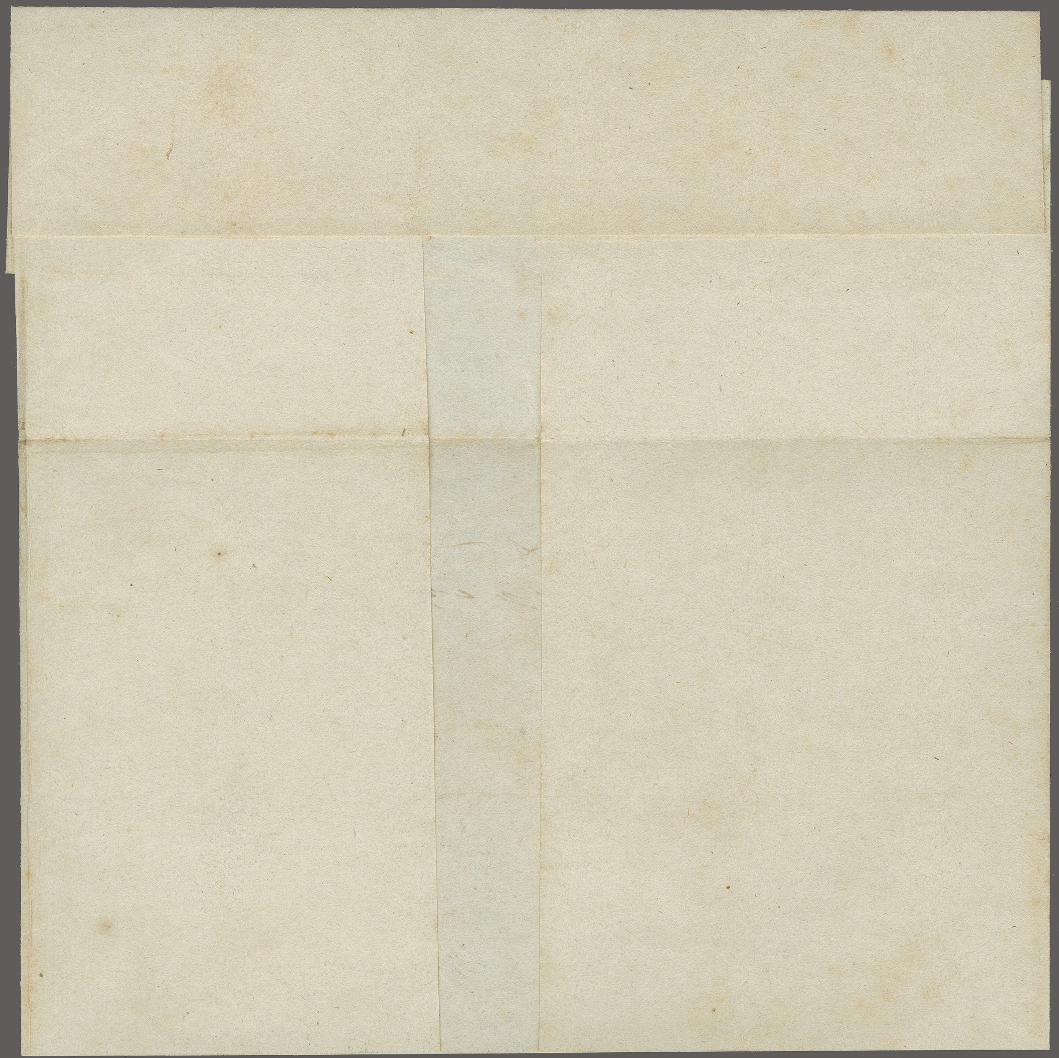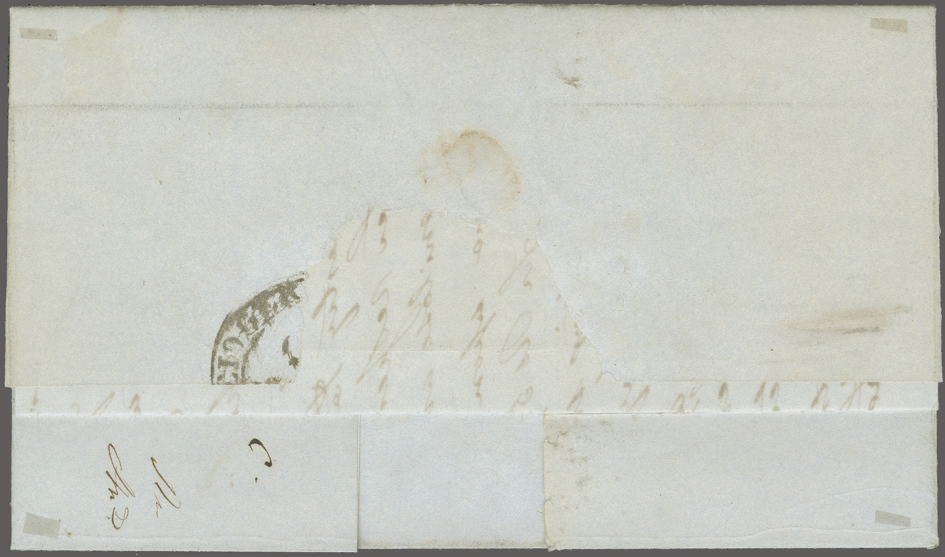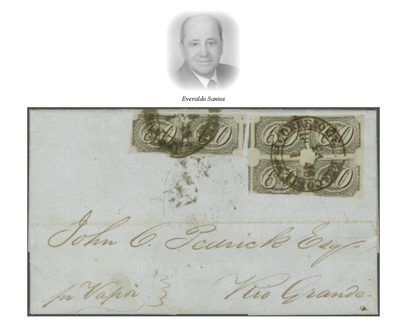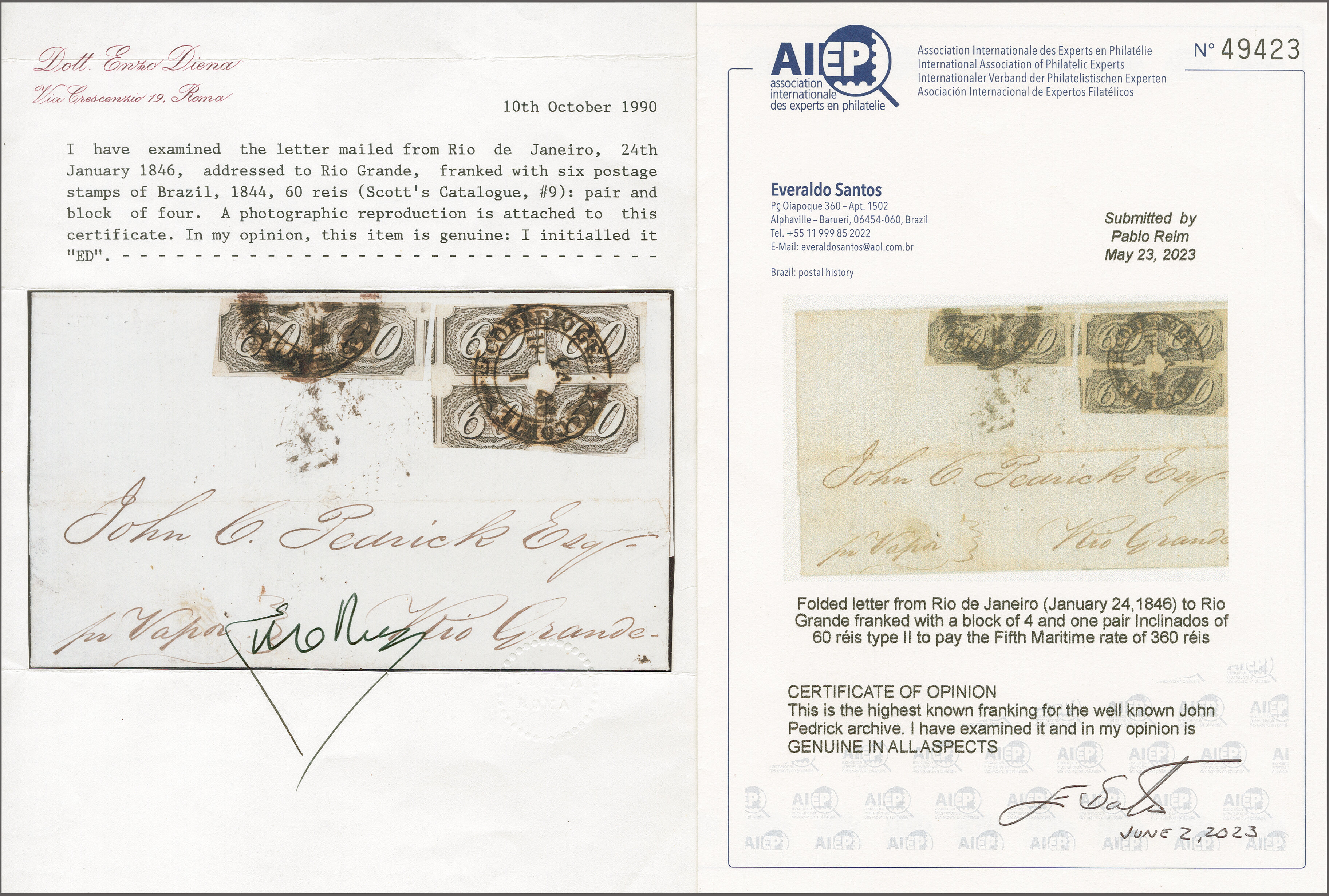 10050 cover/bof imageInclinados 1844/46: 60 r. grey-black on thin greyish paper, Type II, a horizontal pair and a block of four, each with touched to large margins, used on 24 January 1846 entire letter endorsed "per Vapor" and carried at the Maritime quintuple rate to Rio Grande, Pedrick correspondence, each multiple cancelled by "CORREIO GERAL DA CORTE" circular datestamps (Jan 24) in black. Illustrated in "Inclinados" by Bernd Juchert on page 88 and by Walter Taveira on page 374. The highest known franking of the 60 reis, a famous, magnificent and extremely rare entire. Cert. E. Diena (1990), E. Santos (2023). Provenance: Collection Everaldo Santos. (Image 1) (Image 2) (Image 3)