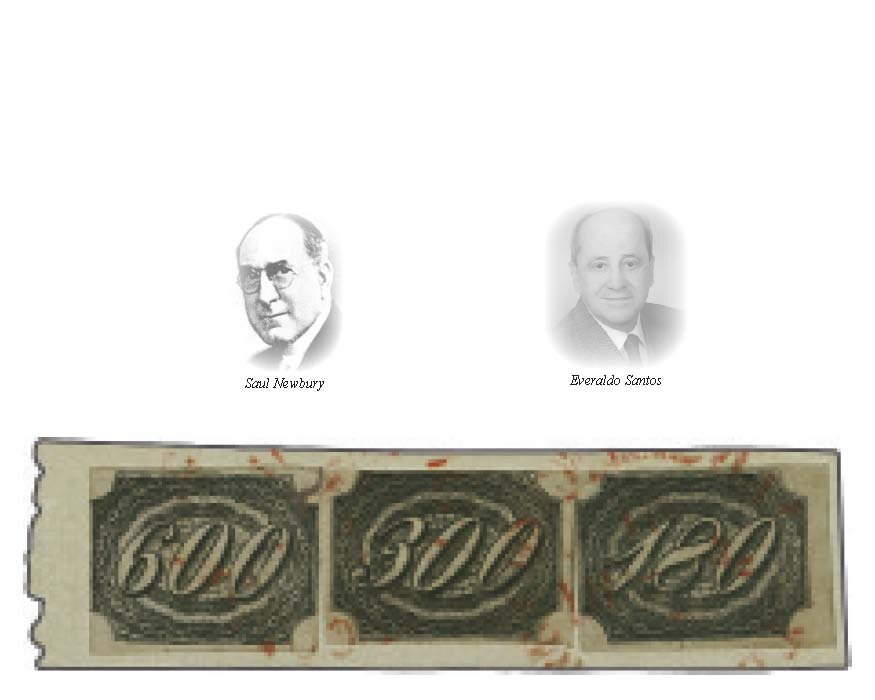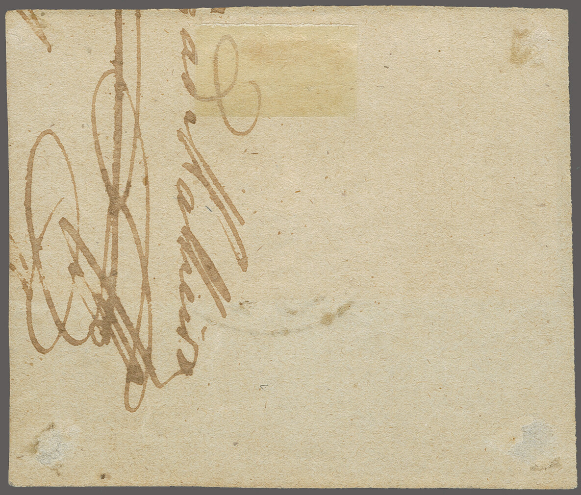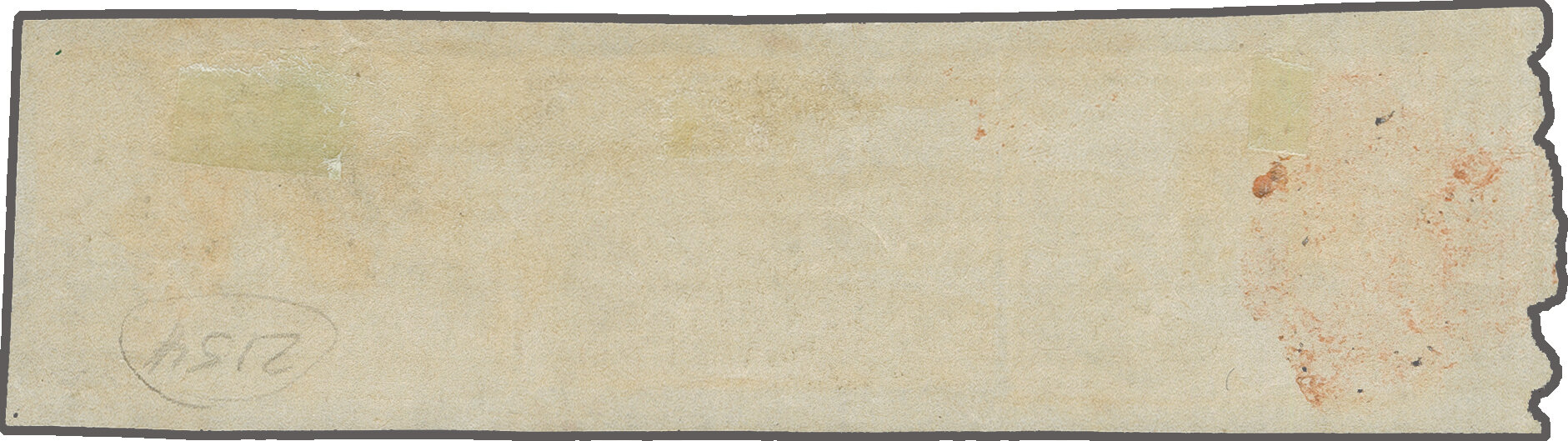 10063 piece imageInclinados 1844/46: 600 r. black, 300 r. black. and 180 r. black, all used together on small piece, each of exceptional fresh colour and mostly with large margins all round, the 180 r. being sheet marginal at right, all cancelled lightly by part strikes of the "Correio Geral da Corte" Rio de Janeiro cds struck in red. The sole known usage of the three high values together and a piece of truly wonderful appearance and of great rarity Scott = $ 6'200+. Provenance: Collection Saul Newbury; Maurinho A. Ferreira, Christe's, New York, 15 Nov 1994, lot 2154, collection Everaldo Santos, Afinsa, Madrid, 14 March 2001, lot 105. (Image 1) (Image 2)
