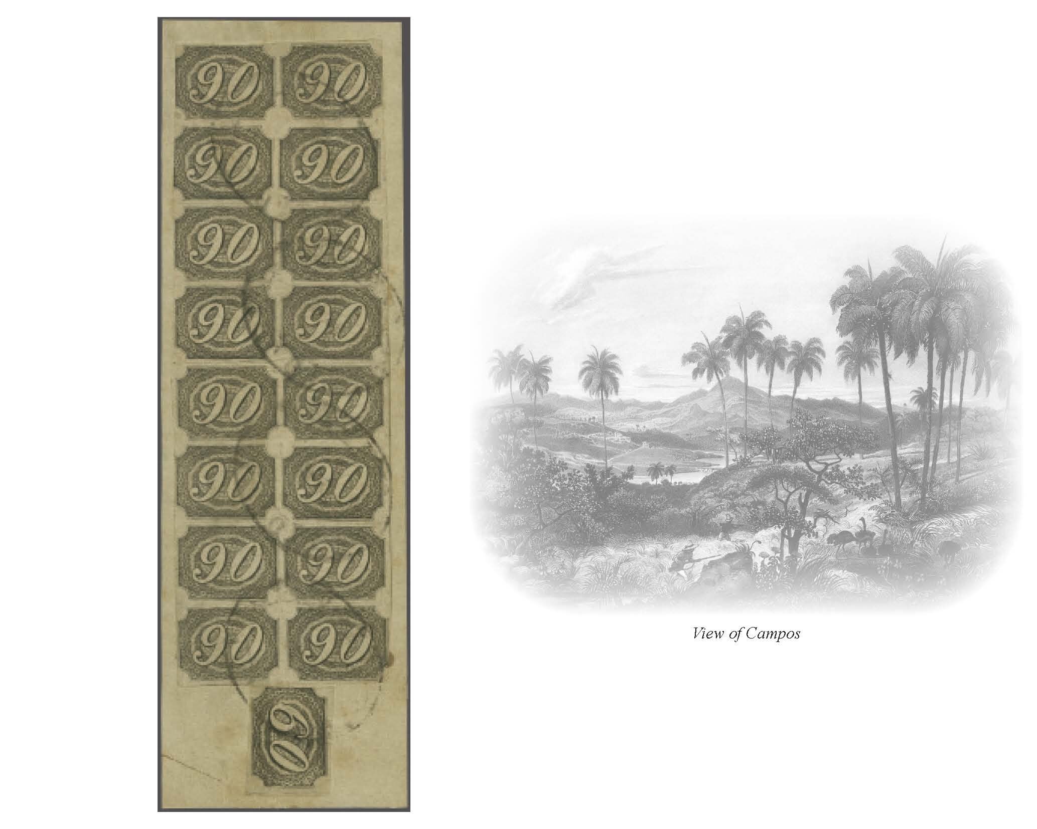 10052 piece/bof imageInclinados 60 r. black on thin greyish paper, a single example (Type II), used on piece with the famous 90 r. black vertical block of sixteen (2 x 8) showing the alternating types I with ten examples and II with six, thus: Type I / II / I / II / I / II / I / I and thus being from the base of the sheet where the consecutive two rows of Type I are located, all tied by oval framed "CIDADE / DE / CAMPOS" handstamps in black (Ayres fig. 1256). The block, probably emanating from a judicial document "Autos de Foro" has been sympathetically cleaned, is of fine colour with close to good margins all round and of spectacular appearance. Illustrated in "Inclinados" by Bernd Juchert on 107 and in Walter Taveira on page 228. A remarkable multiple in the foremost quality for this rarity. Provenance: Stated to have been in the collection of Ferrary de la Renotière; collection Maurinho A. Ferreira, Christie's, New York, 15 Nov 1994, lot 2150; Everaldo Santos, Afinsa, Madrid, March 2001, lot 97. (Image 1) (Image 2)