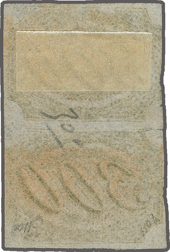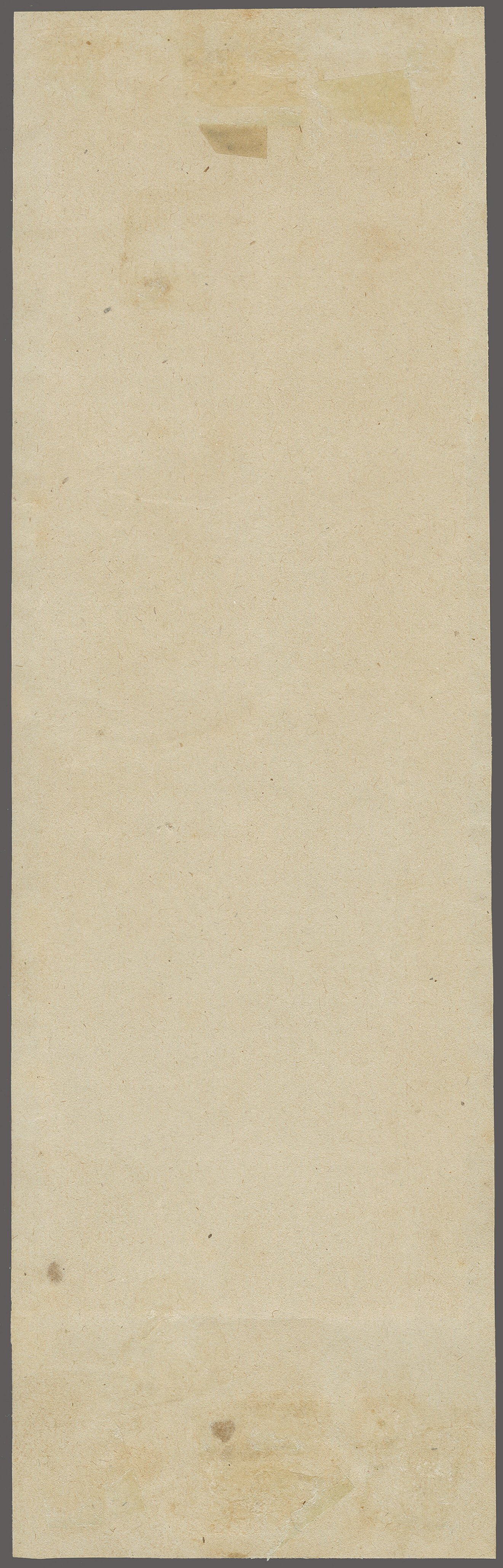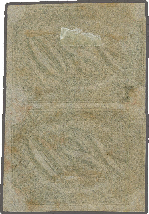 10060 imageInclinados 1844/46: 300 r. black on thin greyish paper, a used vertical pair in a deep shade, large margins on three sides, touched at left and with small closed tear in margin at left, just into design of the lower stamp, cancelled by smudged handstamp in red, probably of Corte. A new find, unlisted in "Inclinados" by Bernd Juchert and also unlisted by Walter Taveira; despite the imperfection of great rarity in a multiple with just four pairs now recorded Scott = $ 4'400+. (Image 1)
